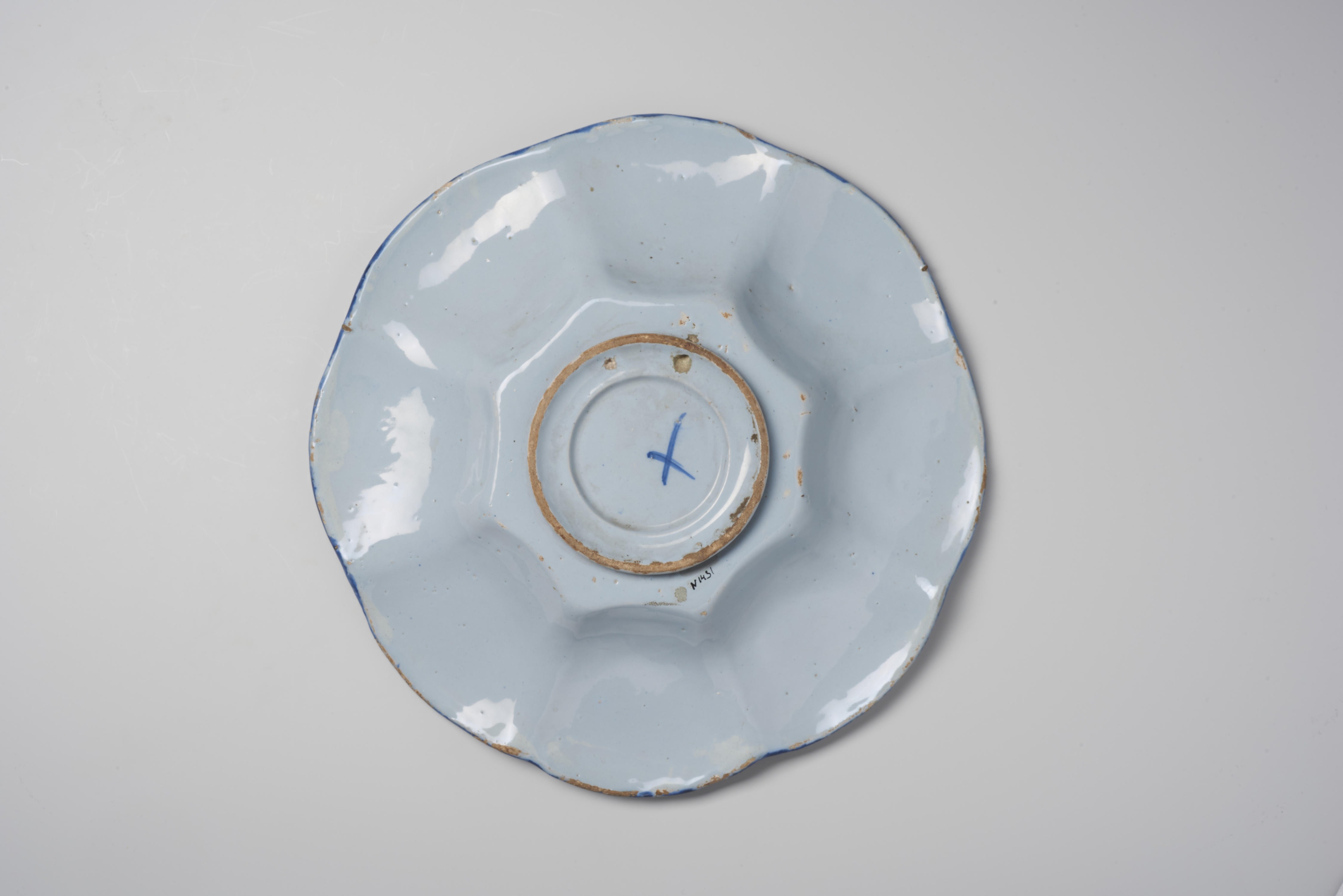 Schotel met een randversiering van afwisselend een bloesemrank en een man in een tuin. Op het middenvlak staat een man in een tuin afgebeeld.