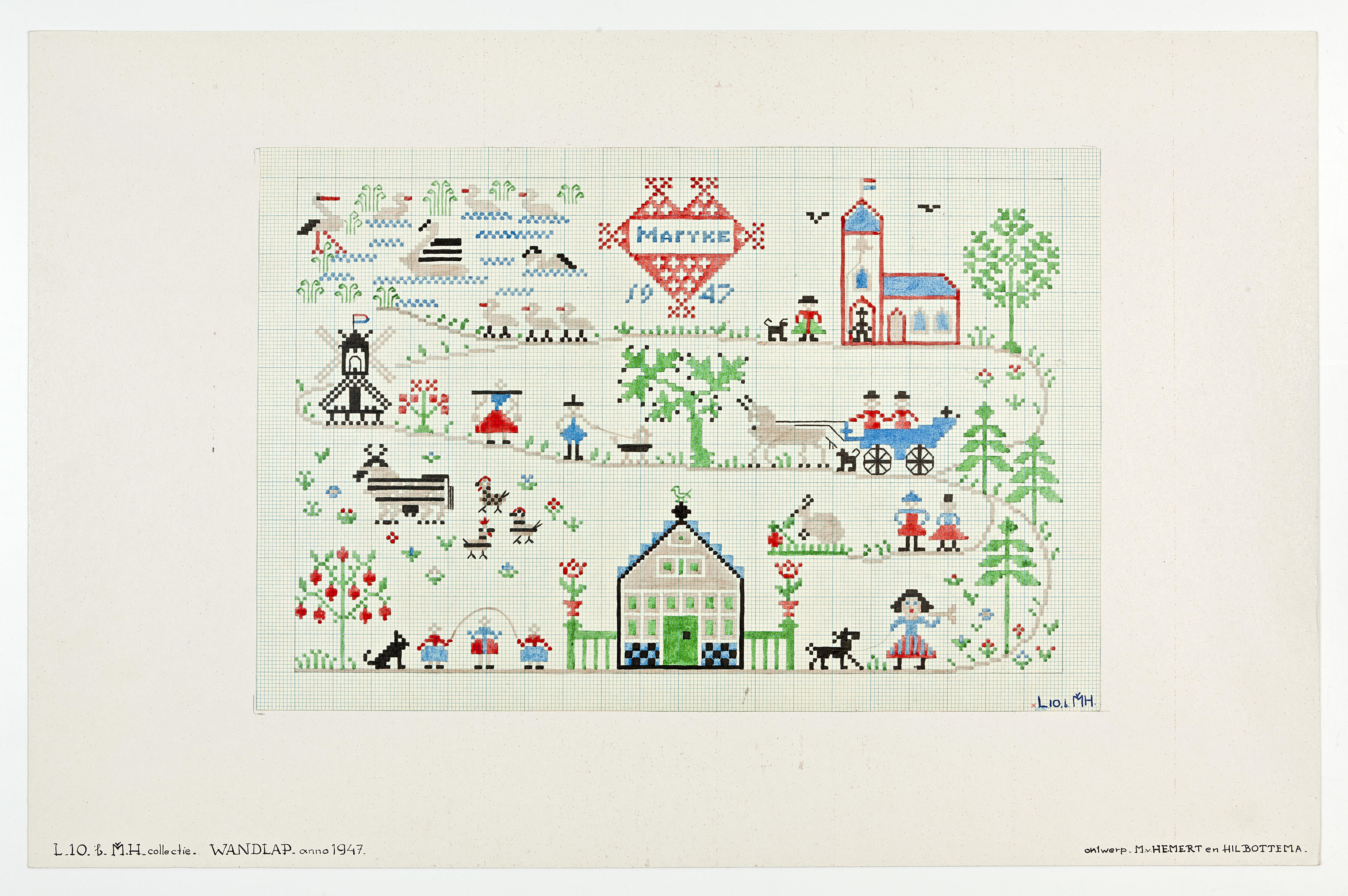 Het kruissteekpatroon is ontworpen door Maria van Hemert en Hil Bottema. Het is met de hand ingekleurd met waterverf op een lichtgroen raster van 10 x 10 ruitjes. Naast de verschillende patroontjes is bovenaan in het midden een hart te zien. In het hart staat de naam 'Marijke' en daarbuiten '1947'. Rechtsonder op het patroon ...
