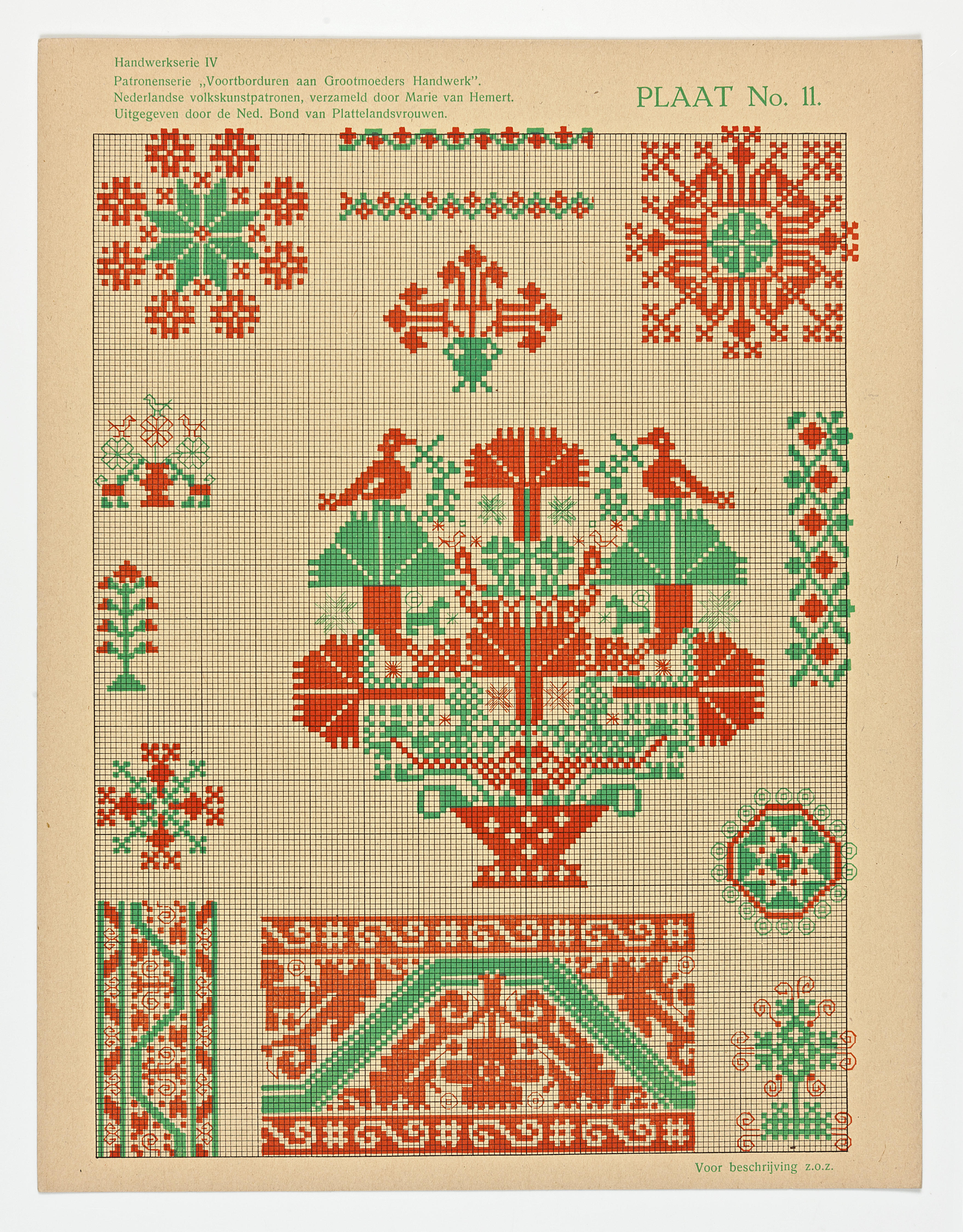 Telpatroon met plaatnummer elf van de patronenserie 'Voortborduren aan Grootmoeders handwerk' uit de handwerkserie IV. De Nederlandse volkskunstpatronen zijn verzameld door Maria van Hemert. Ze zijn uitgegeven door de Nederlandse Bond van Plattelandsvrouwen. De grote figuur in het midden, een bloempot met vogels en leeuwtjes, is overgenomen van een merklap uit 1785. Die merklap is ...