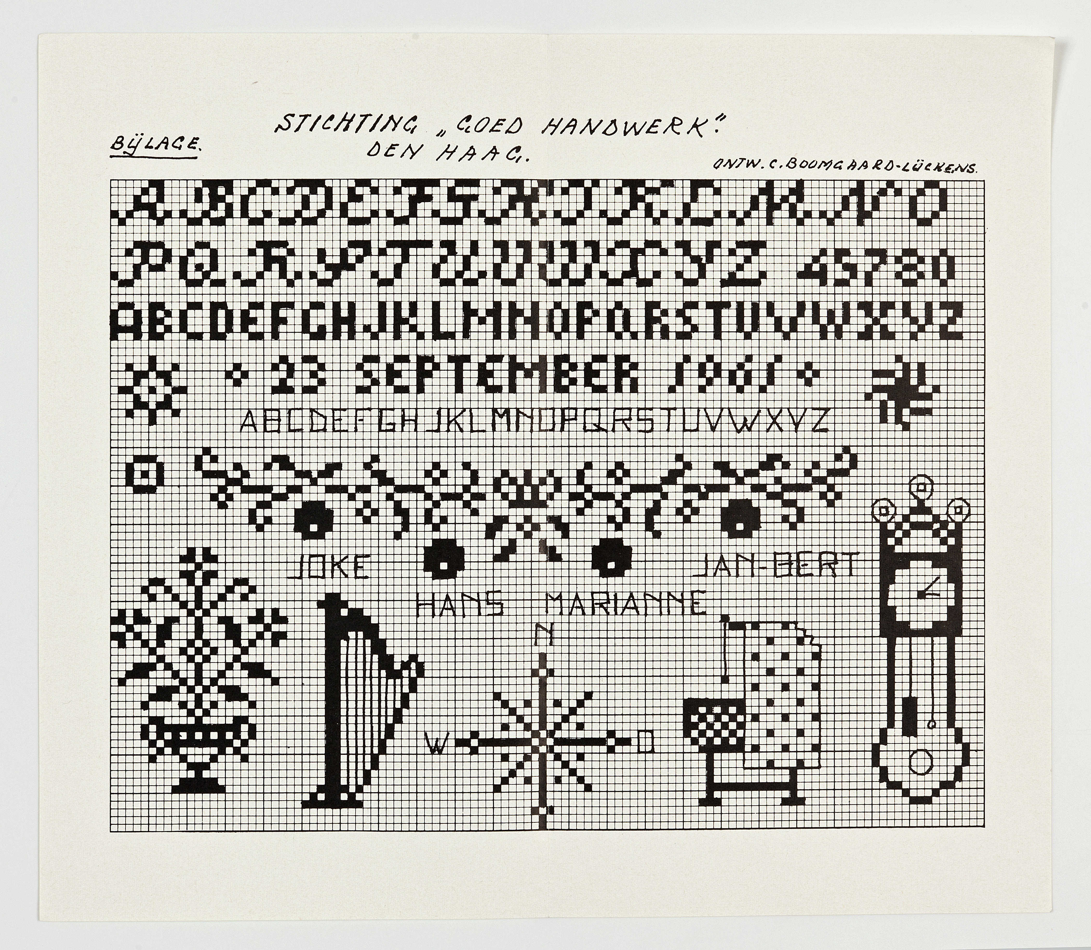 Het gedrukte telpatroon is voor een merk- of letterlapje. Het was een bijlage van de stichting 'Goed Handwerk' in Den Haag. Het ontwerp is gemaakt door C. Boomgaard-Luckens.