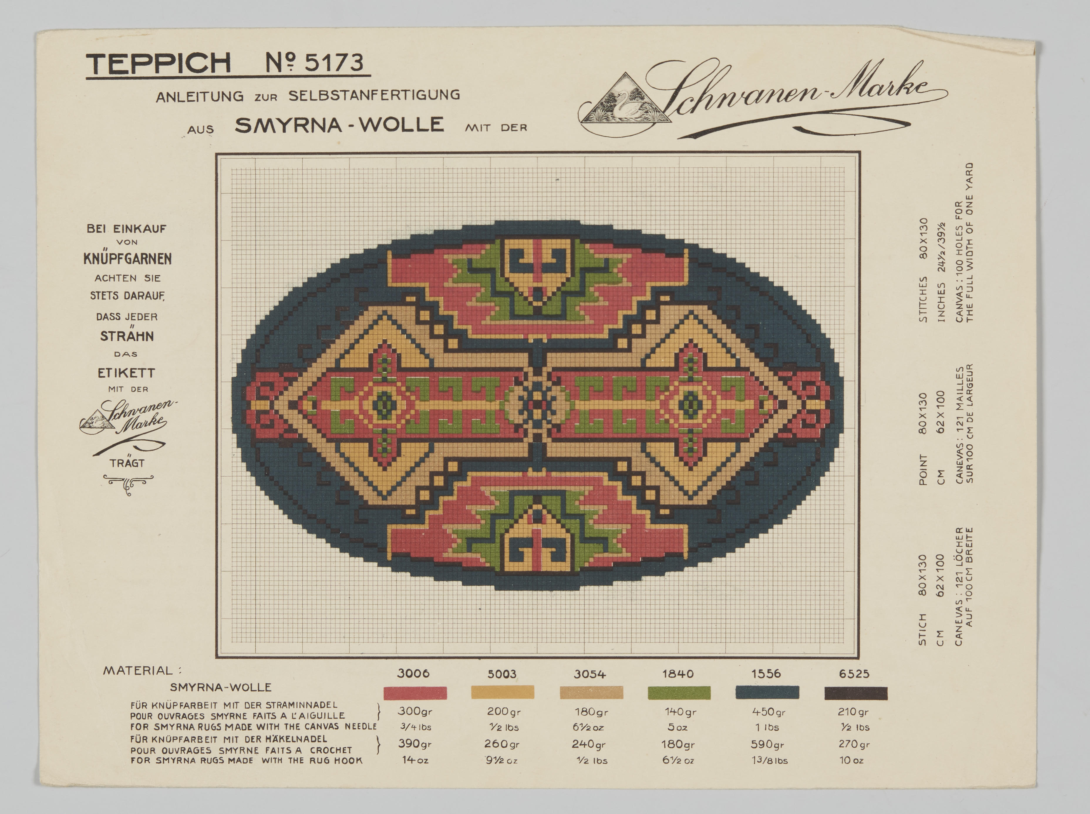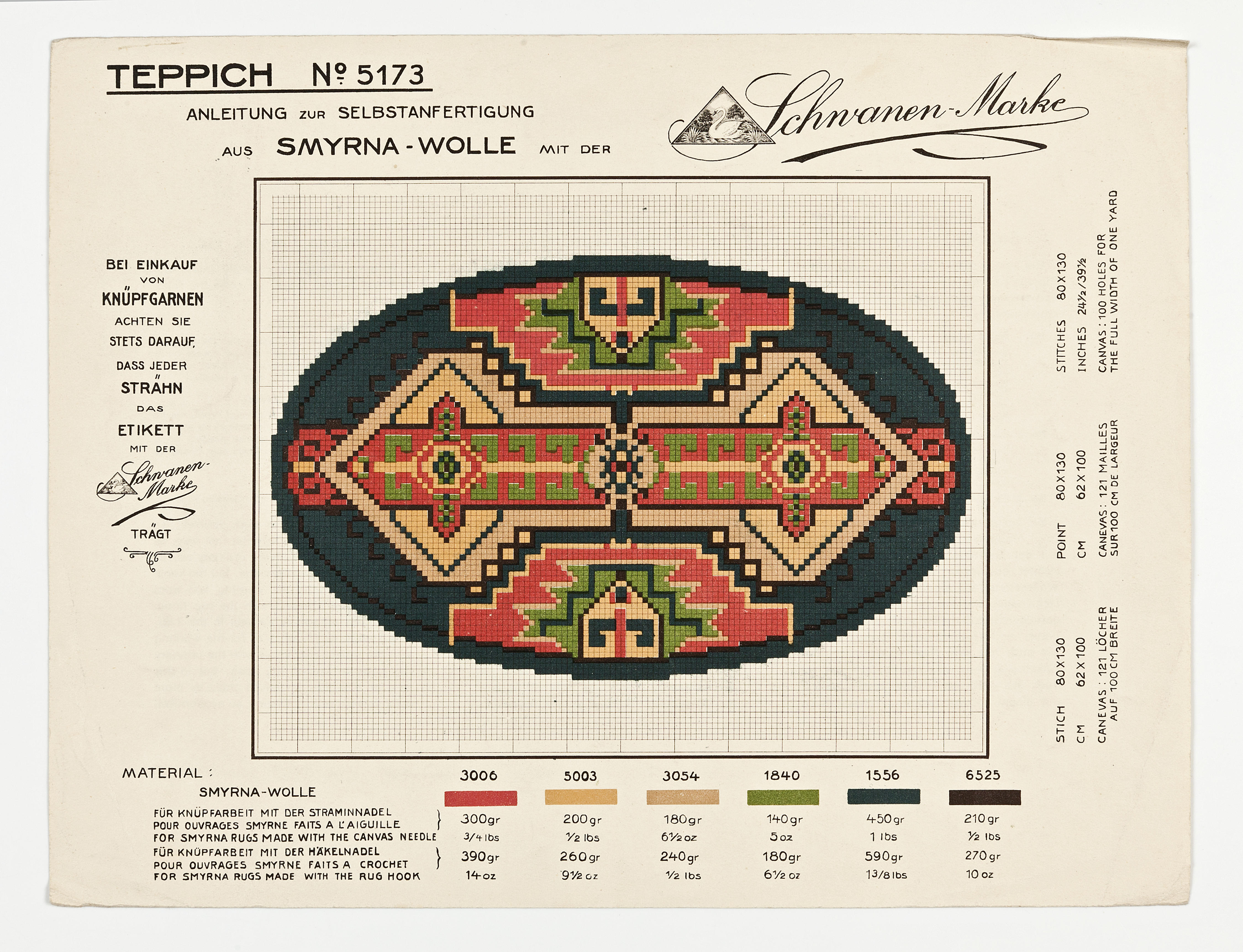 Telpatroon, gebruikt voor het zelf knopen van een smyrnakleed. Het werd geleverd bij de aankoop van speciale wollen smyrnagaren met het etiket 'Schwanen Marke'. In de marge onderaan staan de kleurnummers met bijbehorende kleurstaaltjes en hoeveelheden in verschillende talen. Rechts in de marge staan de hoeveelheid steken, de afmeting en de grootte van het te ...