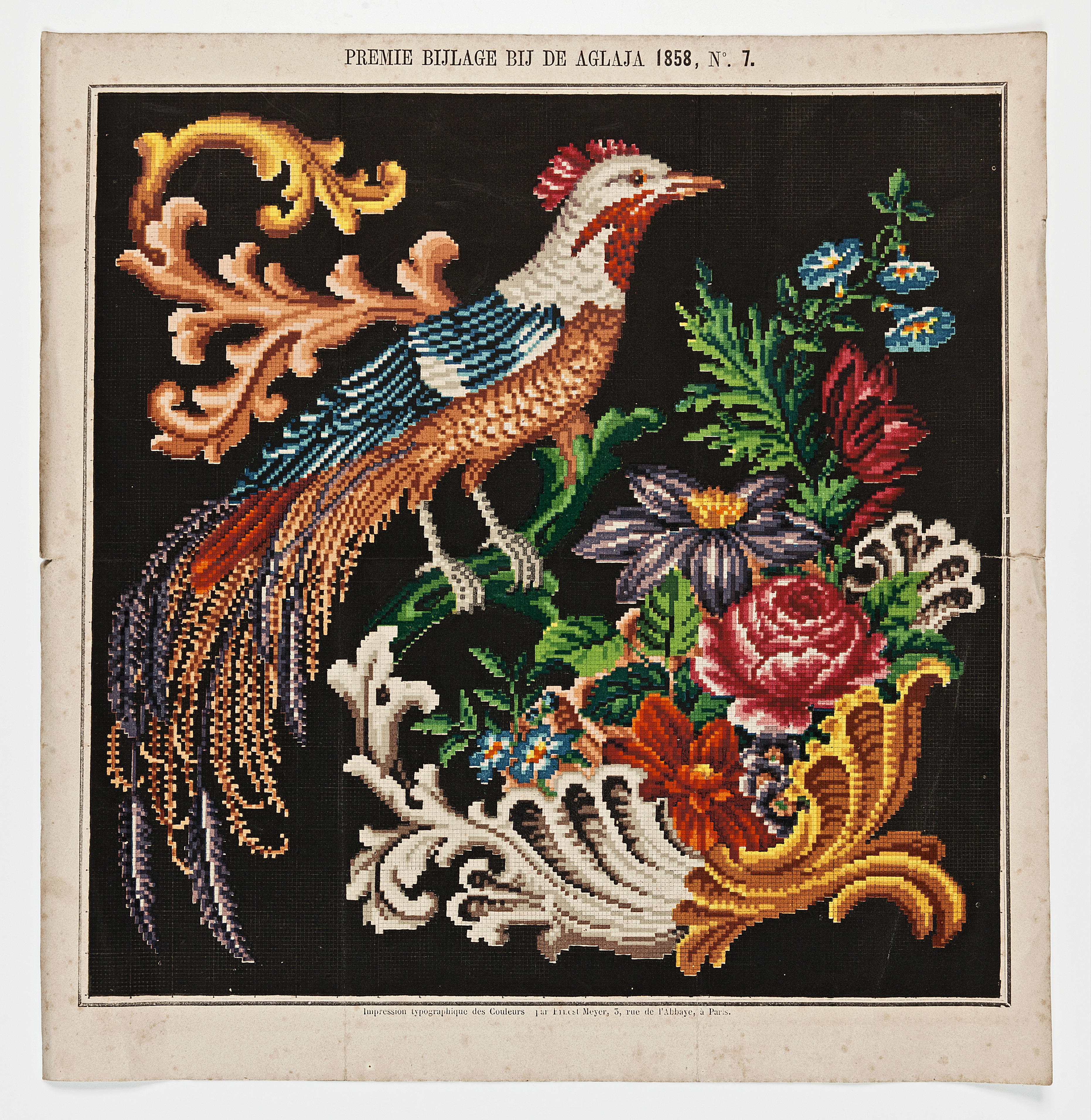 Op de afbeelding is een borduurpatroon te zien uit de bijlage van de 'Aglaja' no. 7 uit 1858. Aglaja is de naam van een van de drie gratiën uit de Griekse mythologie die model stonden voor schoonheid, bevalligheid en genegenheid. Uitgever Kruseman begon in 1848 met het uitgeven van de Aglaja met het 'Maandboekje voor ...