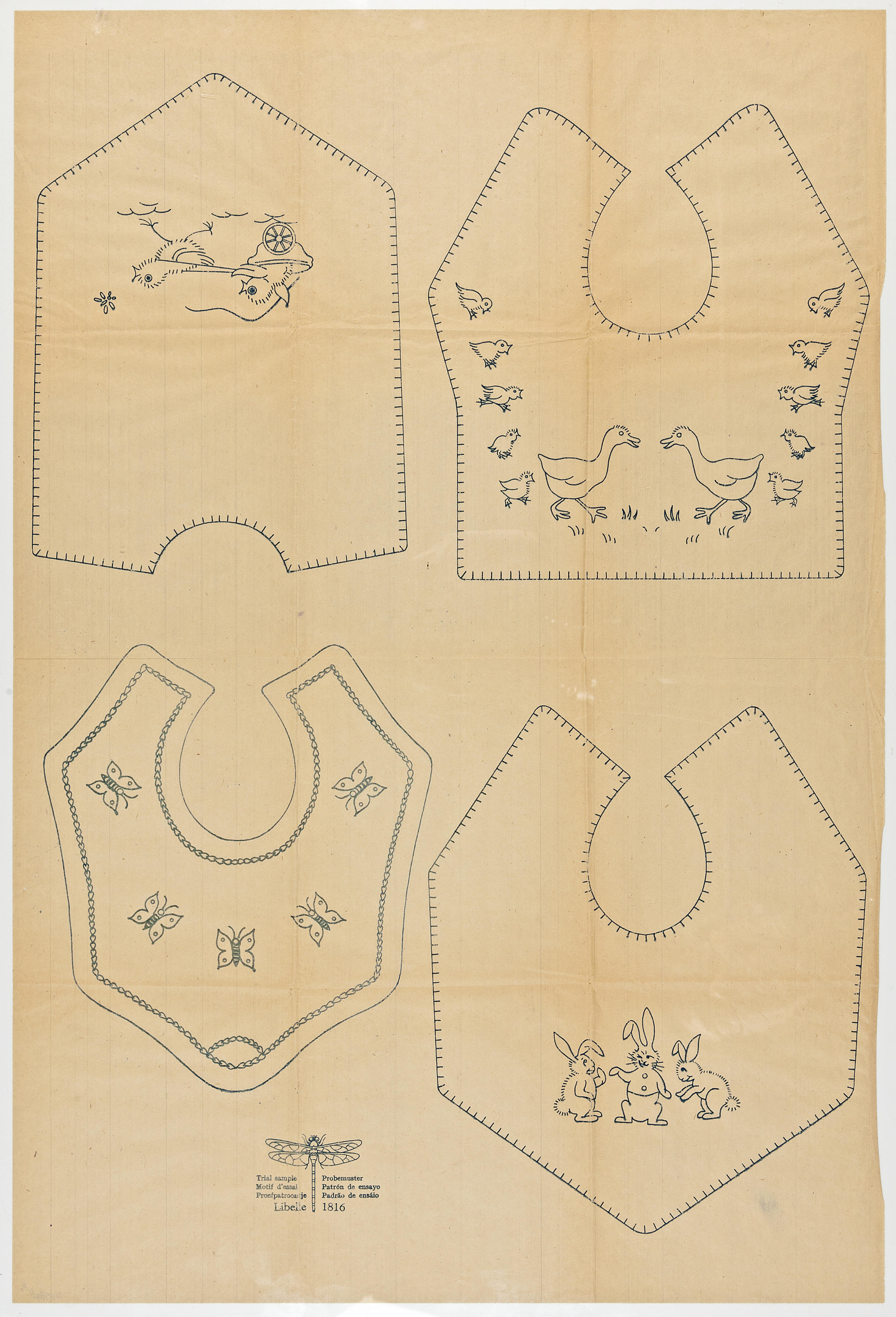 Proefpatronen voor vier slabben met verschillende diermotieven, uitgebracht door Libelle.