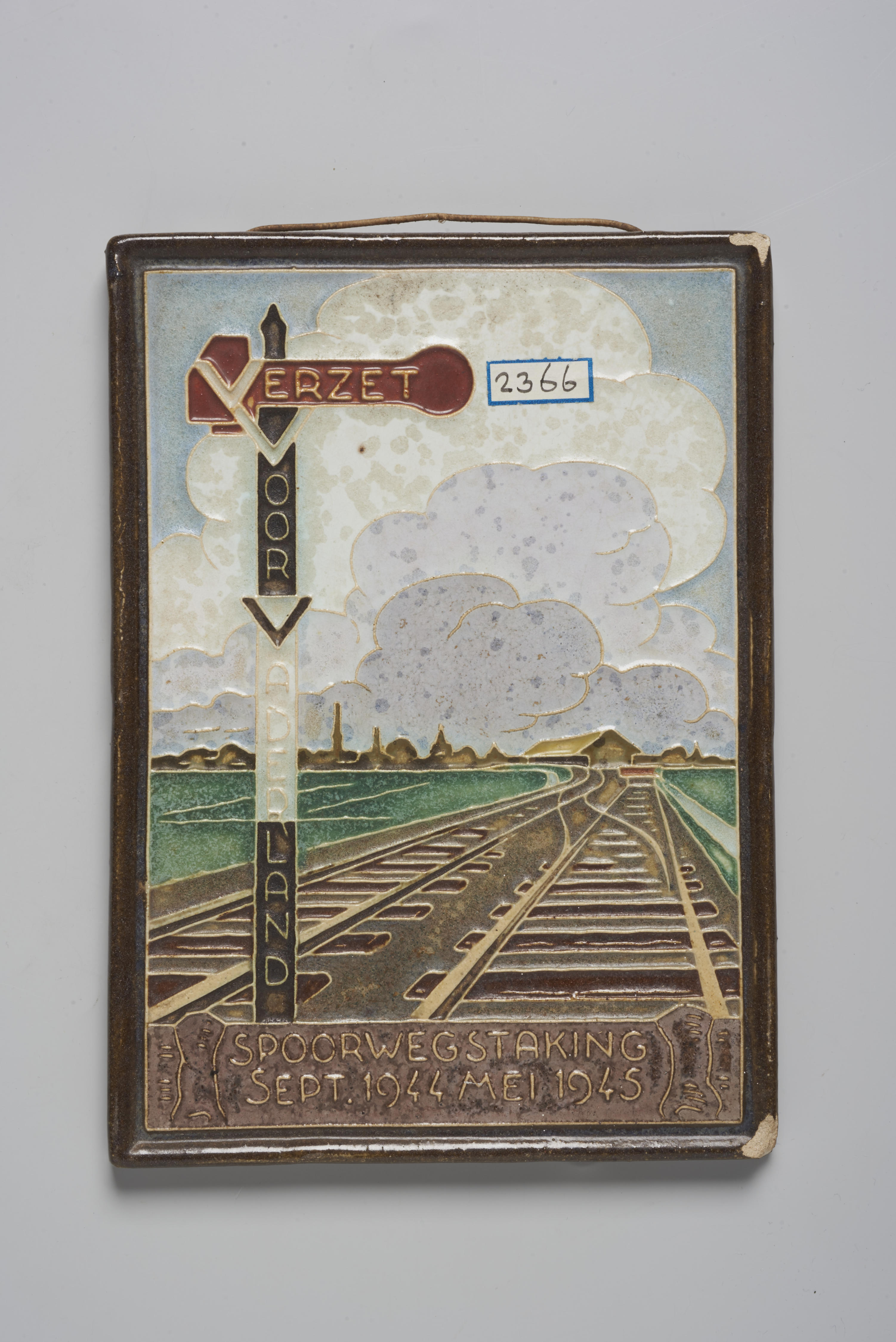 Gedenktegel met een voorstelling van een spoor met een stad op de achtergrond. Naast het spoor staat een seinpaal met daarop de tekst: 'Verzet Voor Vaderland'. Het onderschrift luidt: 'Spoorwegstaking Sept. 1944 Mei 1945'.