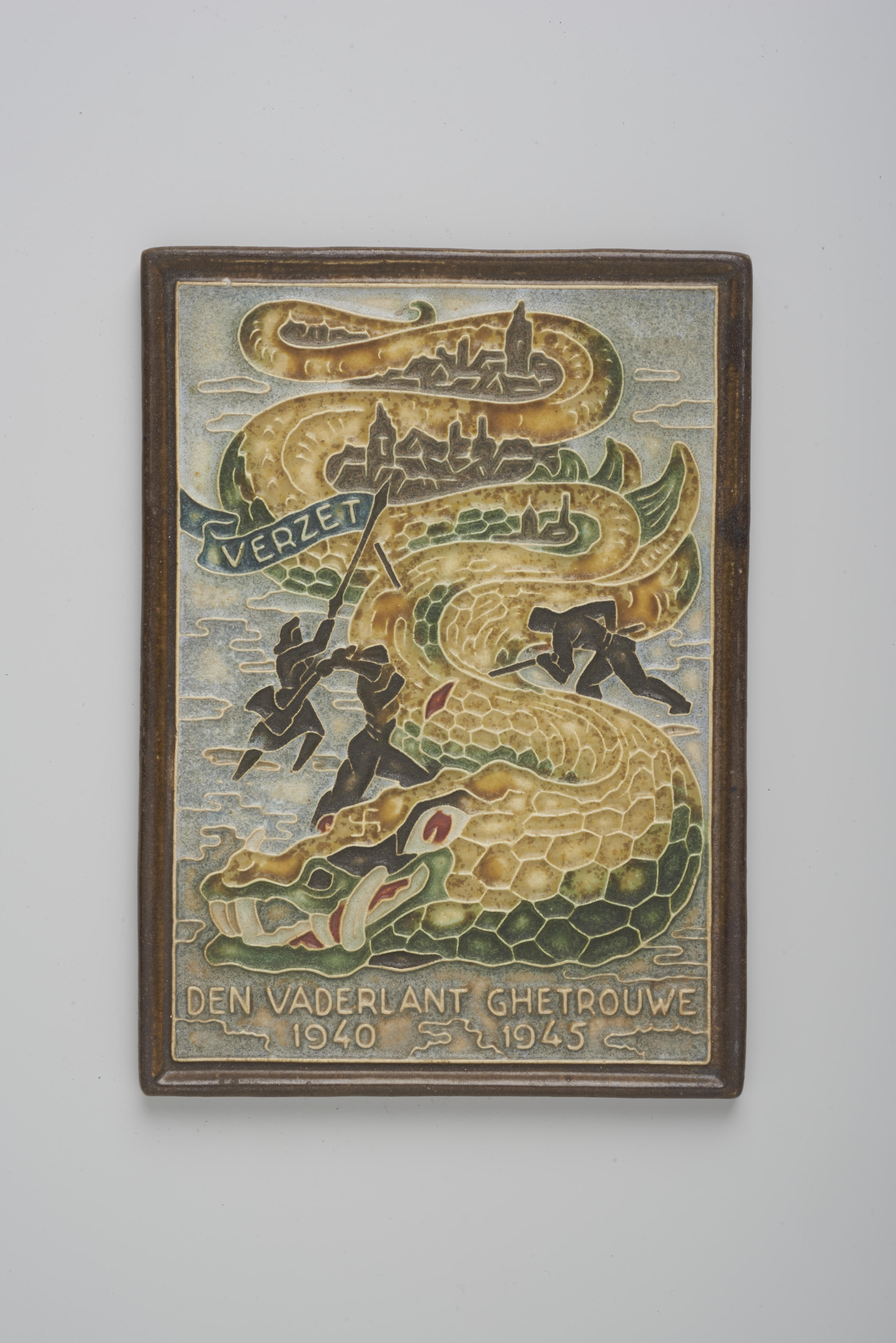 Gedenktegel met een afbeelding van een draak die rondom steden ligt. De draak wordt bevochten door mensen met wapens. Eén van deze mensen draagt een vlag met de tekst 'Verzet' erop. Het onderschrift luidt: 'Den Vaderlant ghetrouwe 1940-1945'.