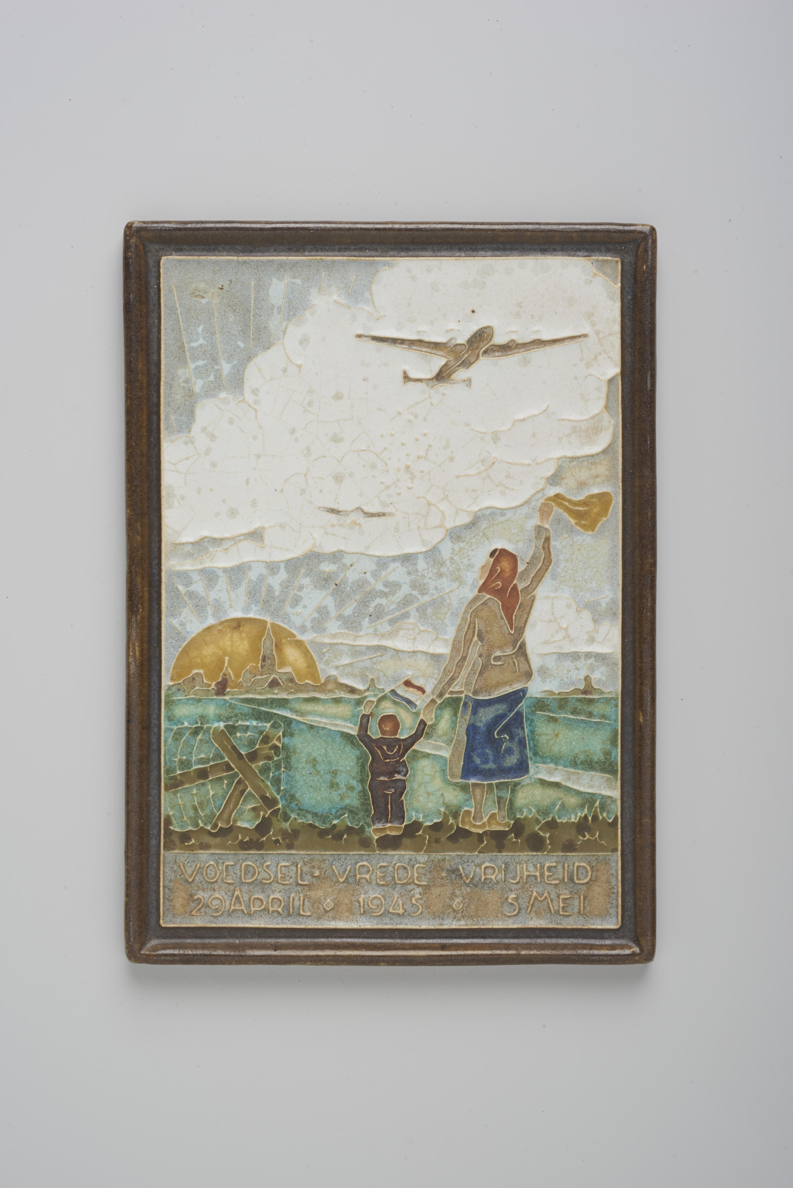 Gedenktegel met een voorstelling van een vrouw en kind die naar een vliegtuig zwaaien. Op de achtergrond is een dorpsgezicht met een opkomende zon te zien. Het onderschrift luidt: 'Voedsel - Vrede - Vrijheid 29 April - 1945 - 5 Mei'.