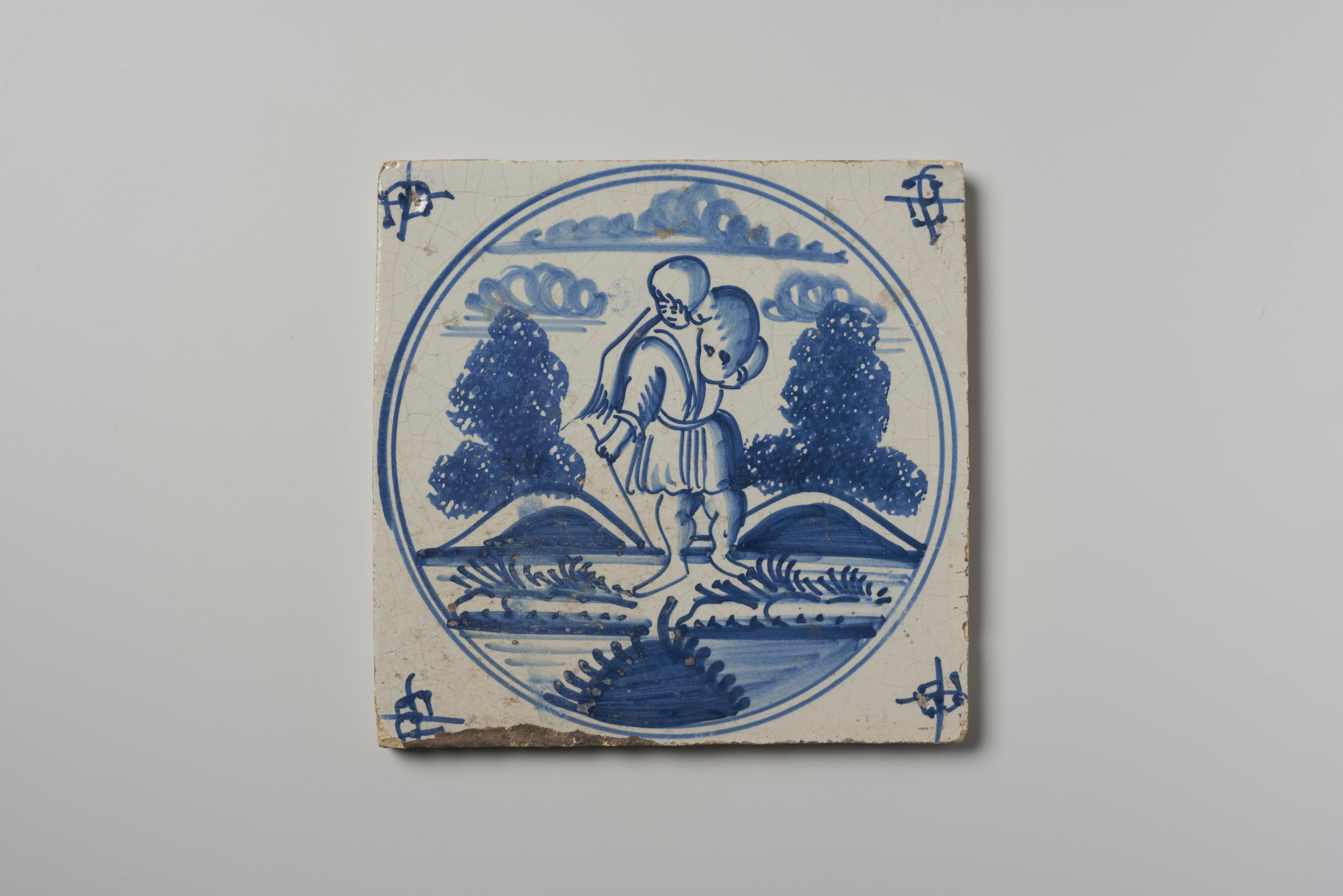 Historie met wolken in een cirkel (Tobias met de vis); blauw; hoekmotief: spin. Dit type tegel kenmerkt zich door een eenvoudige voorstelling tussen twee heuveltjes met gesponste boompjes en een spin als hoekmotief.