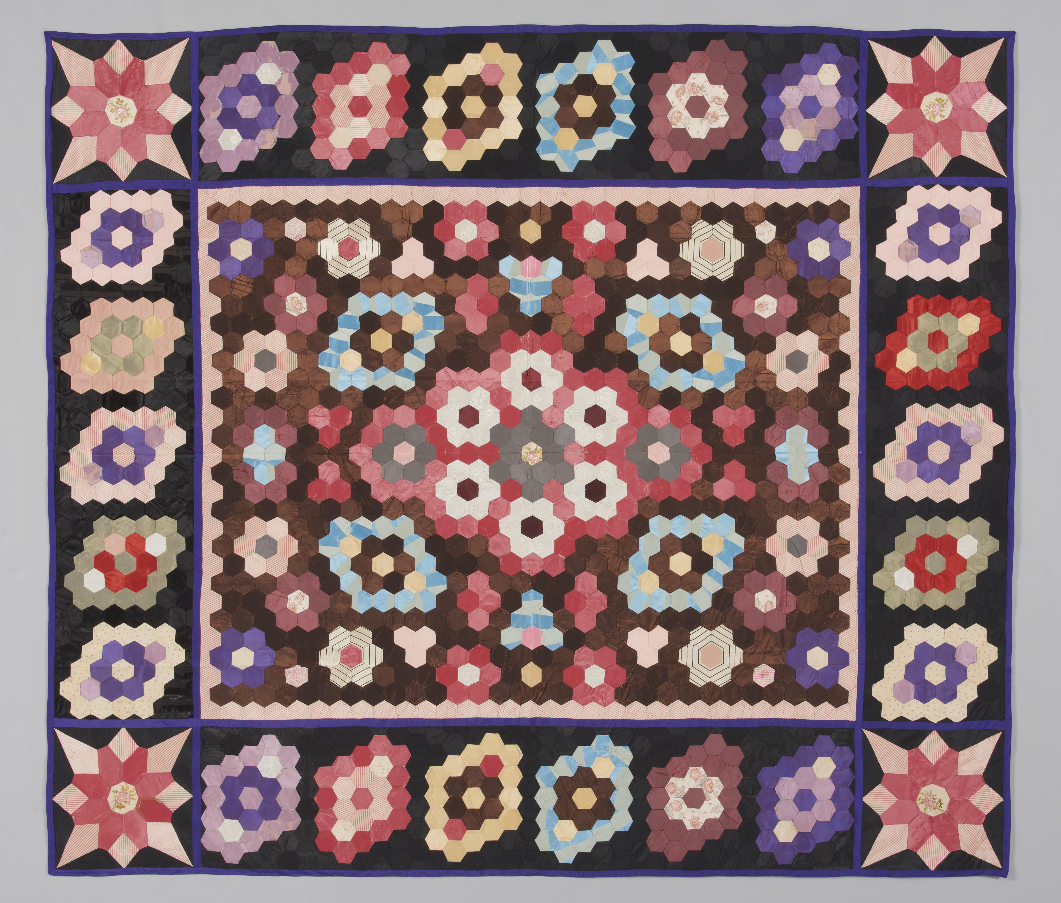 Lappendeken met aan de bovenzijde een patroon van voornamelijk effen zijden zeshoekjes. Deze circa vier centimeter grote zeshoekjes zijn tot een symmetrisch patroon samengesteld. Het middenveld heeft een groot motief van rood, grijs en wit in het midden. Daaromheen zijn rozetten in verschillende samenstellingen op een effen zwarte ondergrond geplaatst. Het middenveld wordt omsloten door ...