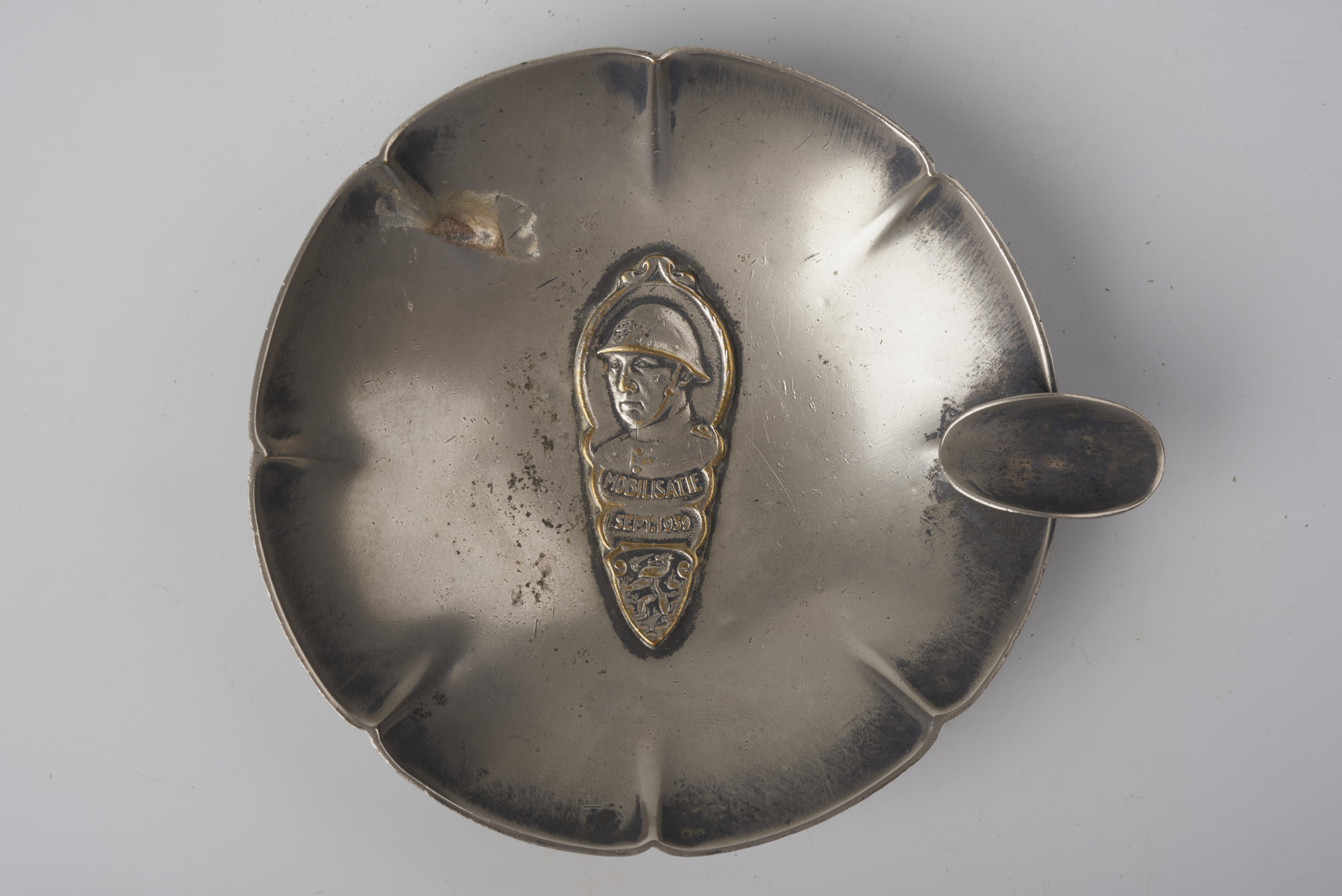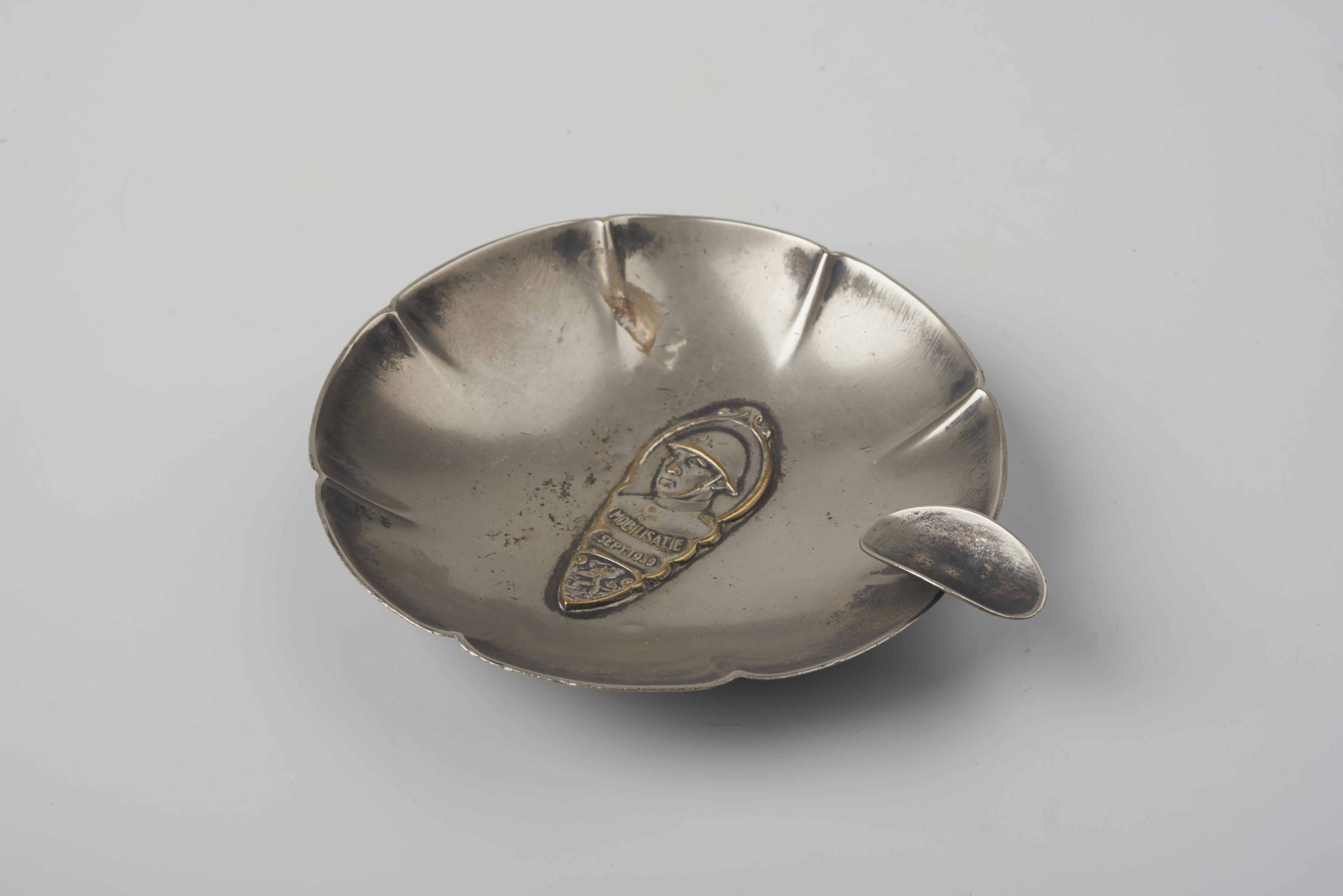 Zilveren asbak met een afbeelding van een soldaat en de Nederlandse leeuw. Het opschrift luidt: 'Mobilisatie sept. 1939'.