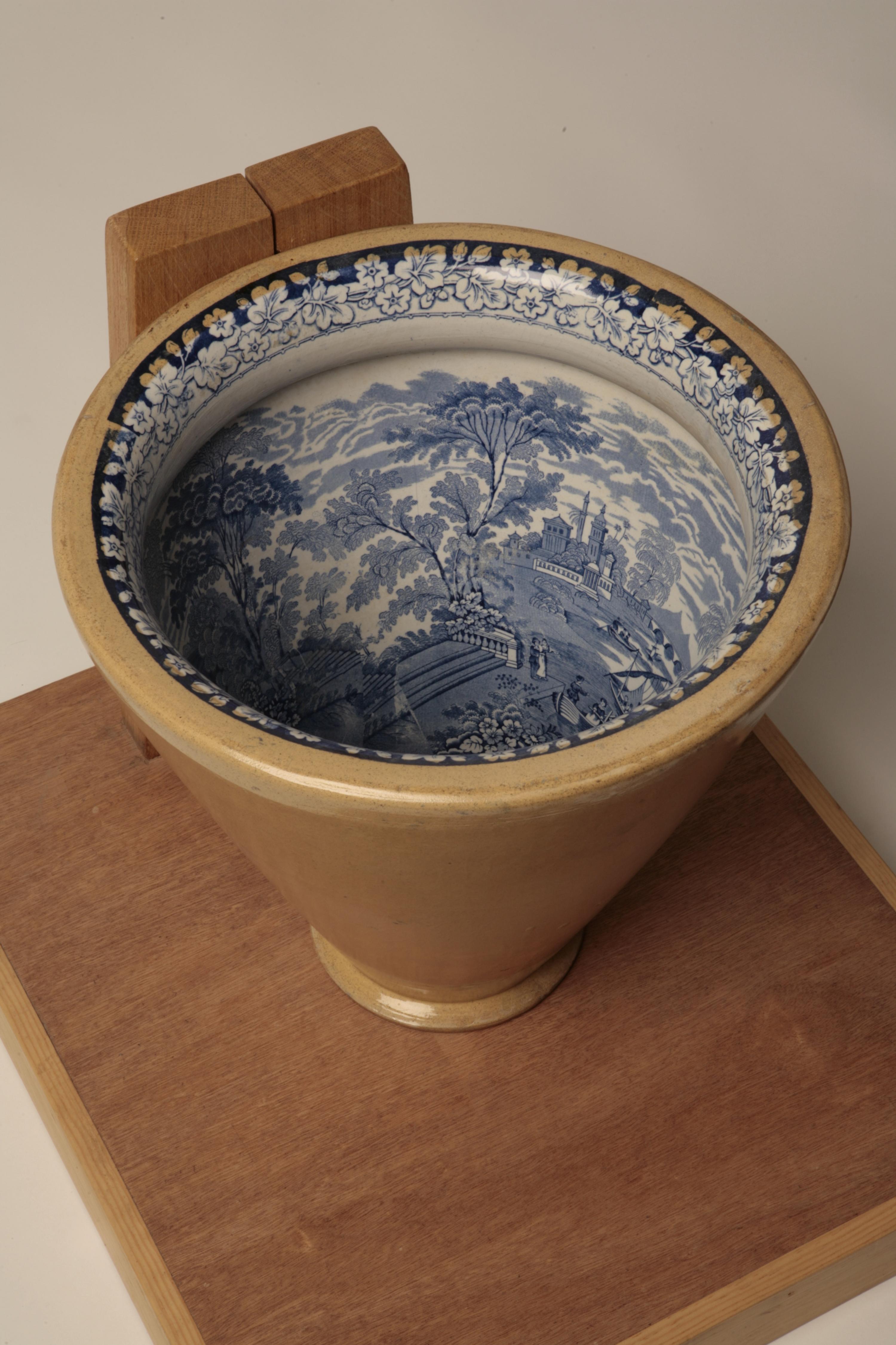 Zogenoemd Hopper-closet van Engels aardewerk met aan de binnenkant een voorstelling van een arcadisch landschap in blauw.