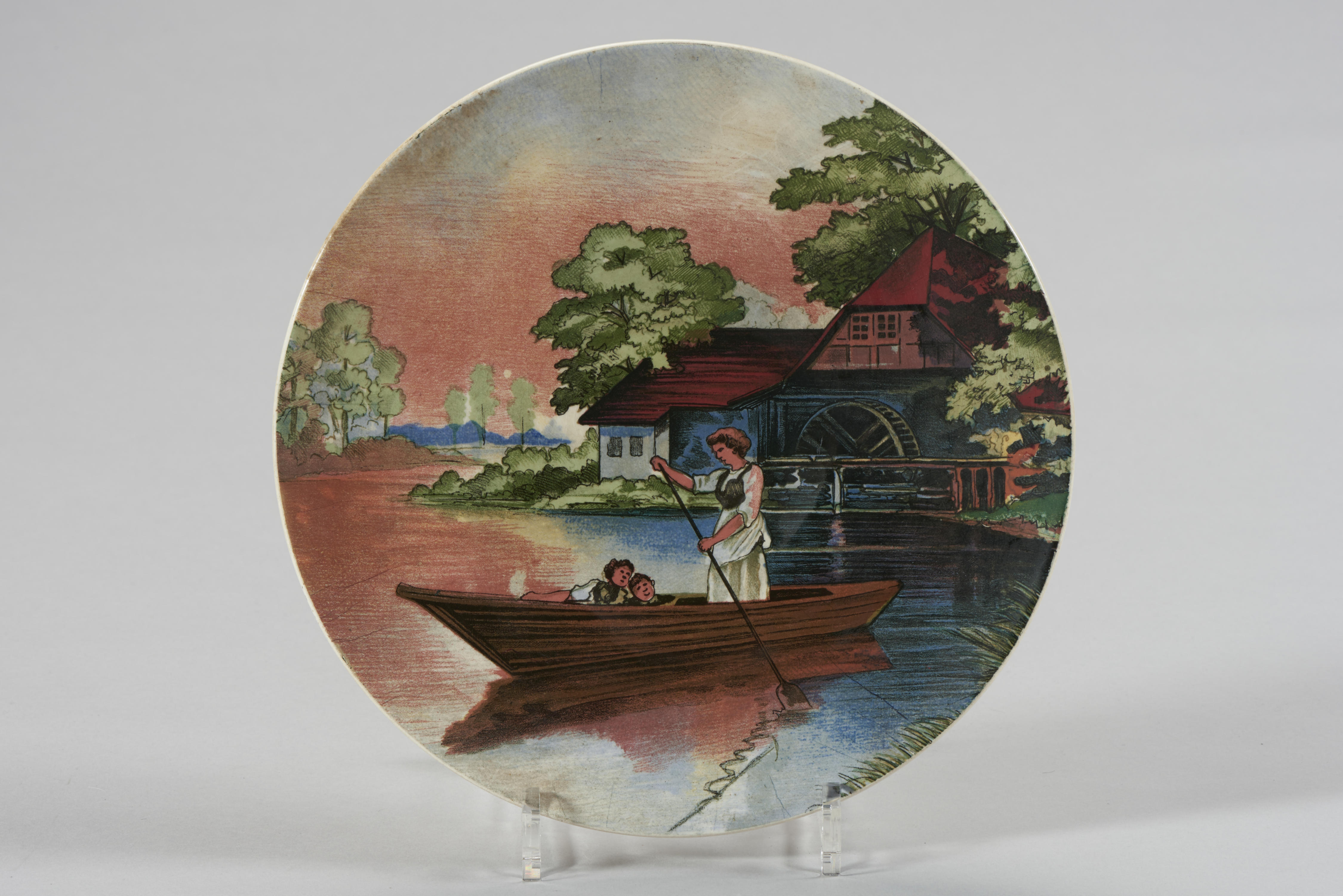 Wandbord met de voorstelling van een vrouw en twee kinderen in een roeiboot. Op de achtergrond staat een gebouw met een waterradmolen.