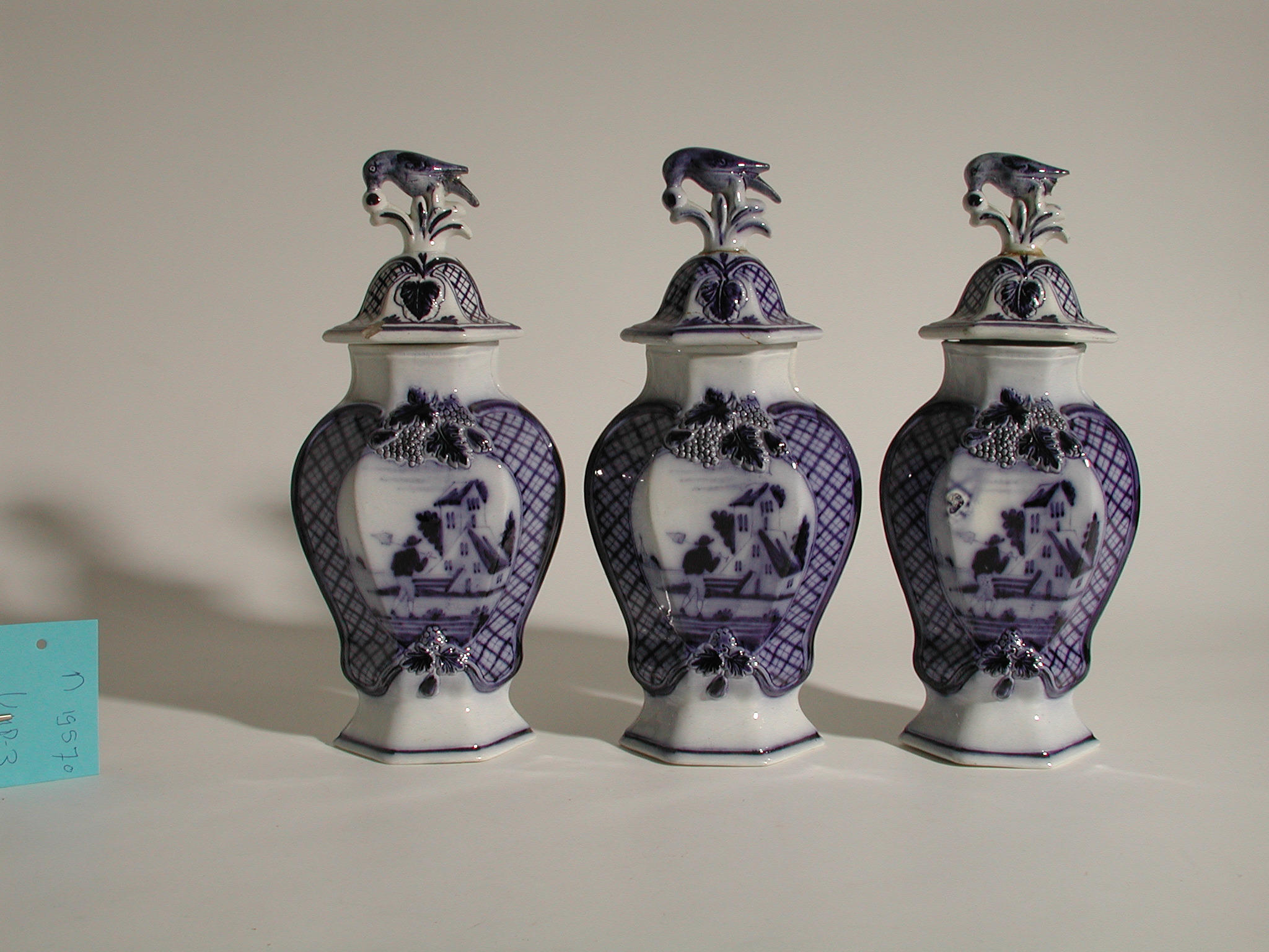 Drie kastvazen met deksel. Op elk van de deksels is een vogel afgebeeld. Op de vazen staat een afbeelding van een man met een knapzak die onderweg is naar een gebouw.