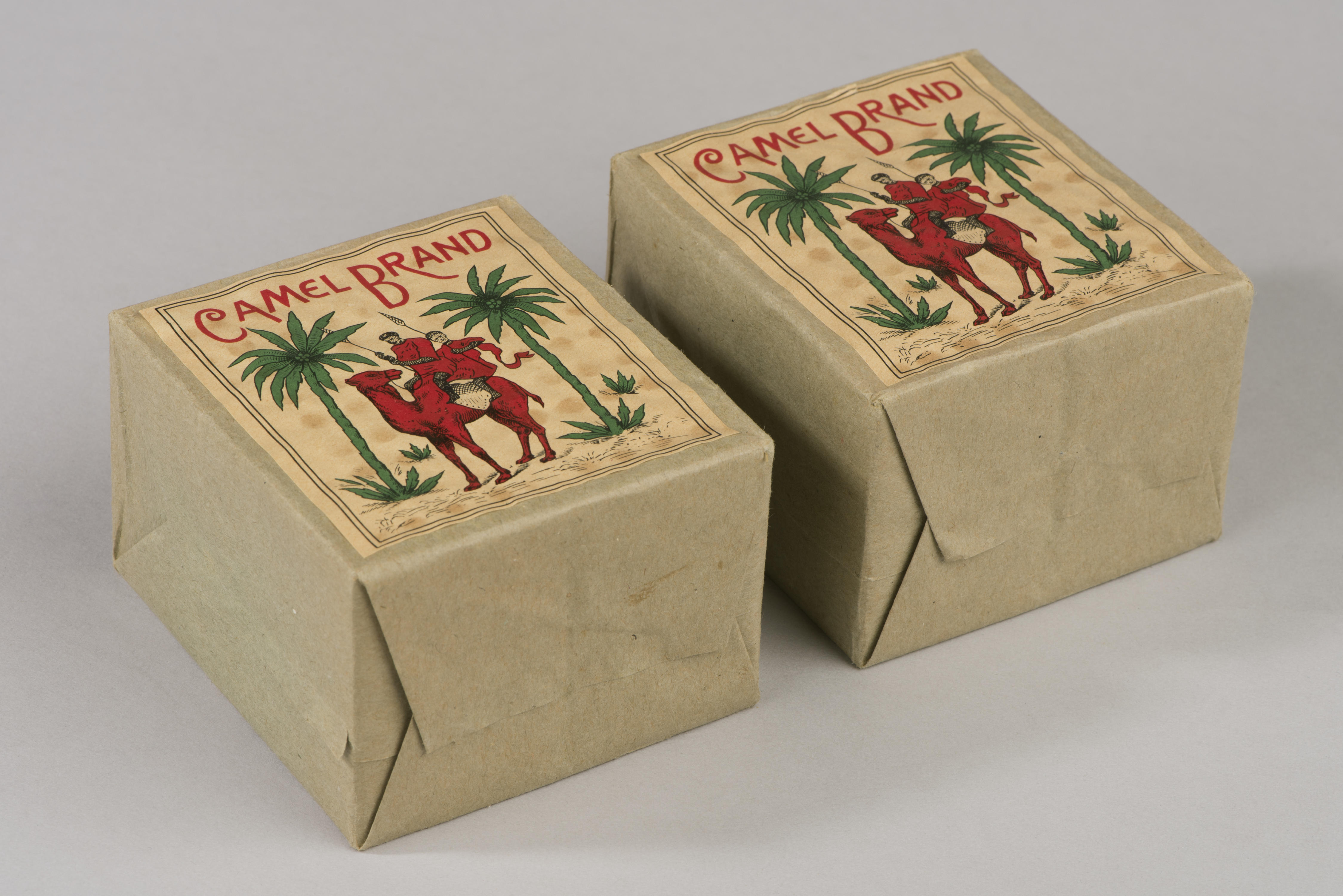 Twee pakken lucifers van 'Camel Brand'. In elk pak zitten tien lucifersdoosjes. Op de voorzijden staan afbeeldingen van een kameel of dromedaris met twee berijders tussen twee palmbomen. De lucifers zijn afkomstig uit een hamstervoorraad die rond 1940 in Apeldoorn is aangelegd.