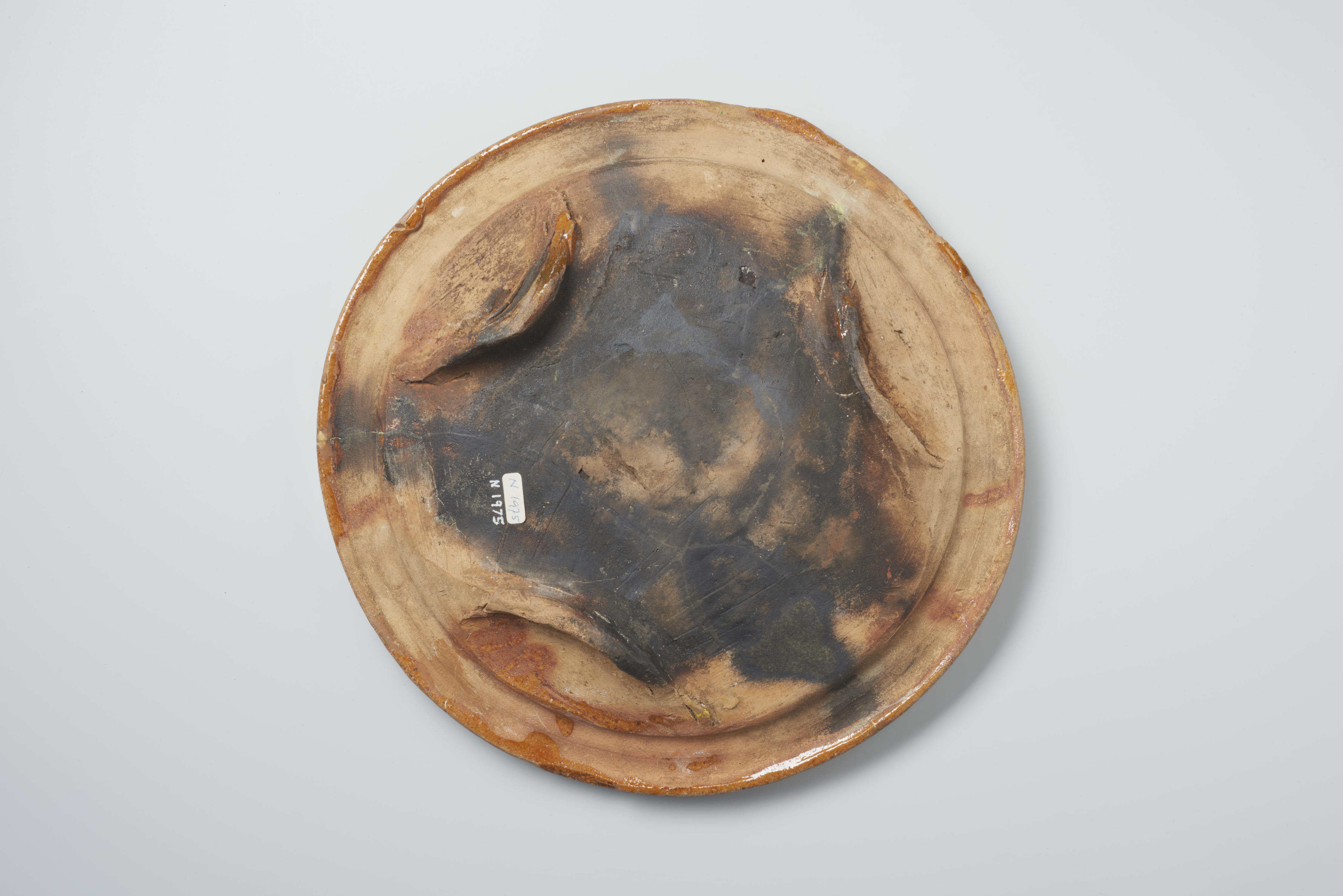 Schotel met drie schelpvormige voeten, bodemvondst. De schotel is versierd met een vogel met vruchten en het jaartal 1637 in concentrische cirkels.