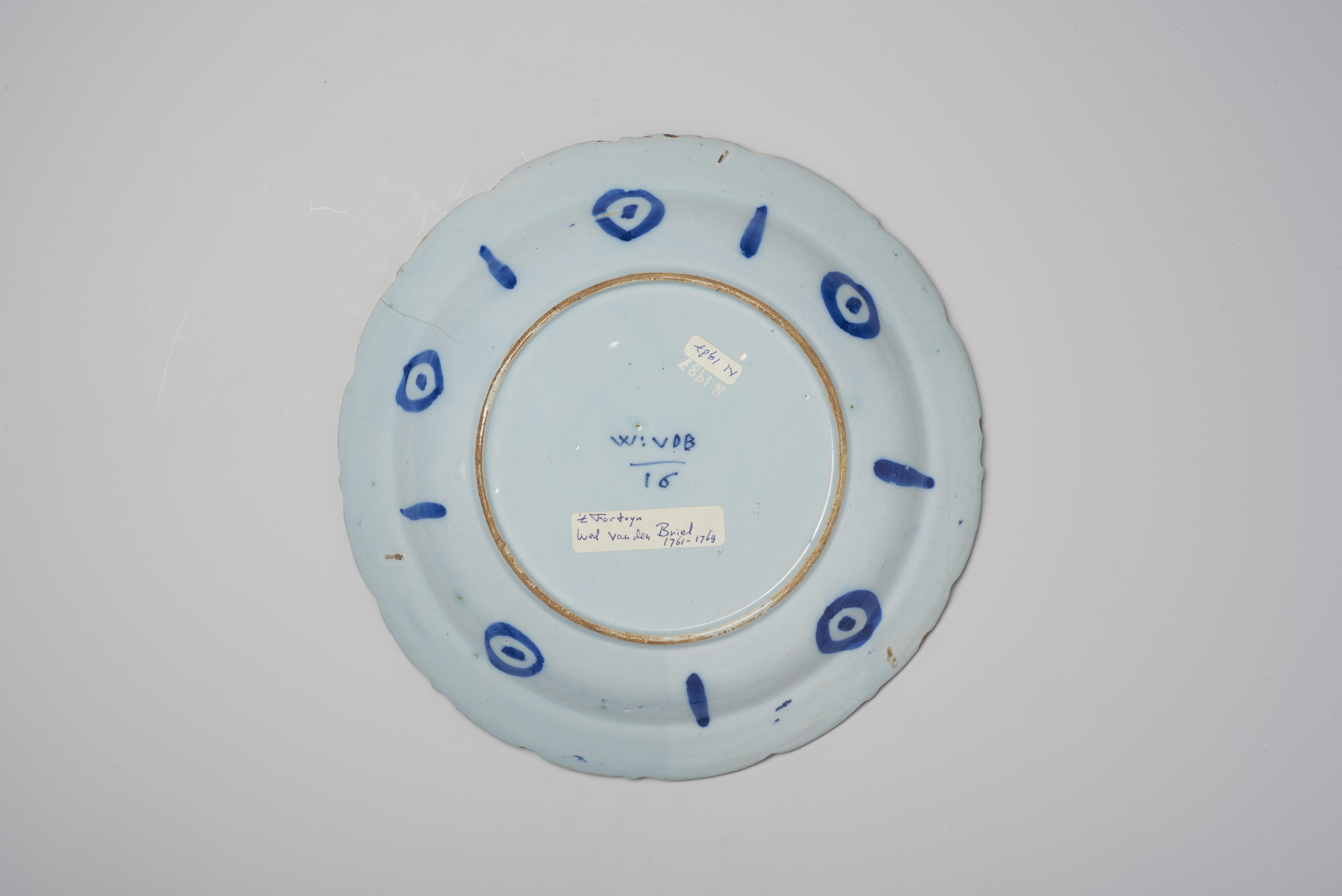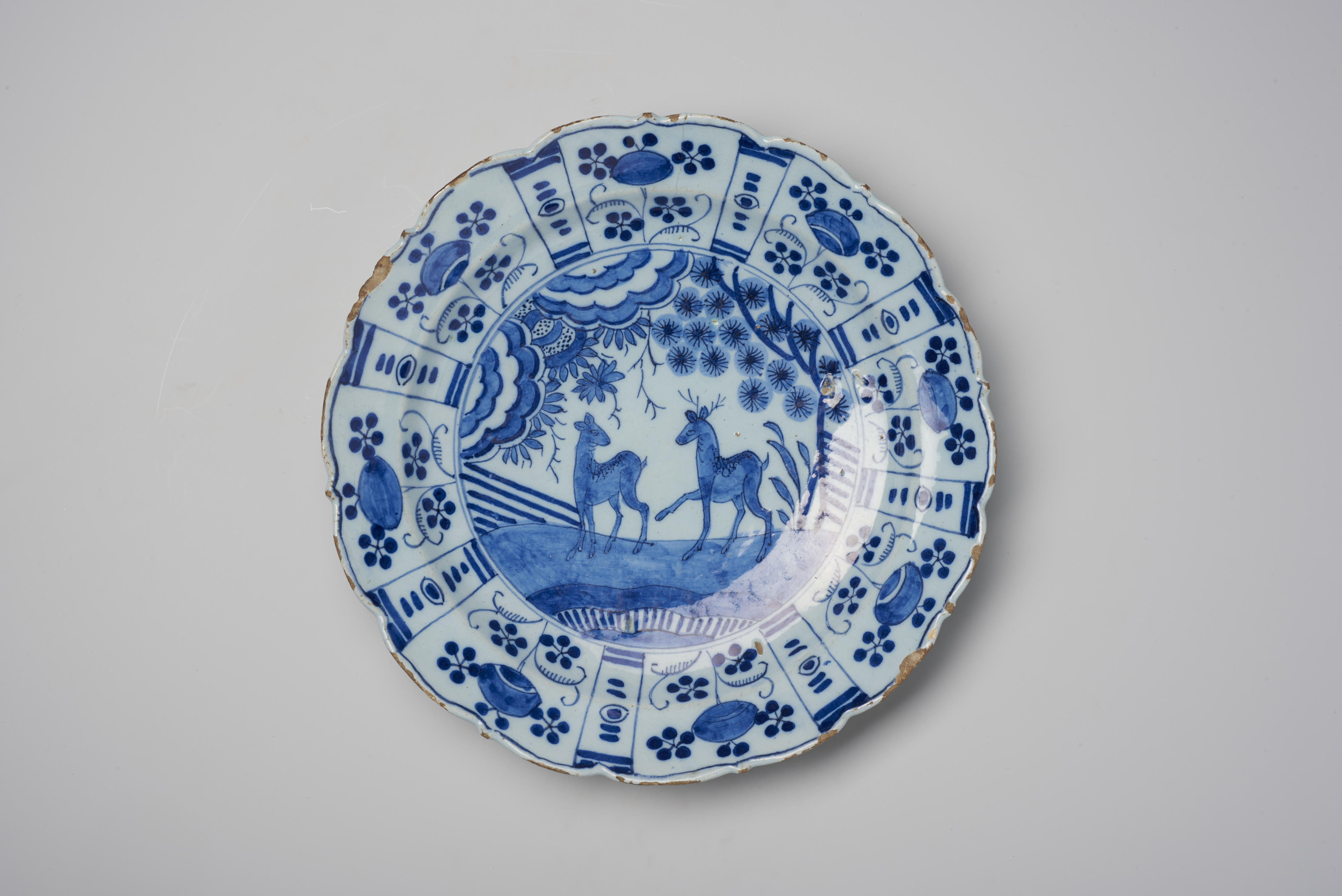 Bord met een randversiering van gecompartimenteerde plantaardige ornamenten en op het middenvlak een afbeelding van twee herten in een landschap. Op de keerzijde van de rand staan vijf ogen en vijf streepjes afgebeeld.