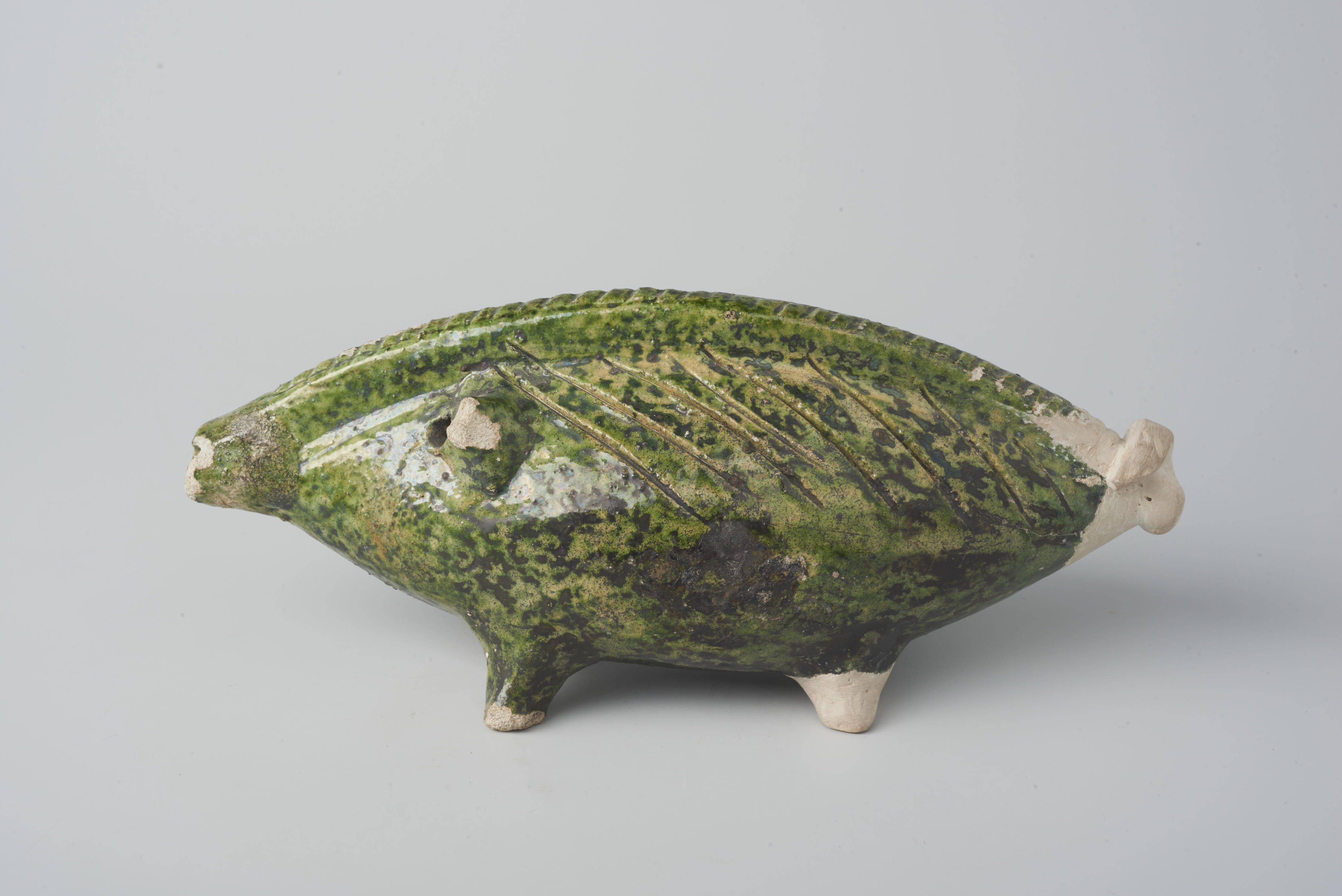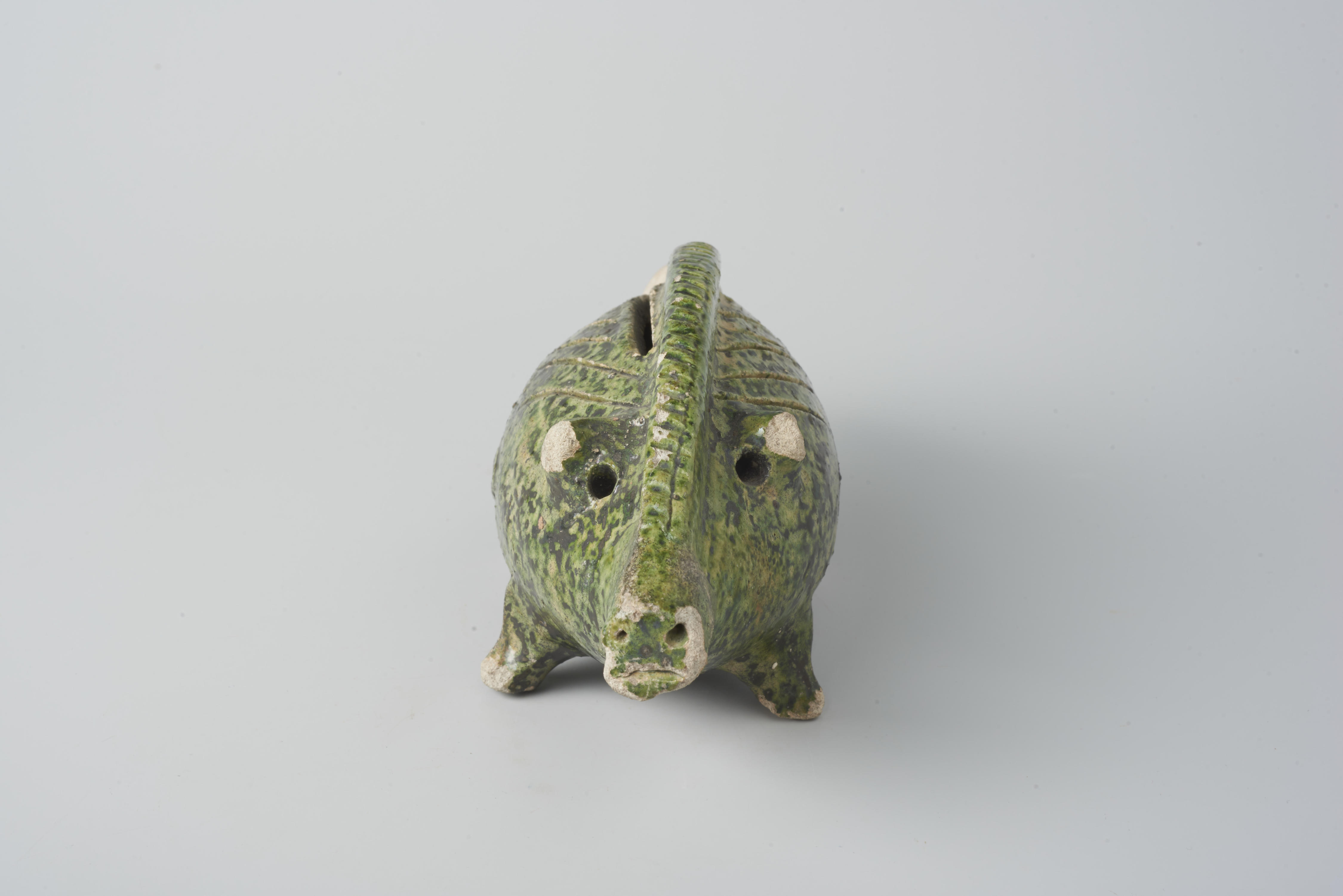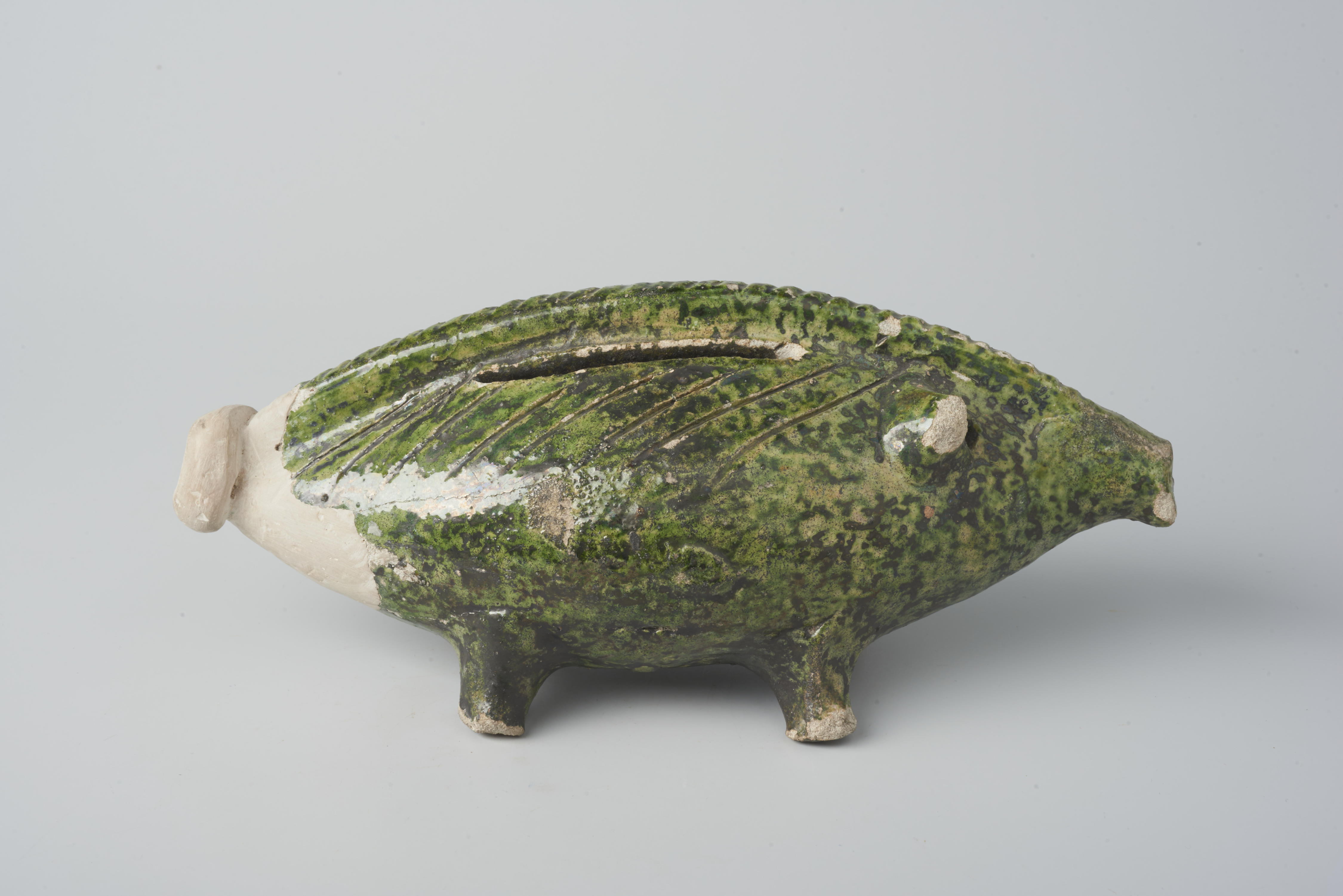 Groen geglazuurd spaarvarken, bodemvondst. De staart en één pootje zijn gerestaureerd.