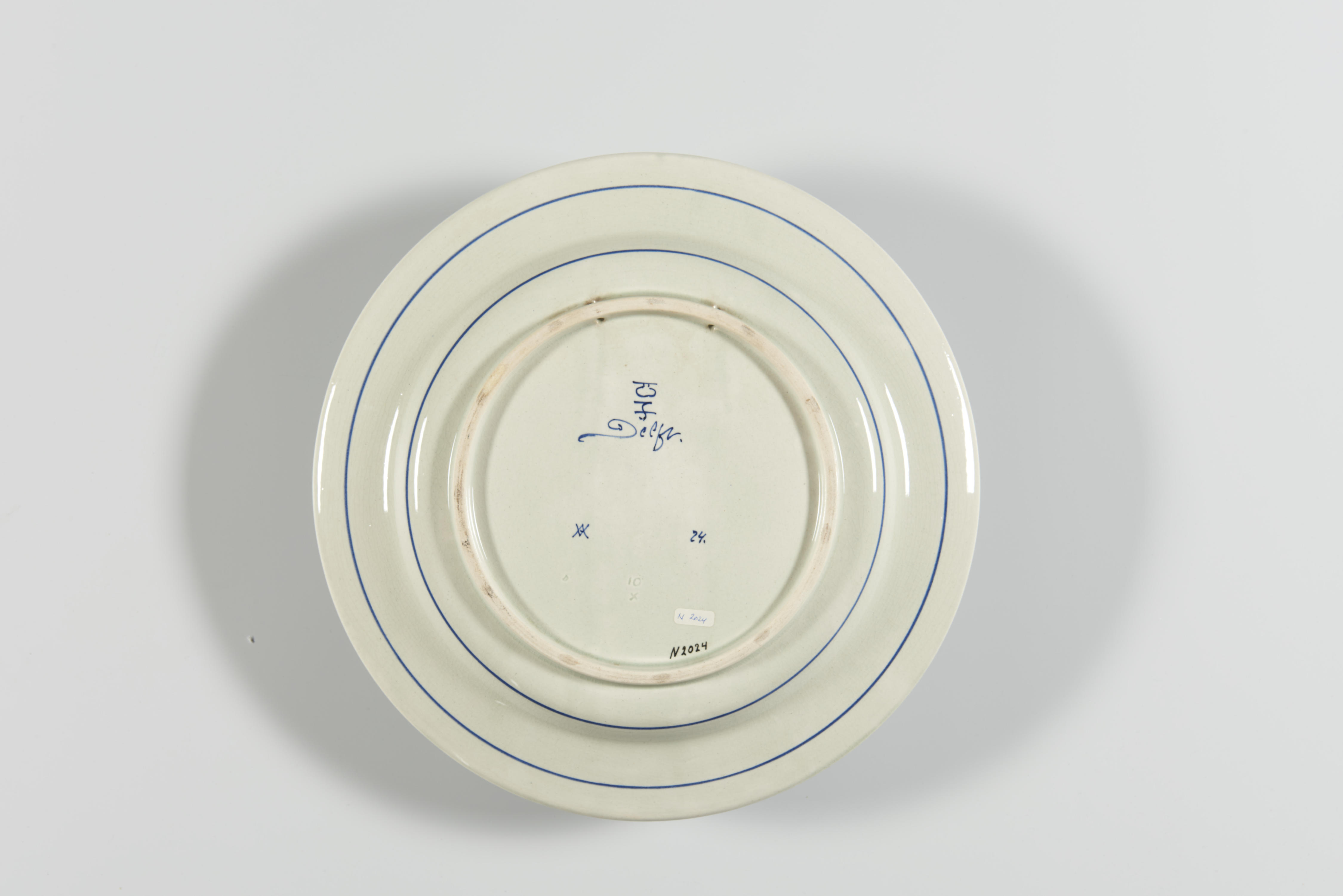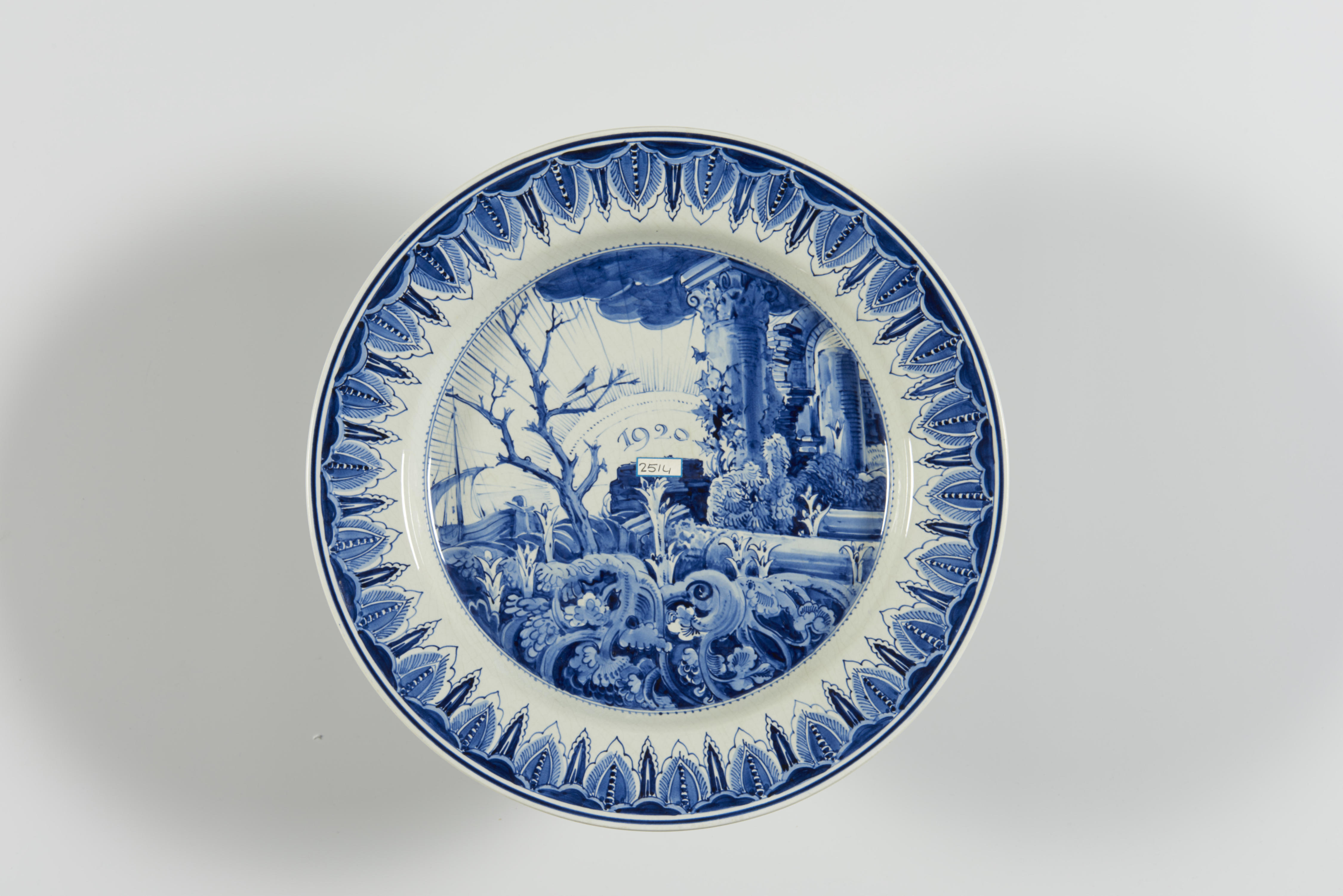 Wandbord met de voorstelling van een landschap met een boot, ruïne en ondergaande zon waarop het jaartal 1920 staat.