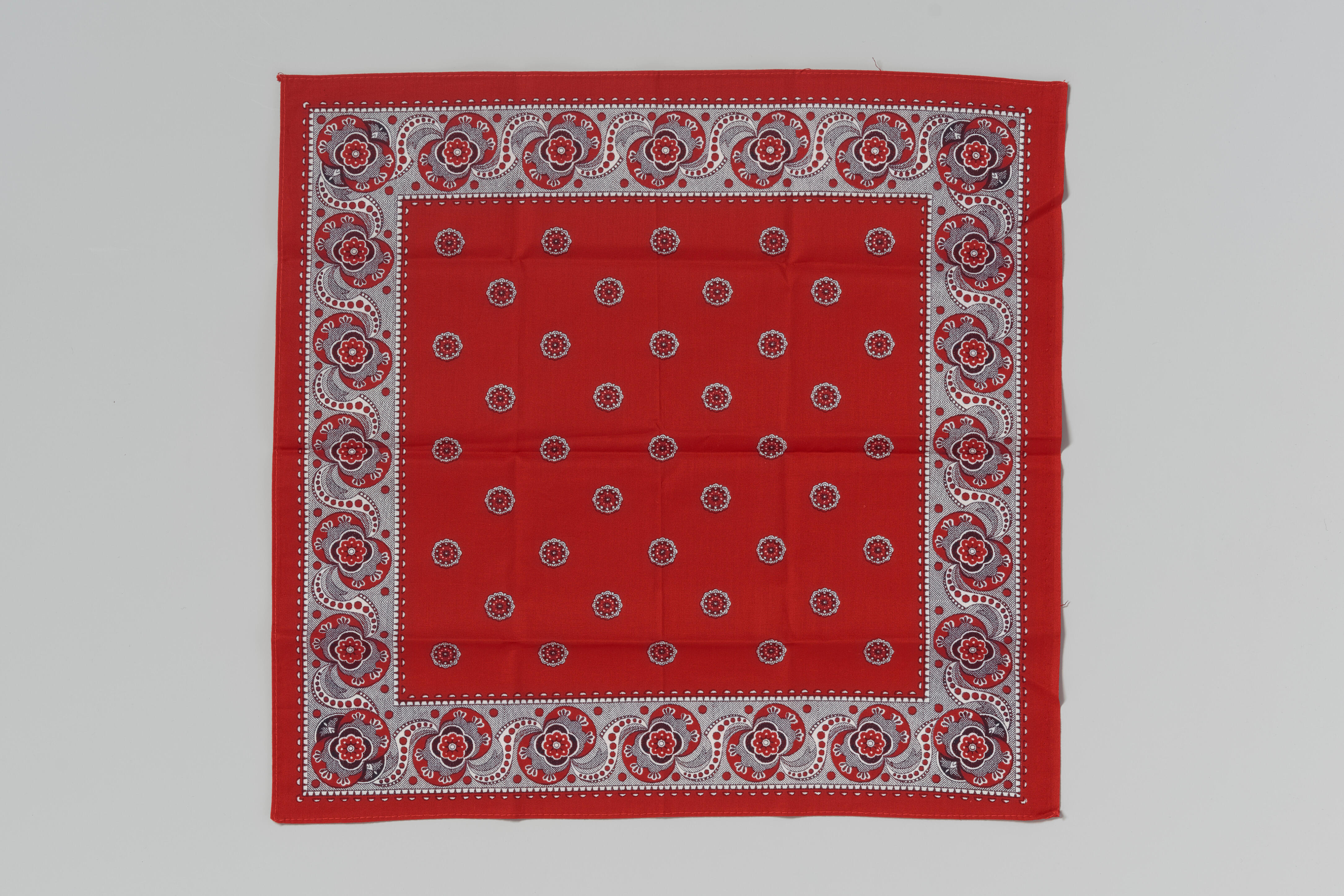 Een katoenen zakdoek, bedrukt in de kleuren rood en zwart. De zakdoek is in 1985 door het museum verworven als onderdeel van de inventaris van Boekema's Witgoedmagazijn, een winkel in tricotage en huishoudelijk textiel in Leeuwarden. Dit soort winkels was gespecialiseerd in machinaal gebreid ondergoed, kousen, nachtkleding en allerlei accessoires, veelal in lichte kleuren (vandaar ...
