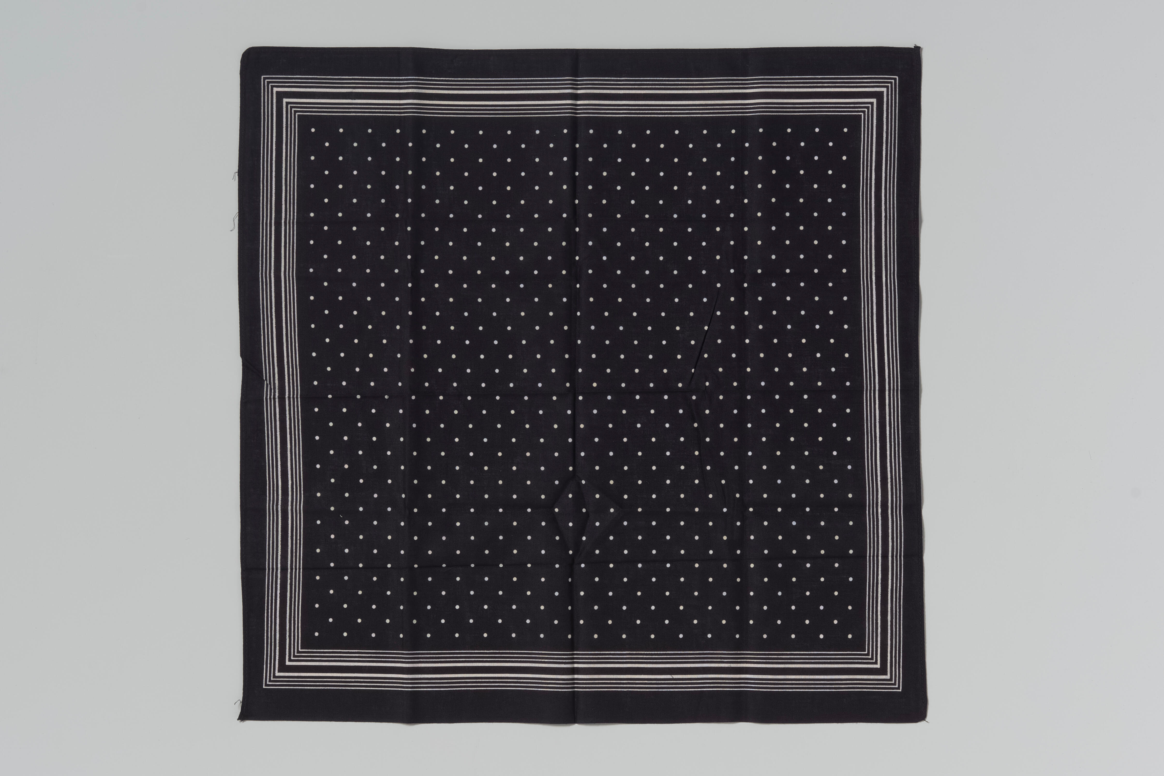 Een witte katoenen zakdoek, bedrukt in de kleur zwart. De zakdoek is in 1985 door het museum verworven als onderdeel van de inventaris van Boekema's Witgoedmagazijn, een winkel in tricotage en huishoudelijk textiel in Leeuwarden. Dit soort winkels was gespecialiseerd in machinaal gebreid ondergoed, kousen, nachtkleding en allerlei accessoires, veelal in lichte kleuren (vandaar ‘witgoed’) ...