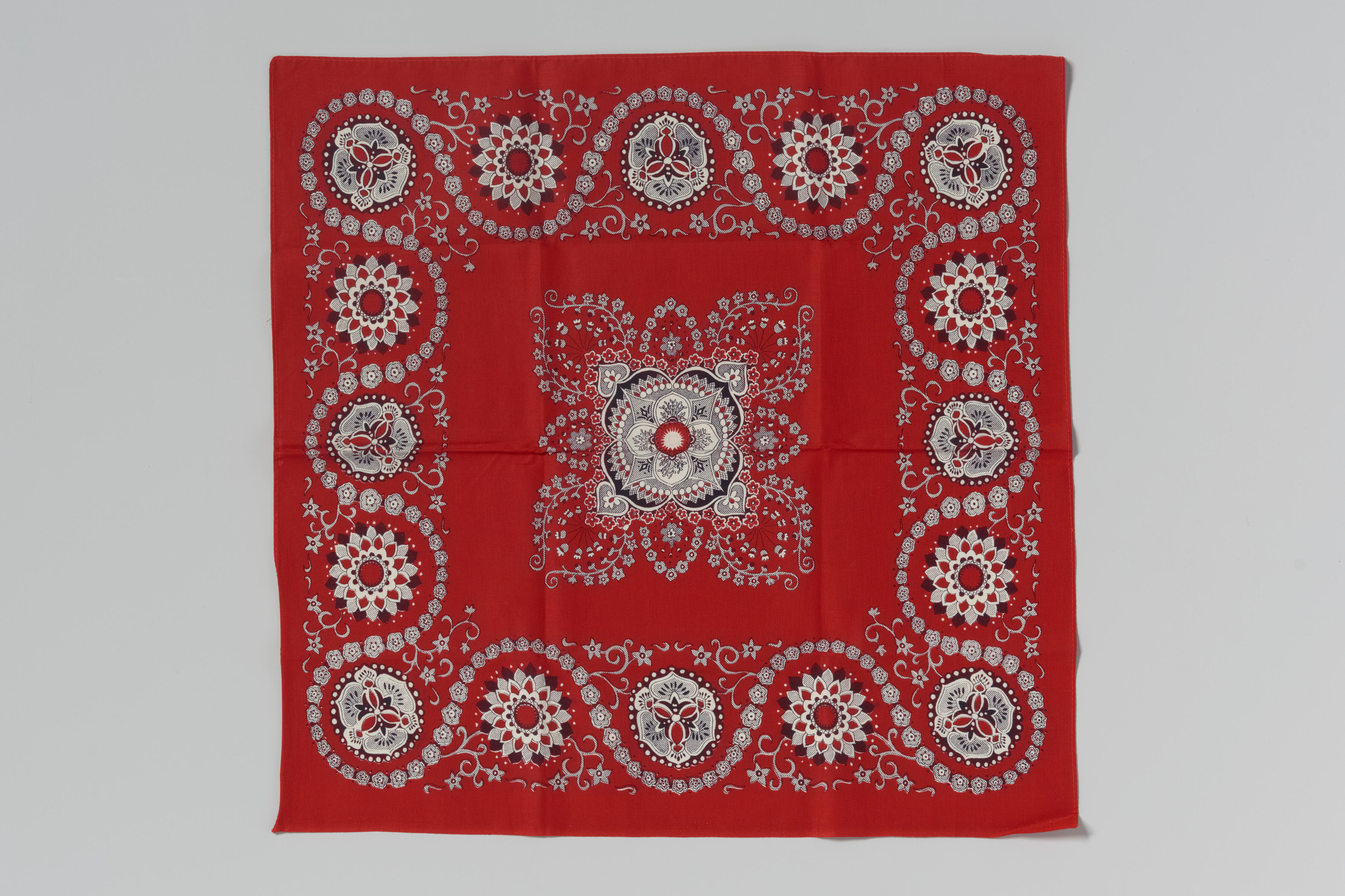 Een katoenen zakdoek, bedrukt in de kleuren rood en zwart. De zakdoek is in 1985 door het museum verworven als onderdeel van de inventaris van Boekema's Witgoedmagazijn, een winkel in tricotage en huishoudelijk textiel in Leeuwarden. Dit soort winkels was gespecialiseerd in machinaal gebreid ondergoed, kousen, nachtkleding en allerlei accessoires, veelal in lichte kleuren (vandaar ...