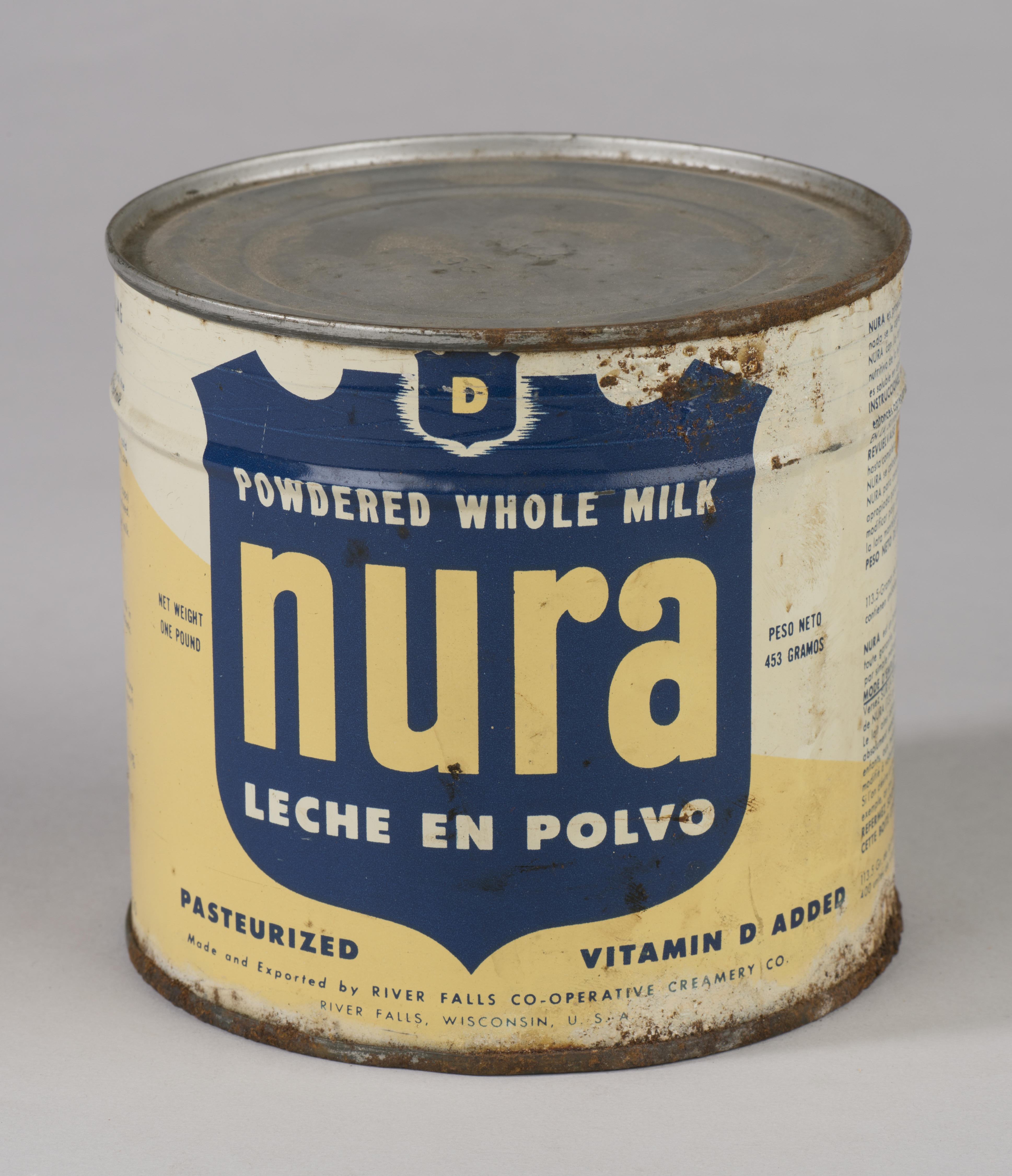 Blik melkpoeder van het merk ‘Nura’. Het blik is afkomstig uit een hamstervoorraad die rond 1945 is aangelegd in Leeuwarden. Het behoorde tot de ‘relief-goederen’ die in de tweede helft van 1945 en in het begin van 1946 in Nederland in de winkels te koop waren. In plaats van verse melk gebruikte men destijds vanwege ...