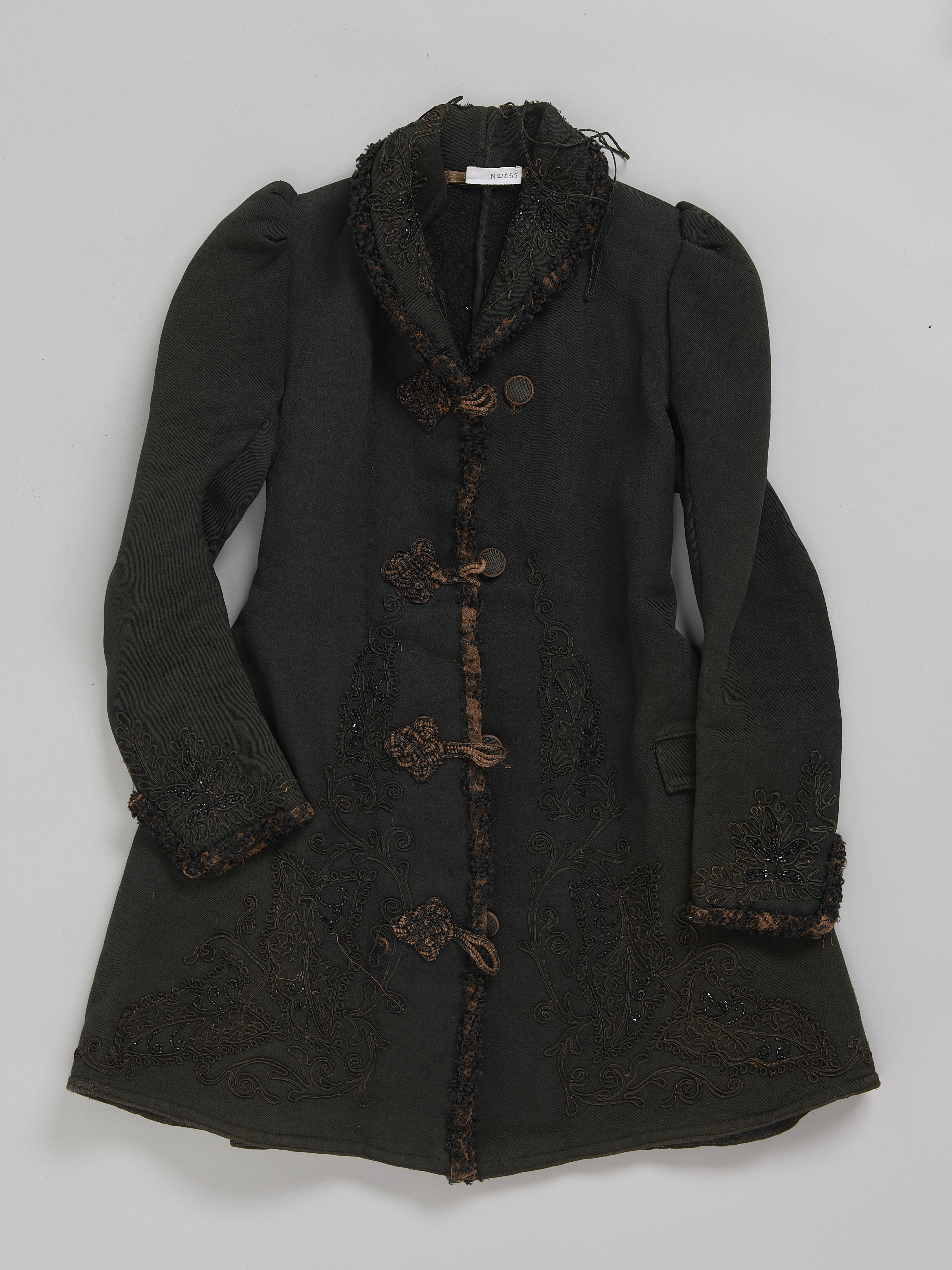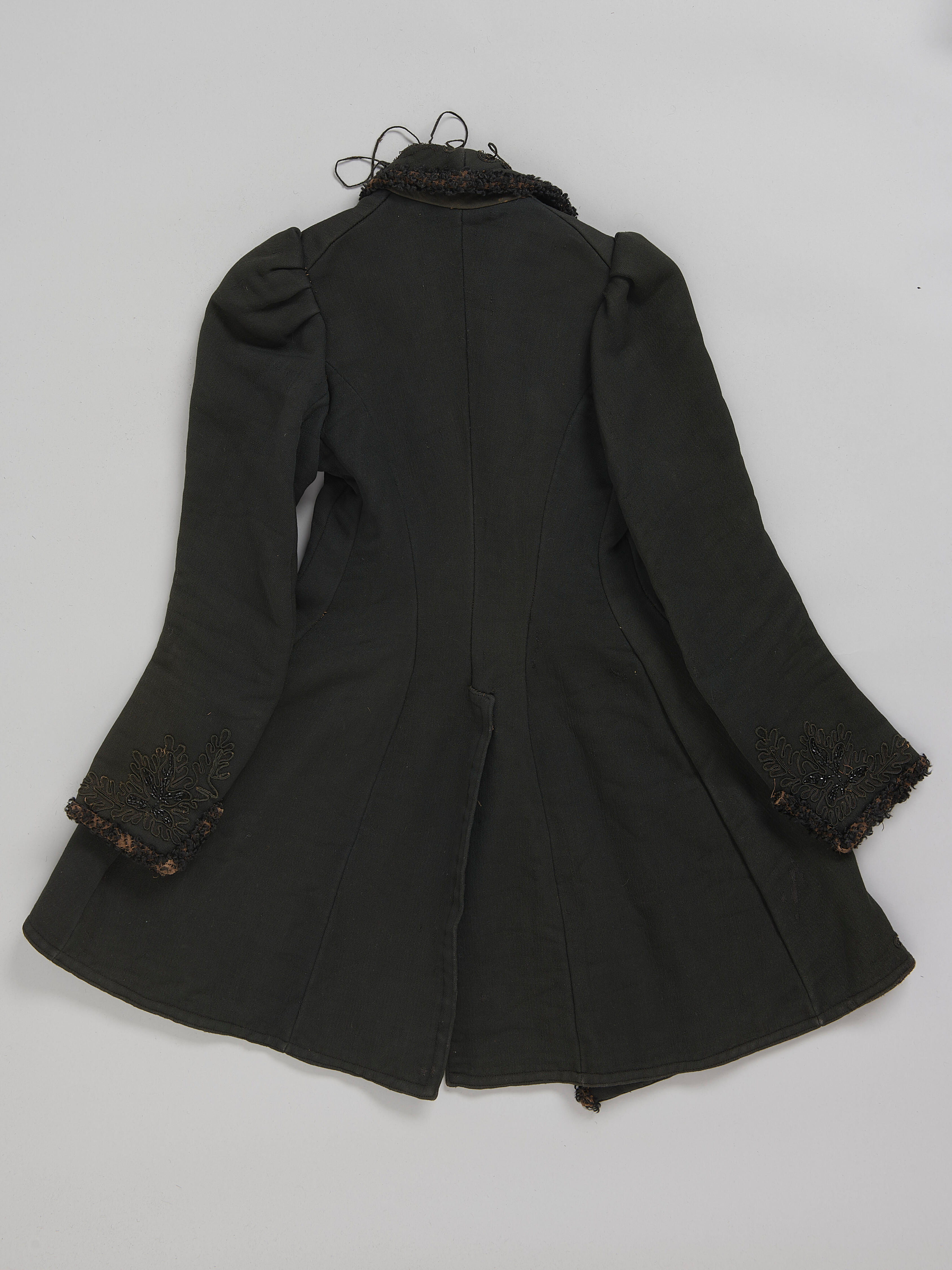 Halflange jas van zwarte wol met sterk geruwde binnenzijde. De jas was mogelijk onderdeel van een mantelpak. De kraag, voorpanden en mouwen zijn afgezet met zwarte astrakan (wol). De garnering op de kraag, voorpanden en mouwen zijn van zwart veterband en gitten in bladmotief. De sluitingen zijn over de versieringen heengezet.