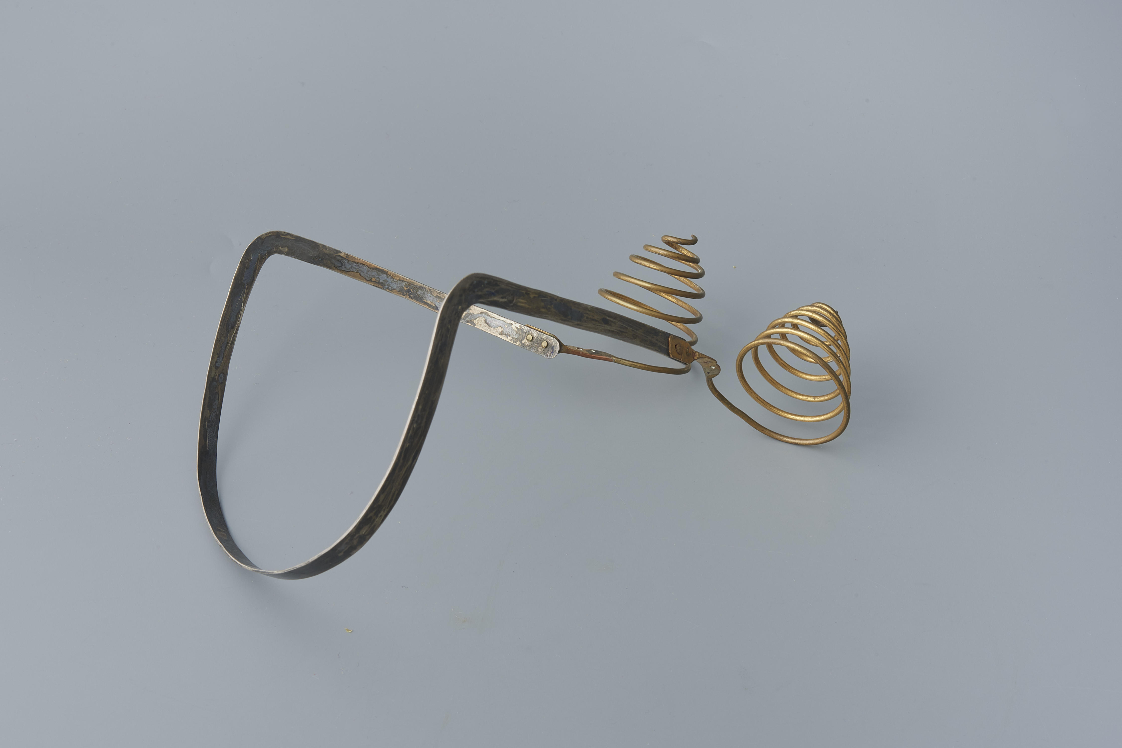 Zilveren oorijzer met vergulde krullen, gedragen door Kommertje van der Laan-Faasse (1879-1969). Mevrouw van der Laan droeg de streekdracht van Sommelsdijk, ook nadat ze naar Vlaardingen was verhuisd. Het oorijzer is rond 1900 gemaakt door Dirk Schotman Jr. uit Dordrecht.