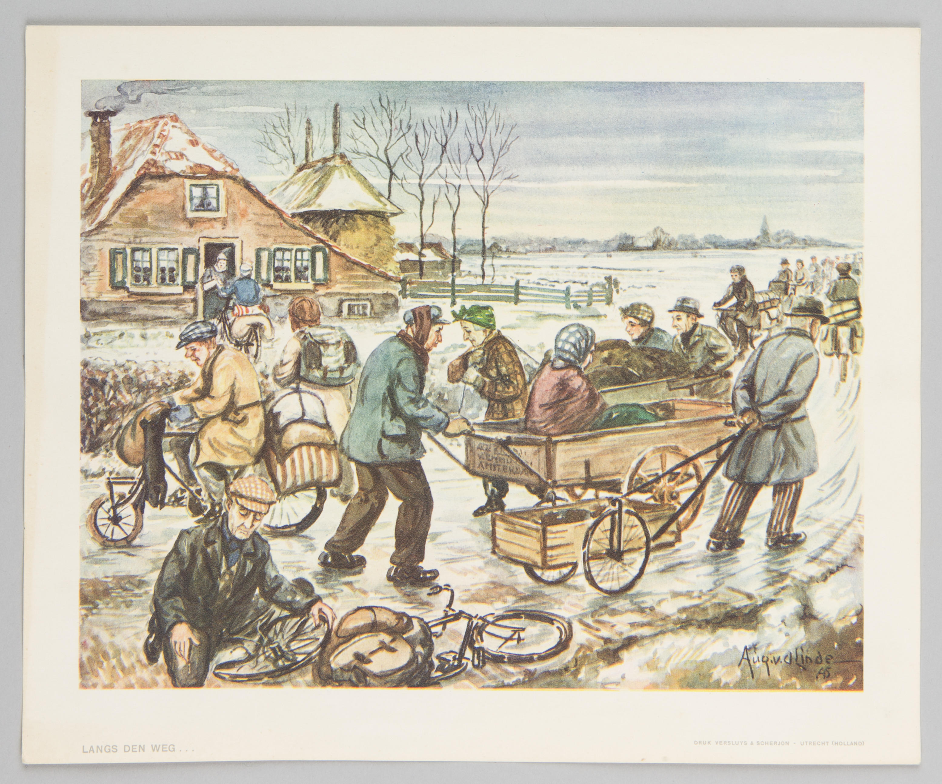 Prent met een voorstelling van mensen op een weg voor een boerderij. De mensen vervoeren goederen in wagens en op fietsen. De prent is onderdeel van een set van achttien reproducties naar aquarellen van Aug. van der Linde die het leven tijdens de winter van 1944-1945 verbeelden.
