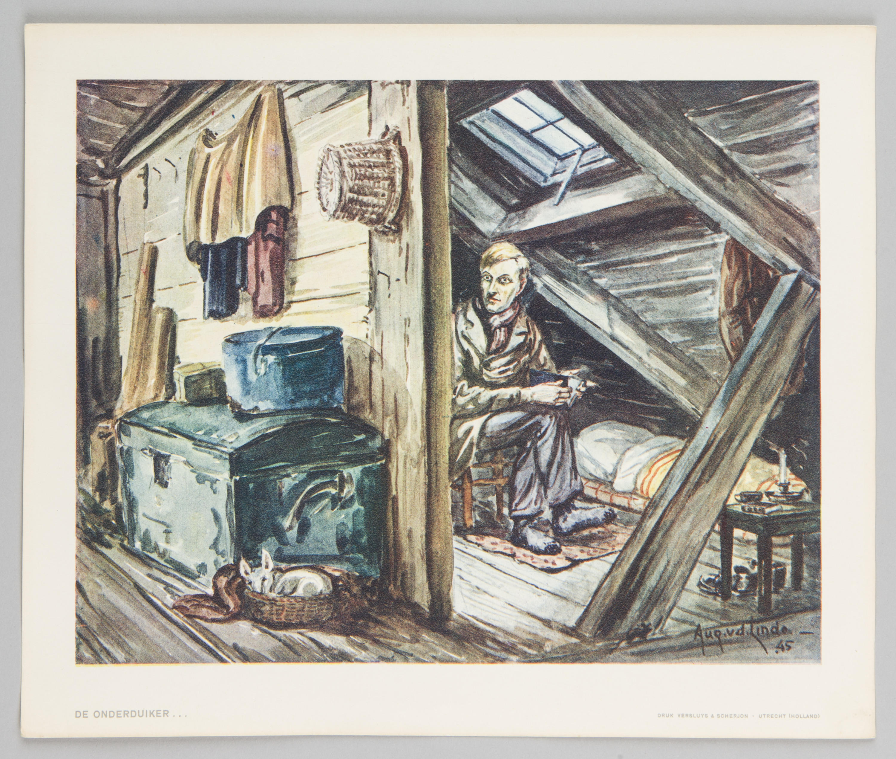 Prent met een voorstelling van een man op een kruk achter een wand op een zolder. De prent is onderdeel van een set van achttien reproducties naar aquarellen van Aug. van der Linde die het leven tijdens de winter van 1944-1945 verbeelden.