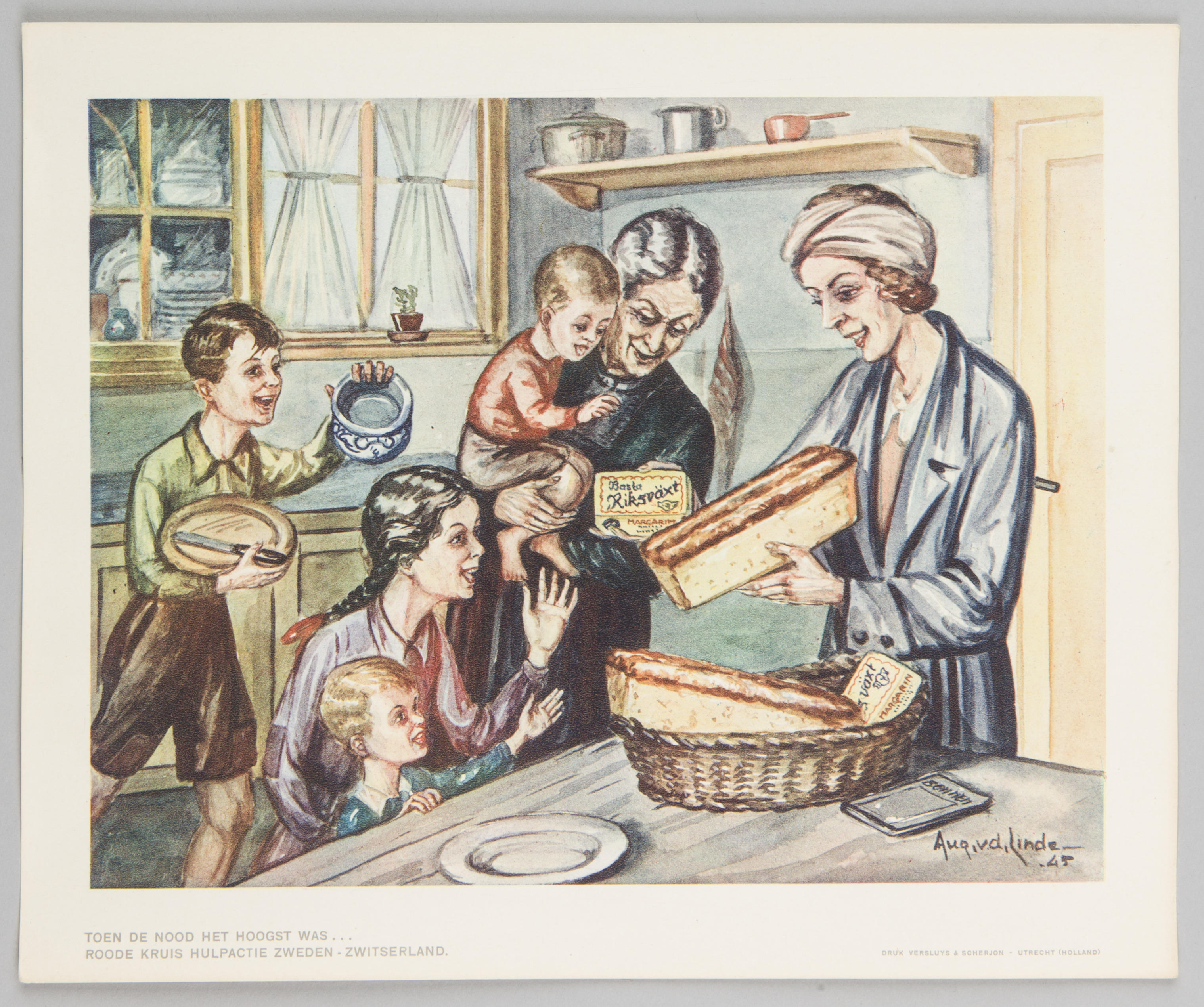 Prent met een voorstelling van een gezin dat vrolijk kijkt naar een mand met voedsel. De prent is onderdeel van een set van achttien reproducties naar aquarellen van Aug. van der Linde die het leven tijdens de winter van 1944-1945 verbeelden.