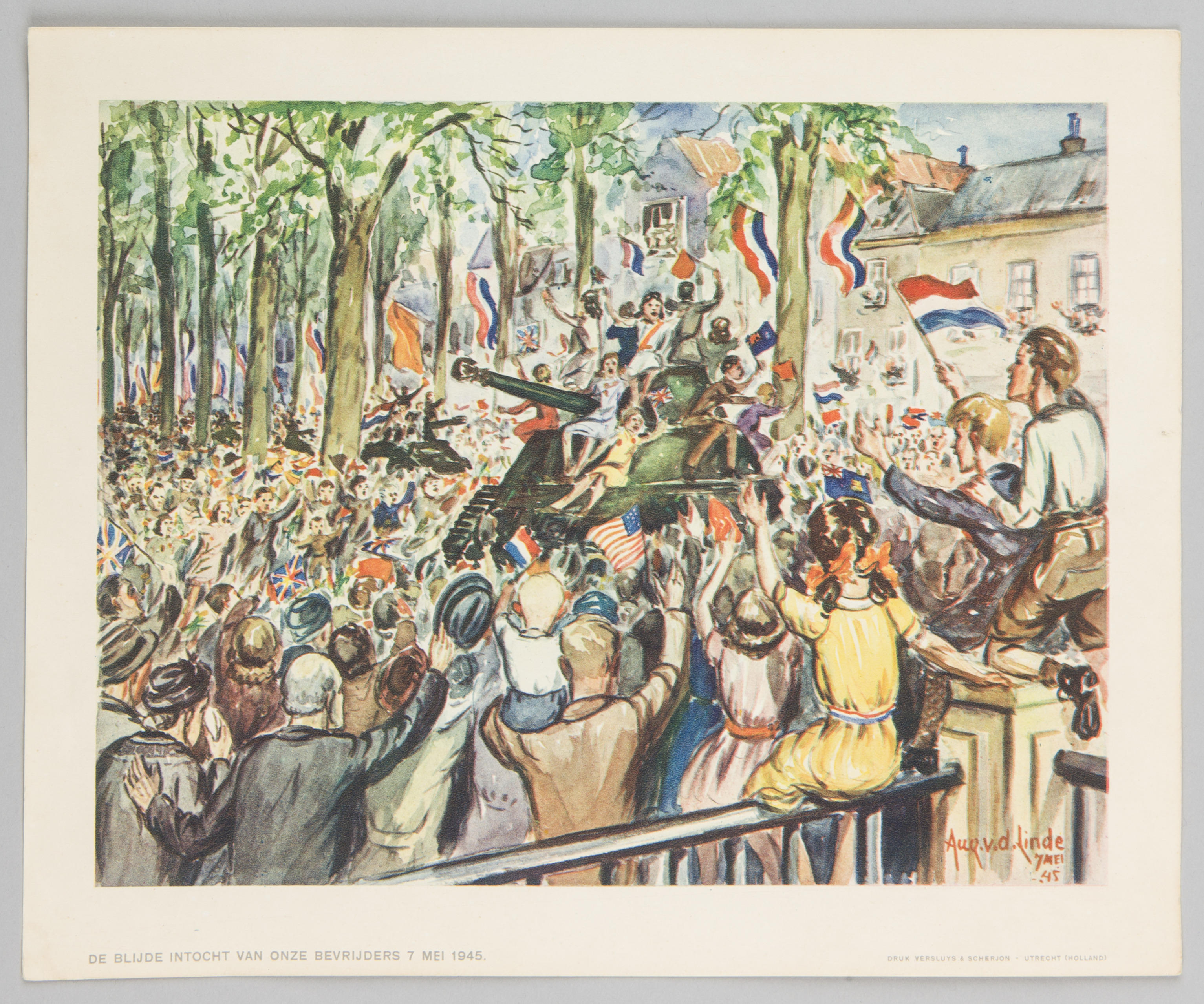 Prenten met een voorstelling van mensen die met vlaggen zwaaien en juichen naar een tank waarop allerlei mensen zitten. De prent is onderdeel van een set van achttien reproducties naar aquarellen van Aug. van der Linde die het leven tijdens de winter van 1944-1945 verbeelden.