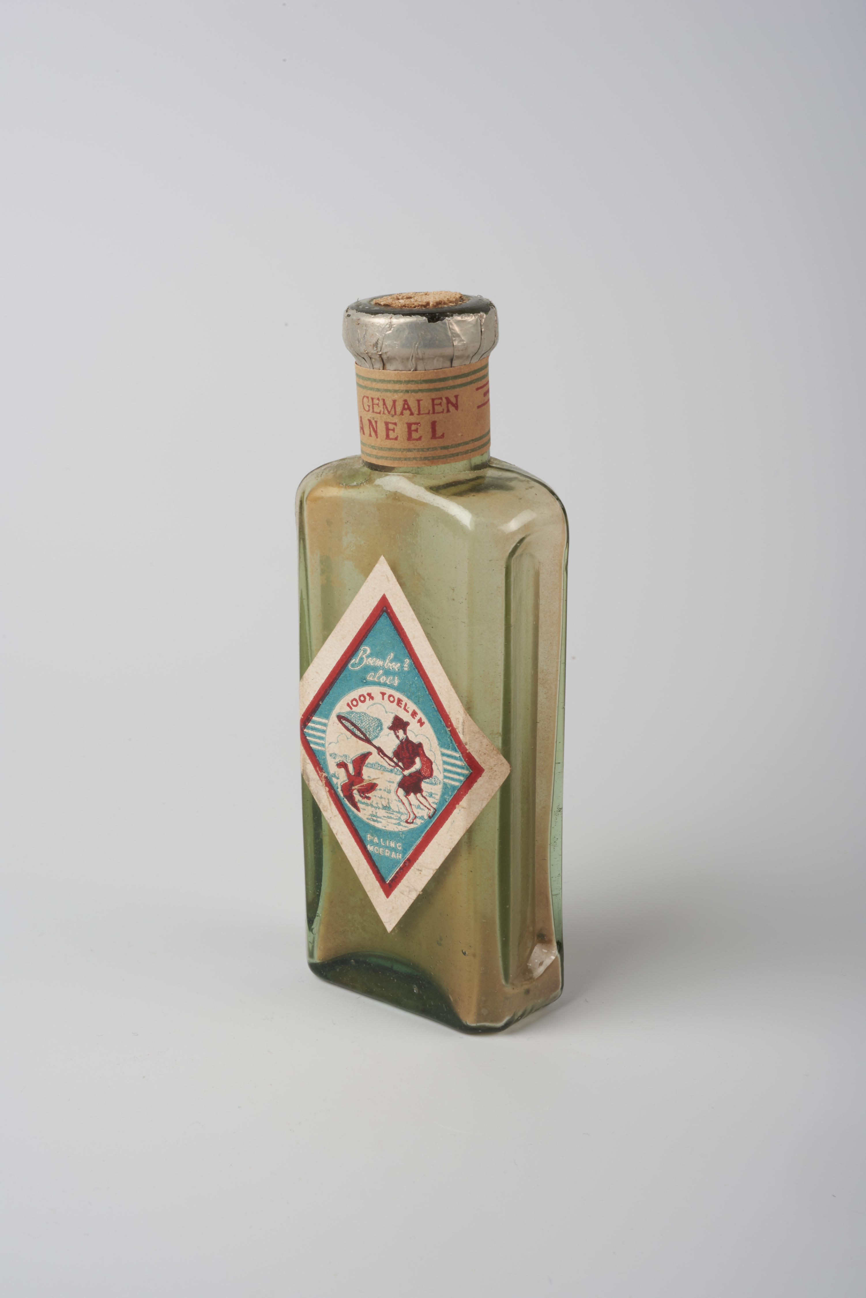 Flesje met een afgebroken kurken stop. Om de hals van het flesje zit een etiket met de tekst: 'Fijn gemalen kaneel'. Op de voorzijde van de fles zit een etiket met opschriften en een voorstelling een man die met een net een eend probeert te vangen.