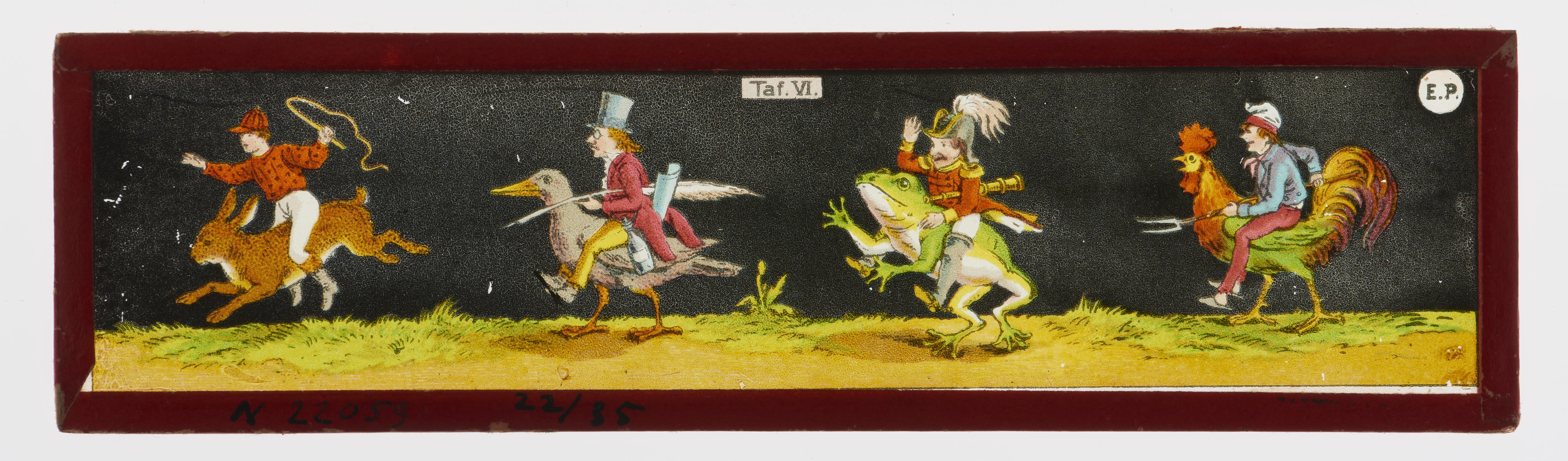 Vier mannen die op verschillende dieren rijden: een konijn, een vogel, een kikker en een haan.