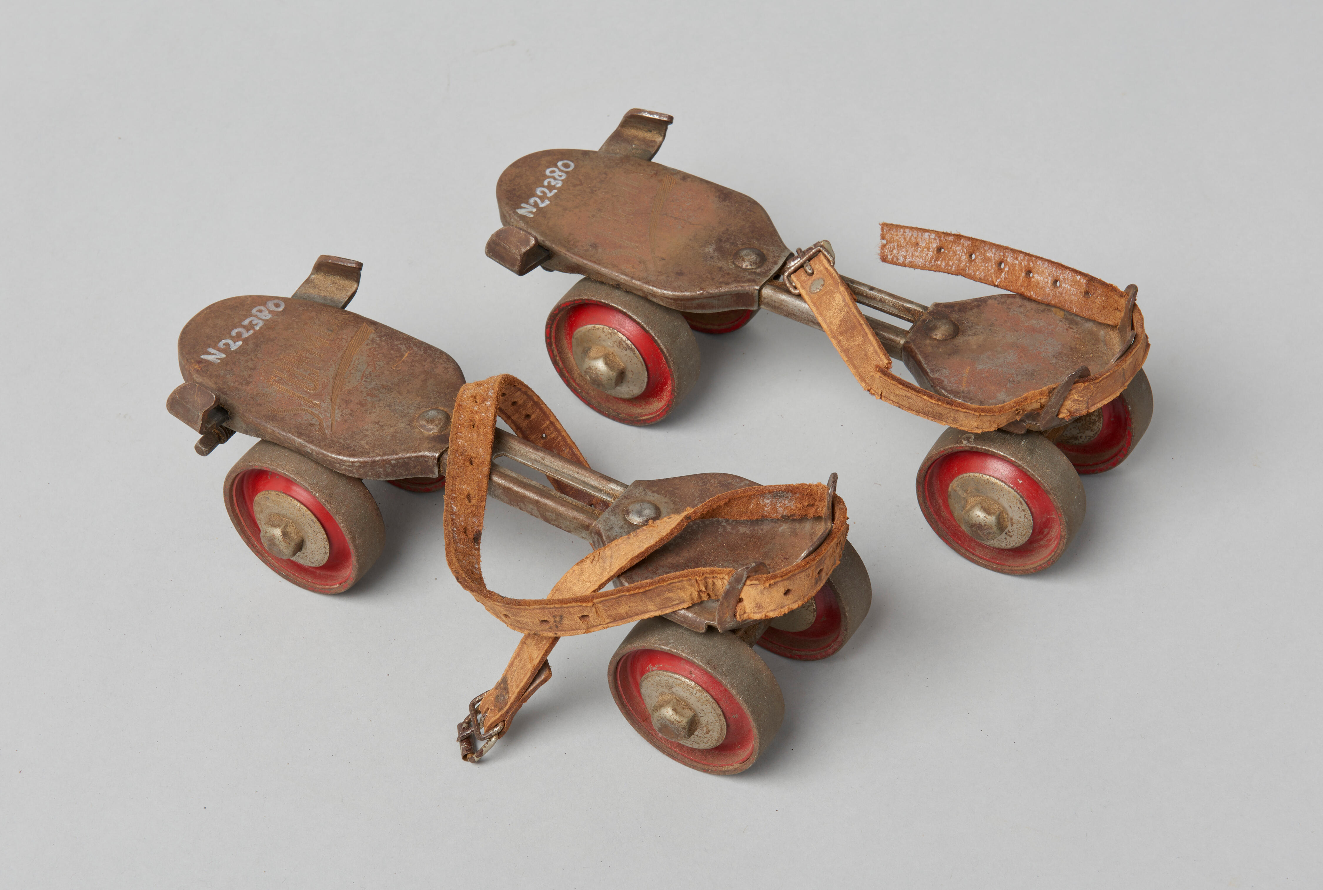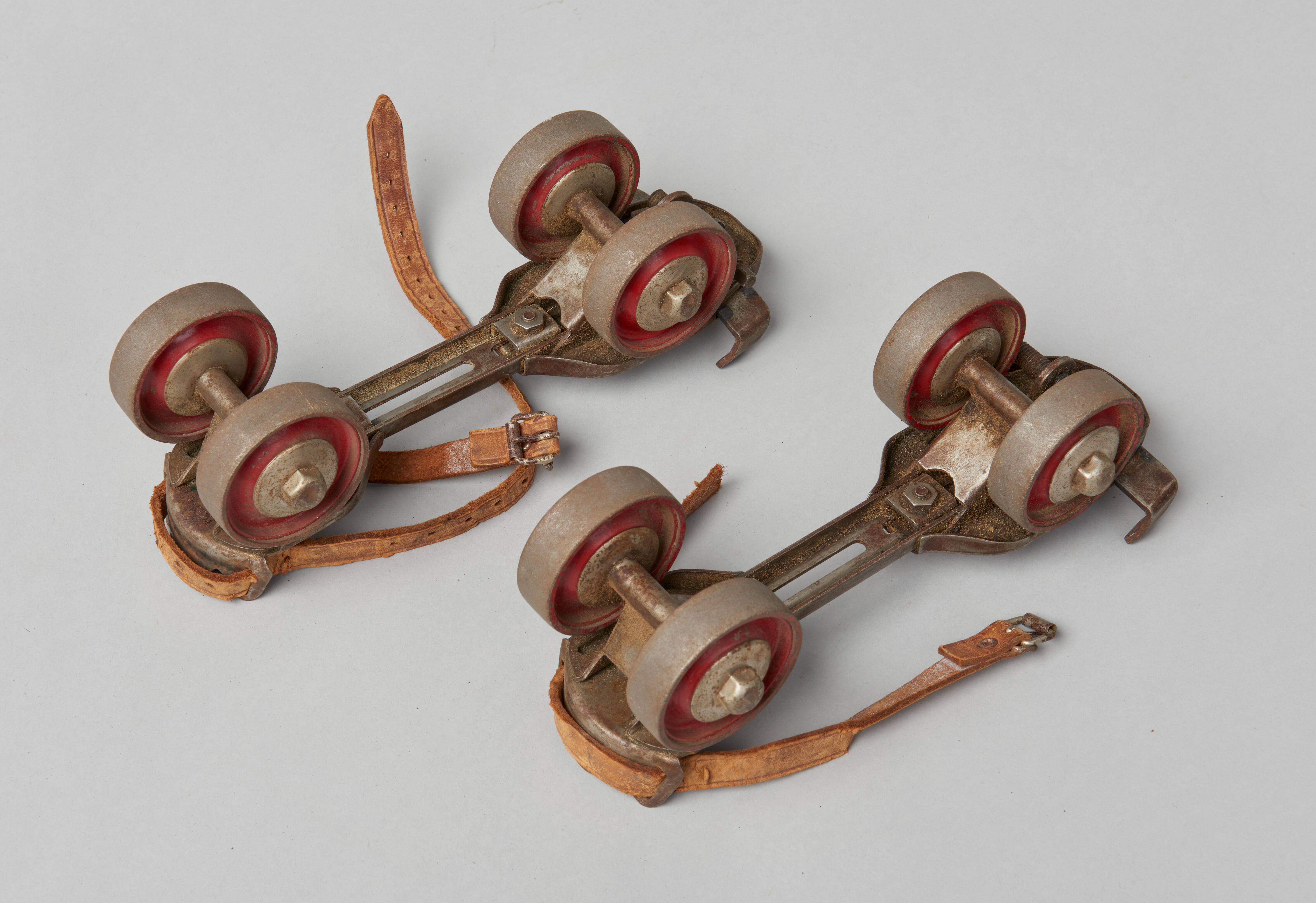 Een paar rolschaatsen om onder de schoenen te binden, gebruikt in Bathmen. De rolschaatsen waren uitschuifbaar met behulp van een 'verlengbare voetstapel' en een stelschroef. Zo konden ze meerdere schoenmaten meegaan.