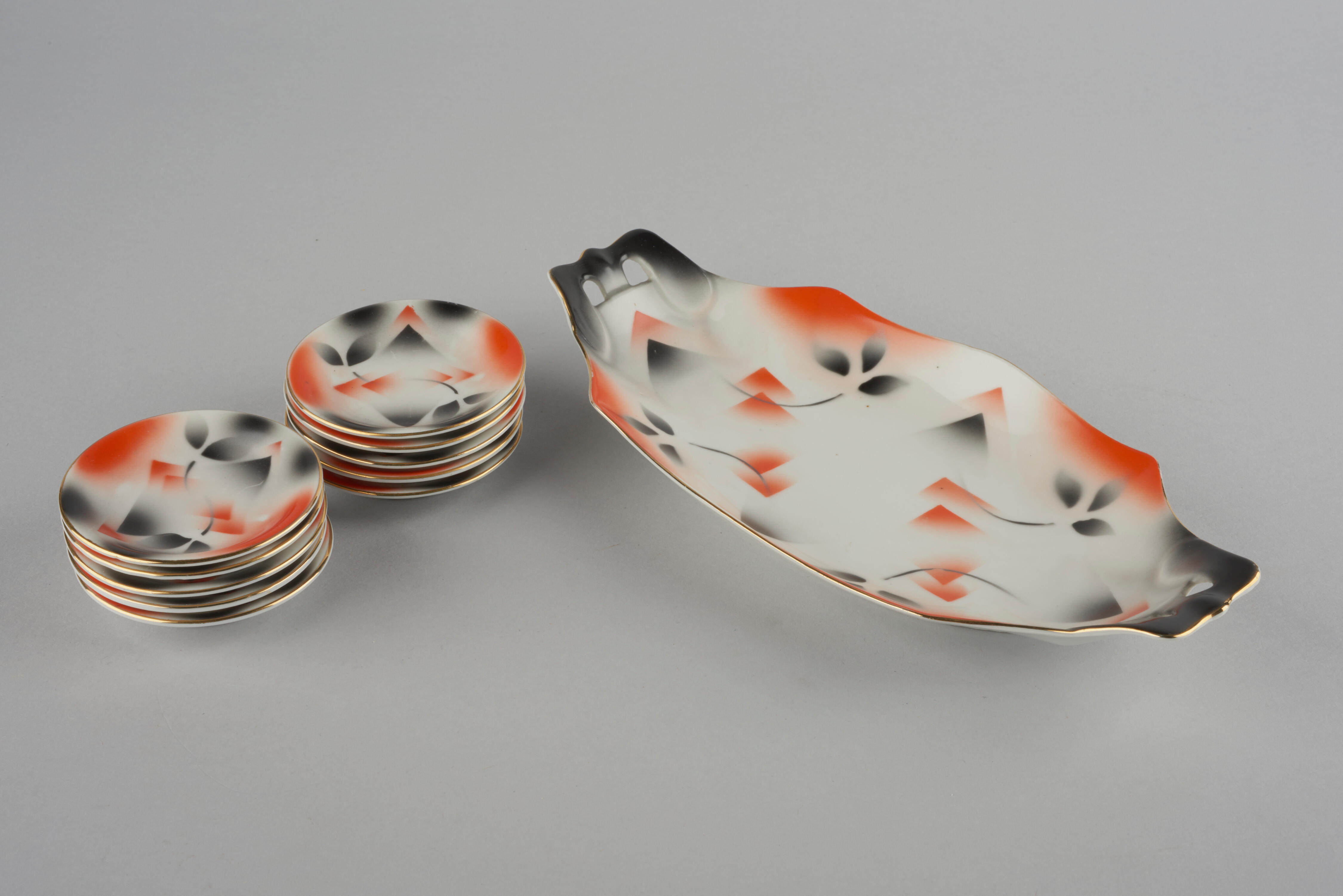 Bonbonset, bestaand uit een bonbonschaal en tien gebaksbordjes. De schaal is voorzien van een gelobde rand. Zowel de schaal als de gebaksbordjes zijn verfraaid met een geometrische voorstelling in de kleuren rood en zwart. Deze set werd rond 1930 vervaardigd door Victoria China Czechoslovakia.