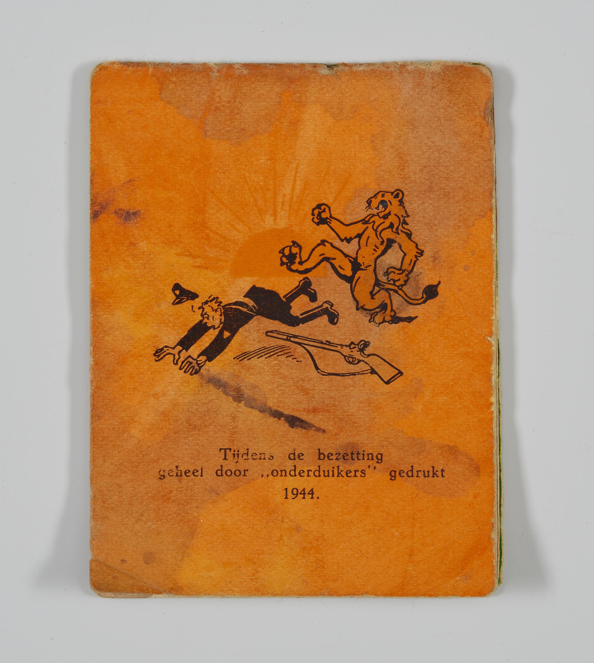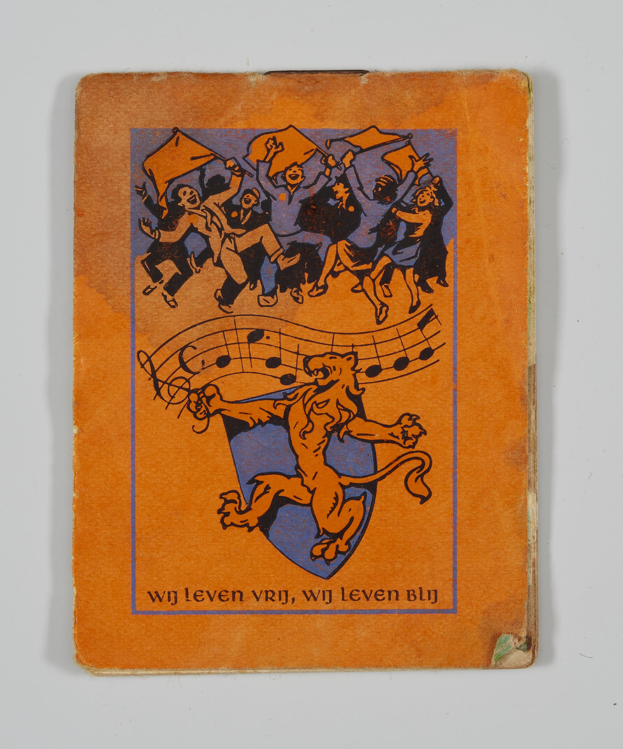 Boekje met op de voorkant een afbeelding van een dansende Nederlandse leeuw met daarboven een notenbalk en dansende mensen. In het boekje staan acht Nederlandse liederen gedrukt: het Nederlandse volkslied, Wilhelmus, Wij leven vrij, Wij willen Holland houden, Een lied van Nederland, Vlaggenlied, Marschlied en Mijn Nederland.