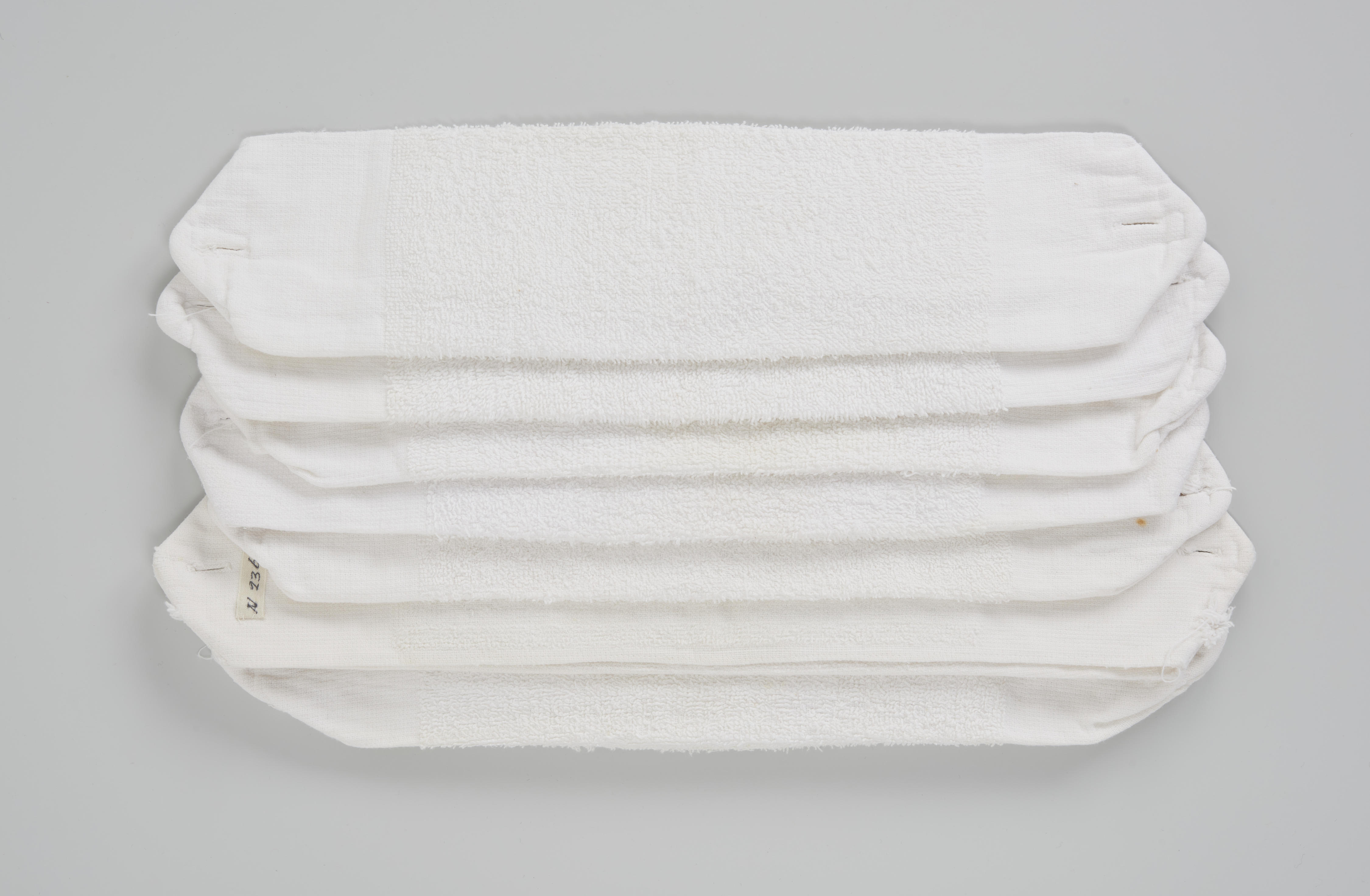 Negen stuks wasbaar maandverband van witte badstof met aan beide korte zijden een driehoekig uiteinde, waarin knoopsgaten aangebracht zijn om het maandverband aan een gordeltje te zekeren en tijdens gebruik op zijn plaats te houden.