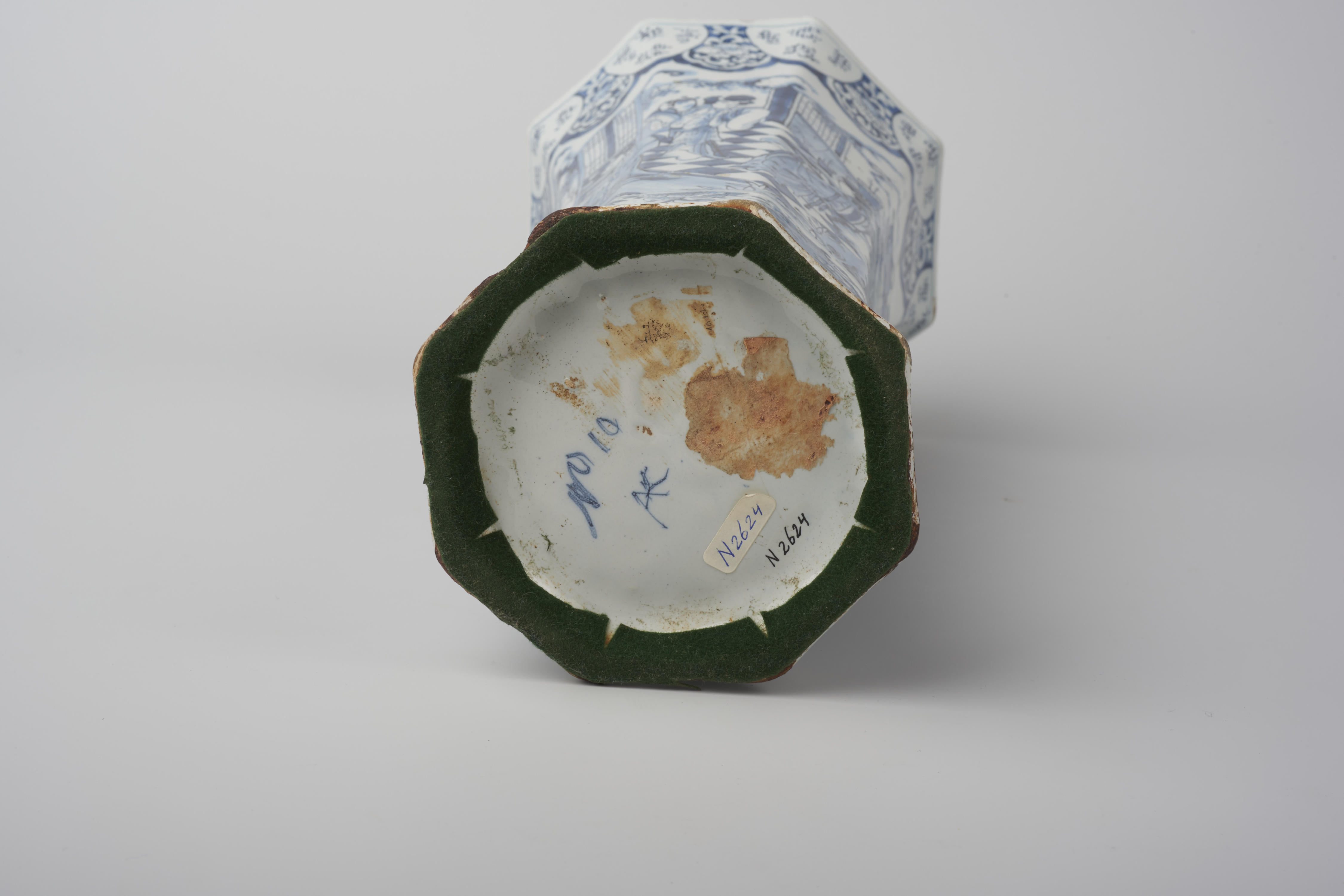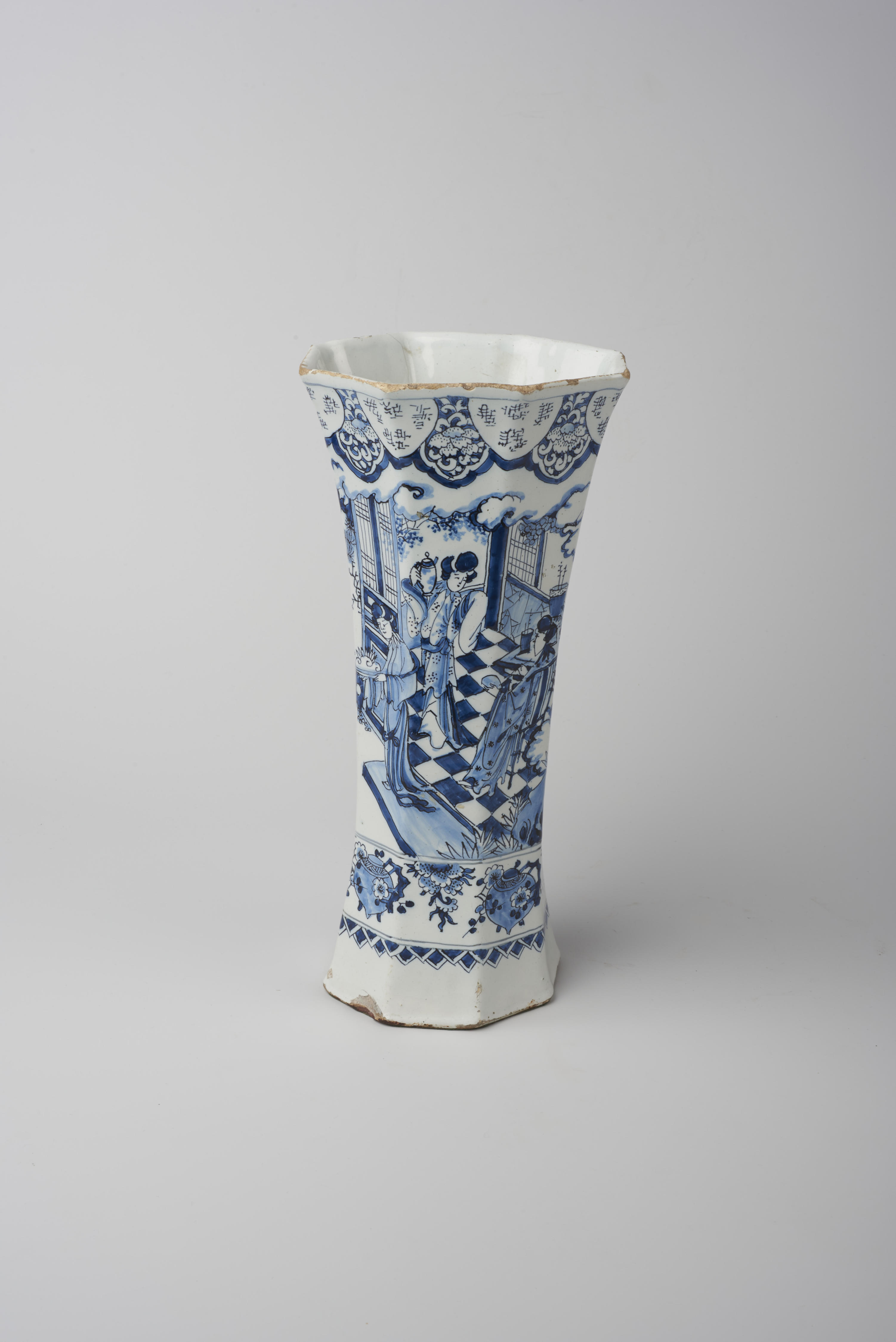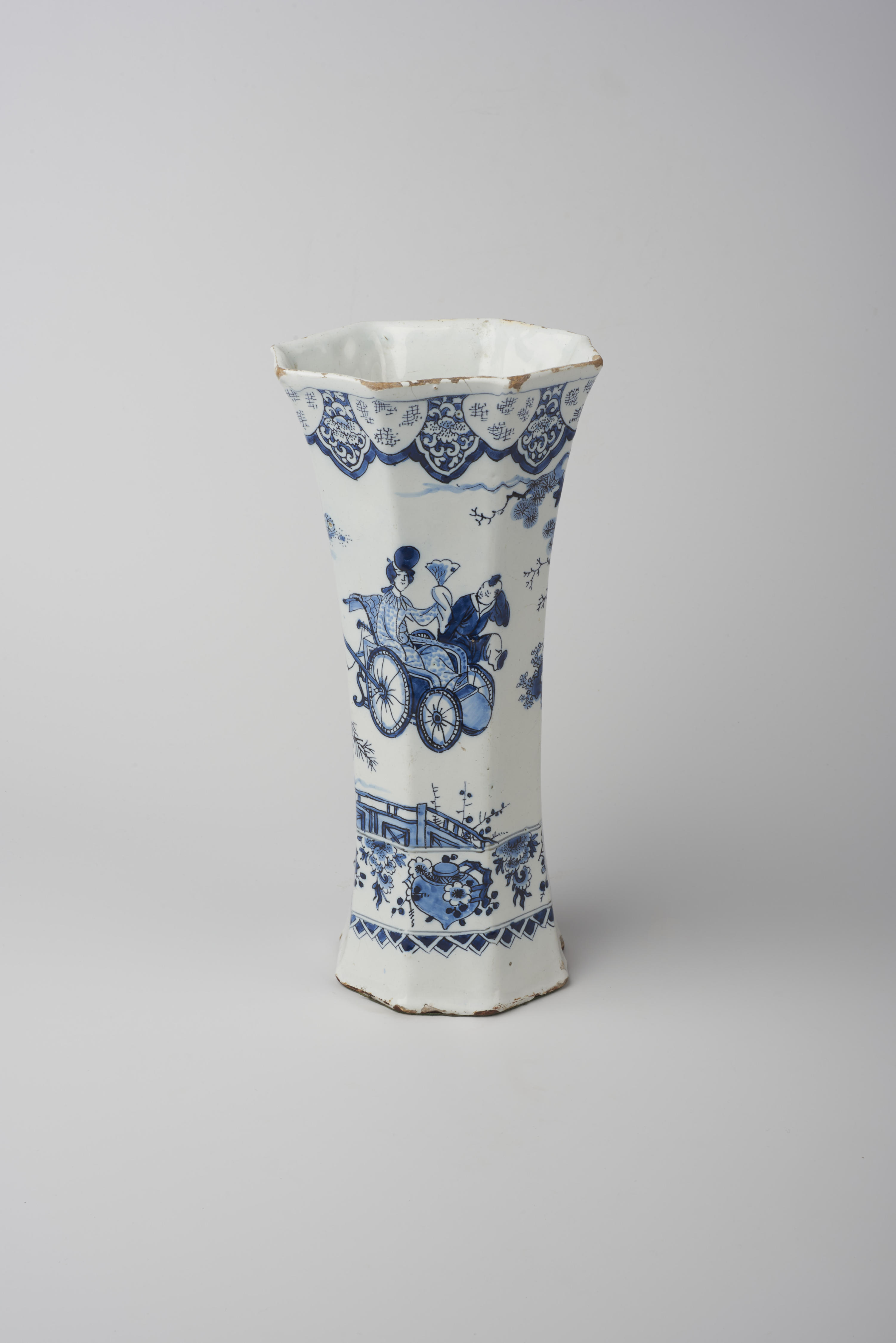 Bekervaas, oorspronkelijk onderdeel van een twee- of driedelig kaststel. De vaas heeft een chinoiserie decor, bestaande uit een vrouw in een rolwagen en een groep vrouwen in een interieur. Bovenlangs zijn cartouches met pseudo-Chinese karakters te zien, onderlangs perziken en kersenbloesem. De decoratie is een navolging van die op het blauw op wit versierde Chinese ...