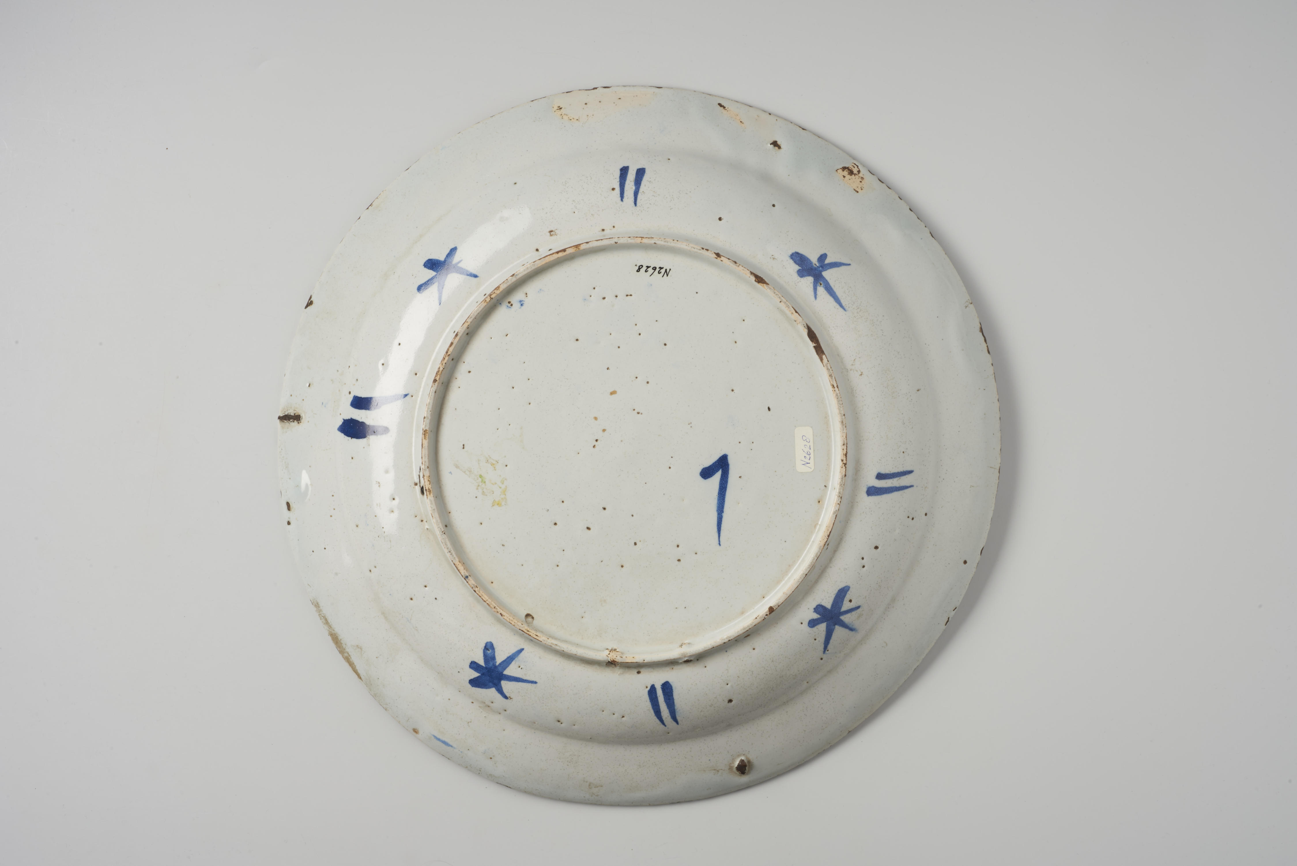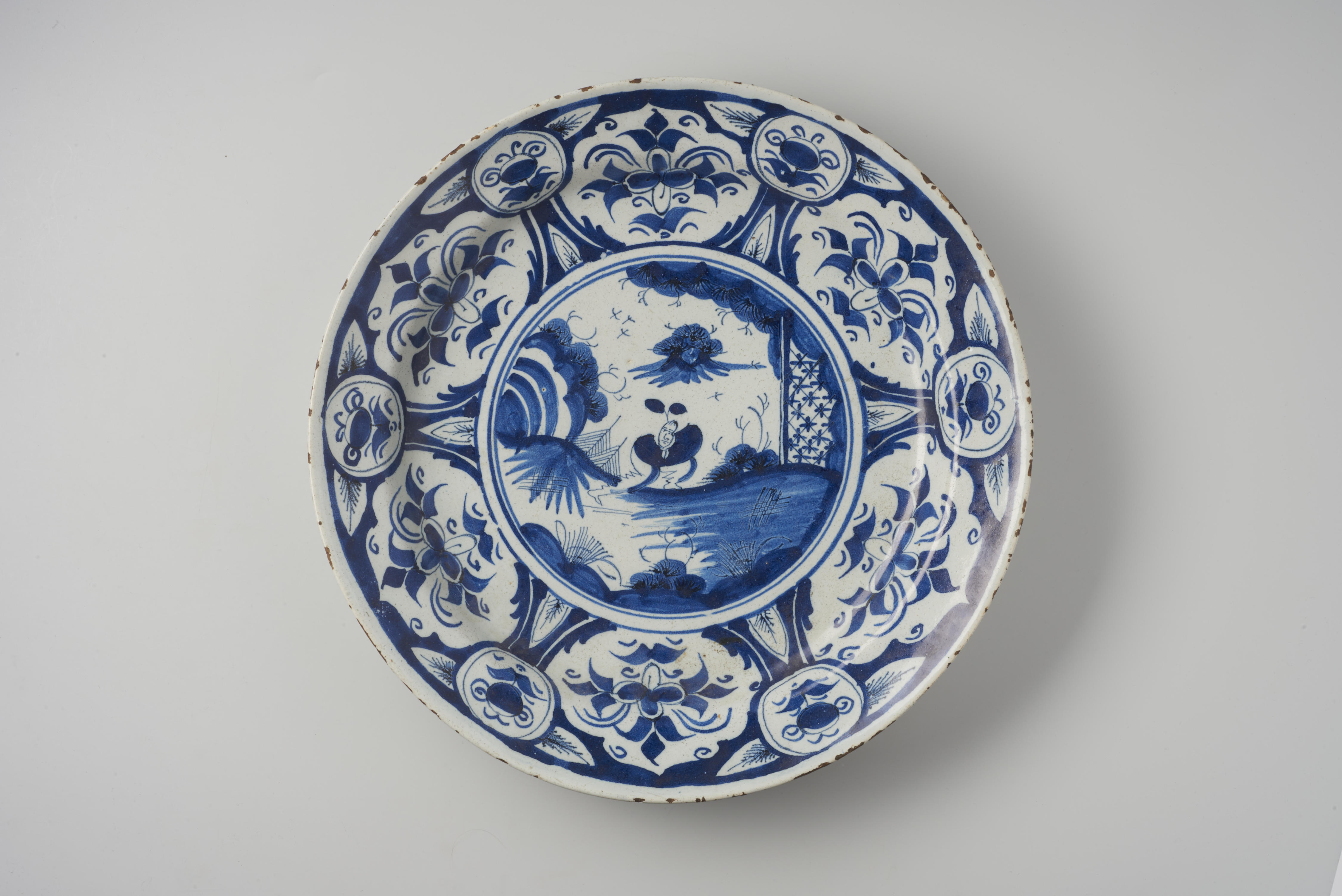 Schotel met een randversiering van gestileerde bloem- en bladmotieven. Op de keerzijde van de rand staan kruisen en strepen afgebeeld. Op het middenvlak is een voorstelling van een landschap te zien.