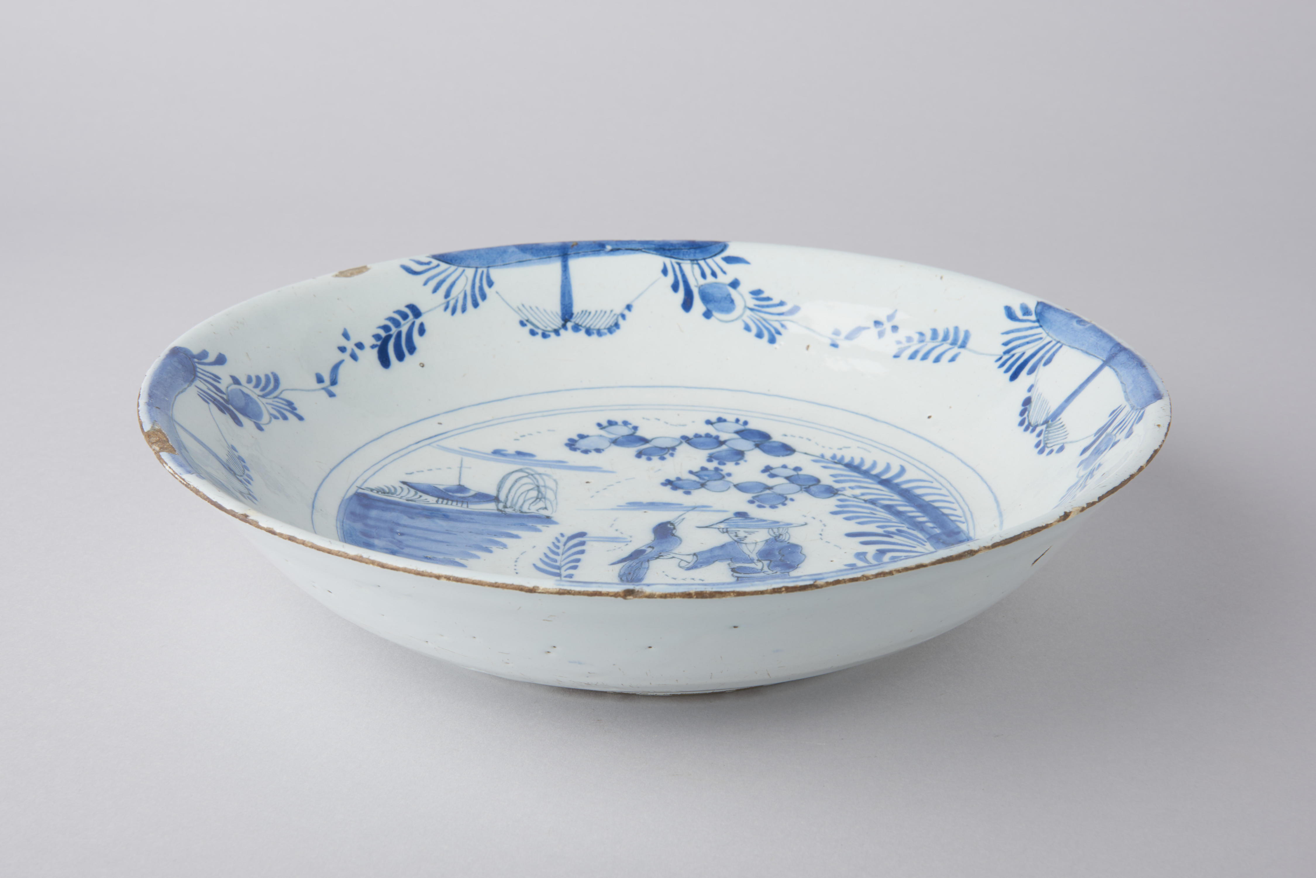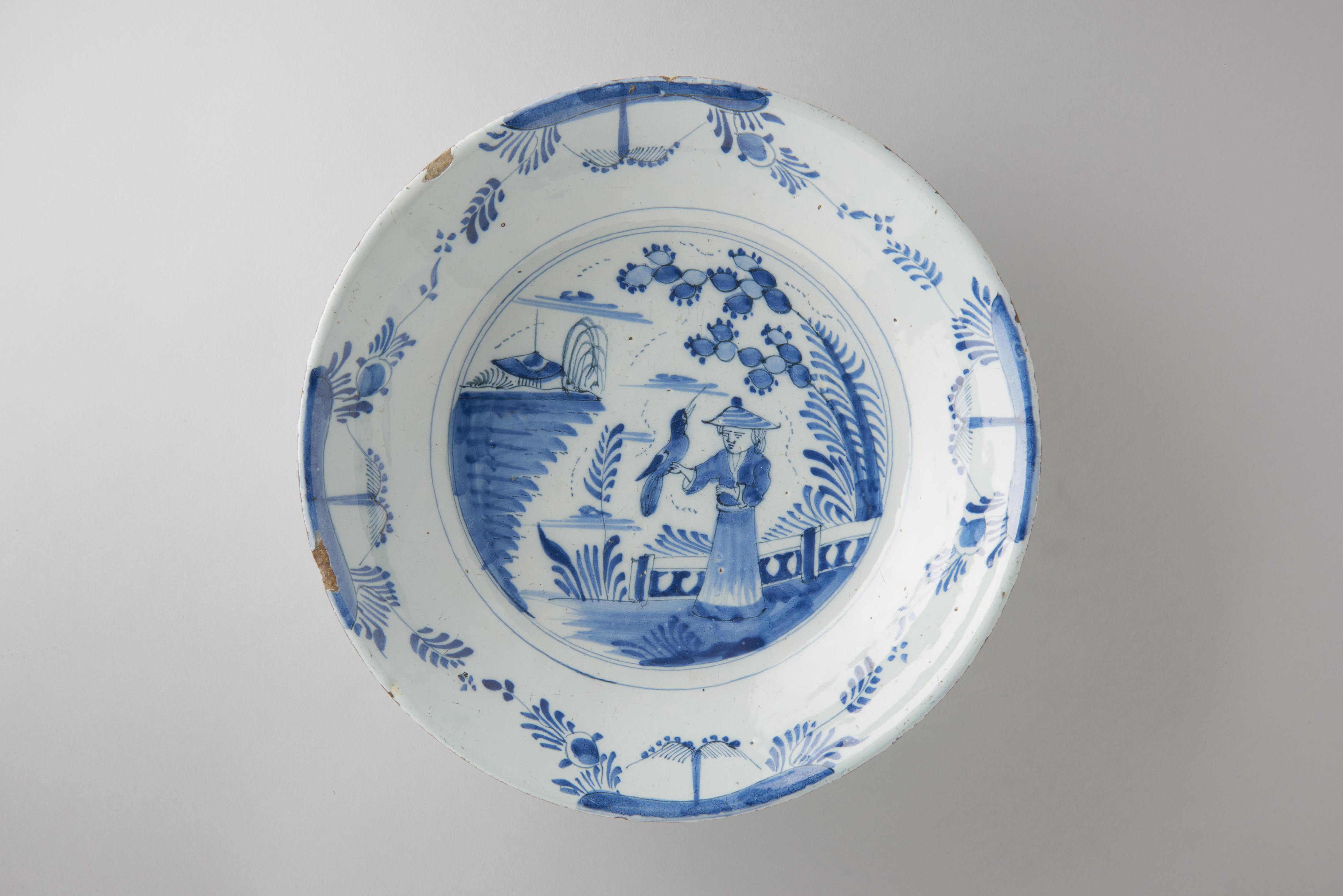 Schotel met een randversiering van gestileerde landschapjes en op het middenvlak een afbeelding van een vrouw met een vogel in een tuin.