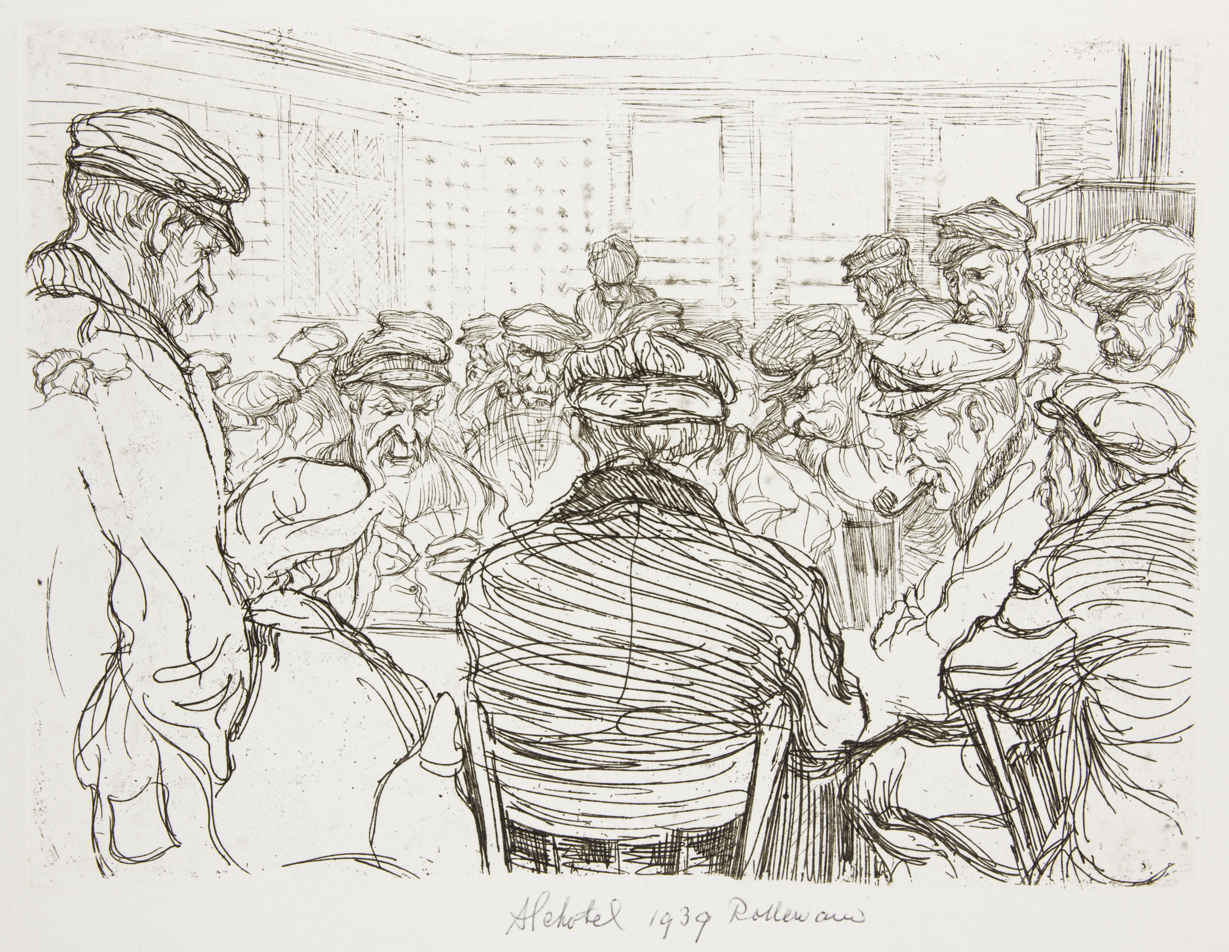 Ets van kaartspelende werklozen in een gebouw aan de Boompjes in Rotterdam in 1939. Hier kwamen ze bijeen voor of na het stempelen.