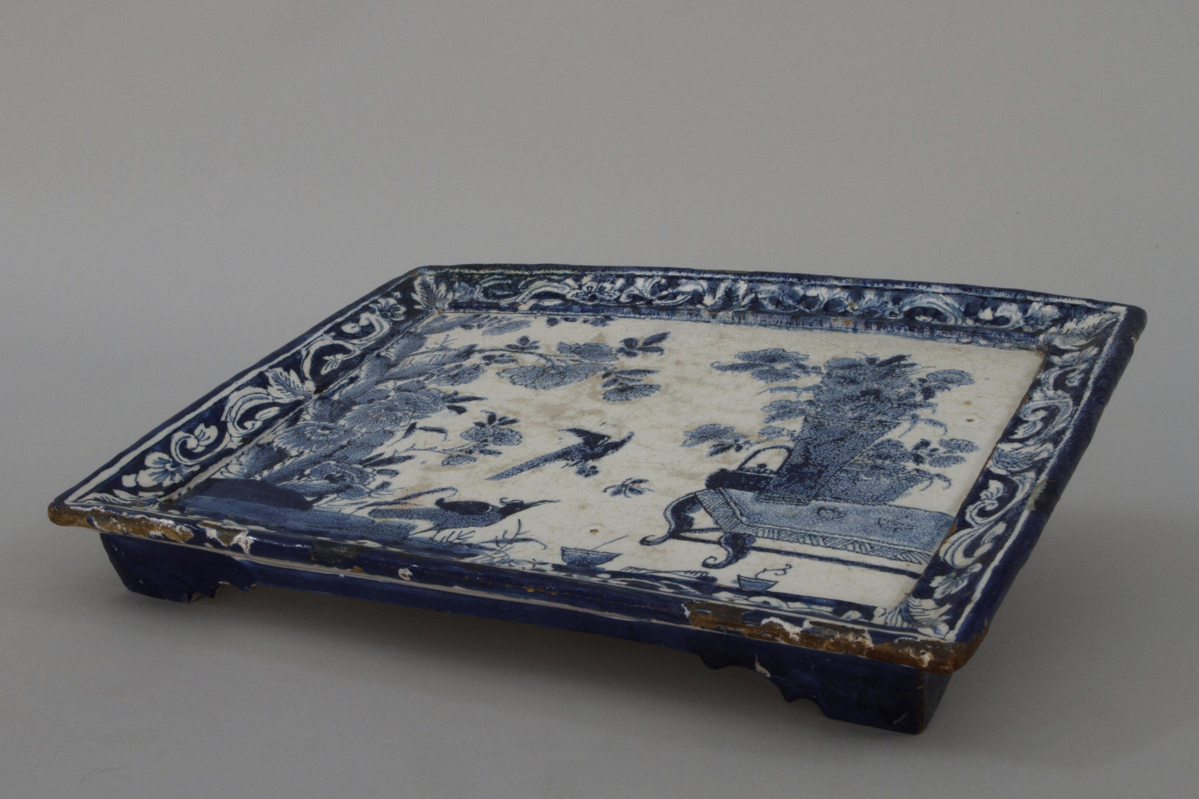 Plateau van Delfts of Amsterdams aardewerk uit de eerste helft van de achttiende eeuw. De voorstelling is ontleend aan een Chinees voorbeeld. De opstaande rand heeft bladmotieven. In het midden is een tuindecor afgebeeld met vogels, bloemen en een tafel met een theeketel. Het geheel rust op vier pootjes op de hoeken.