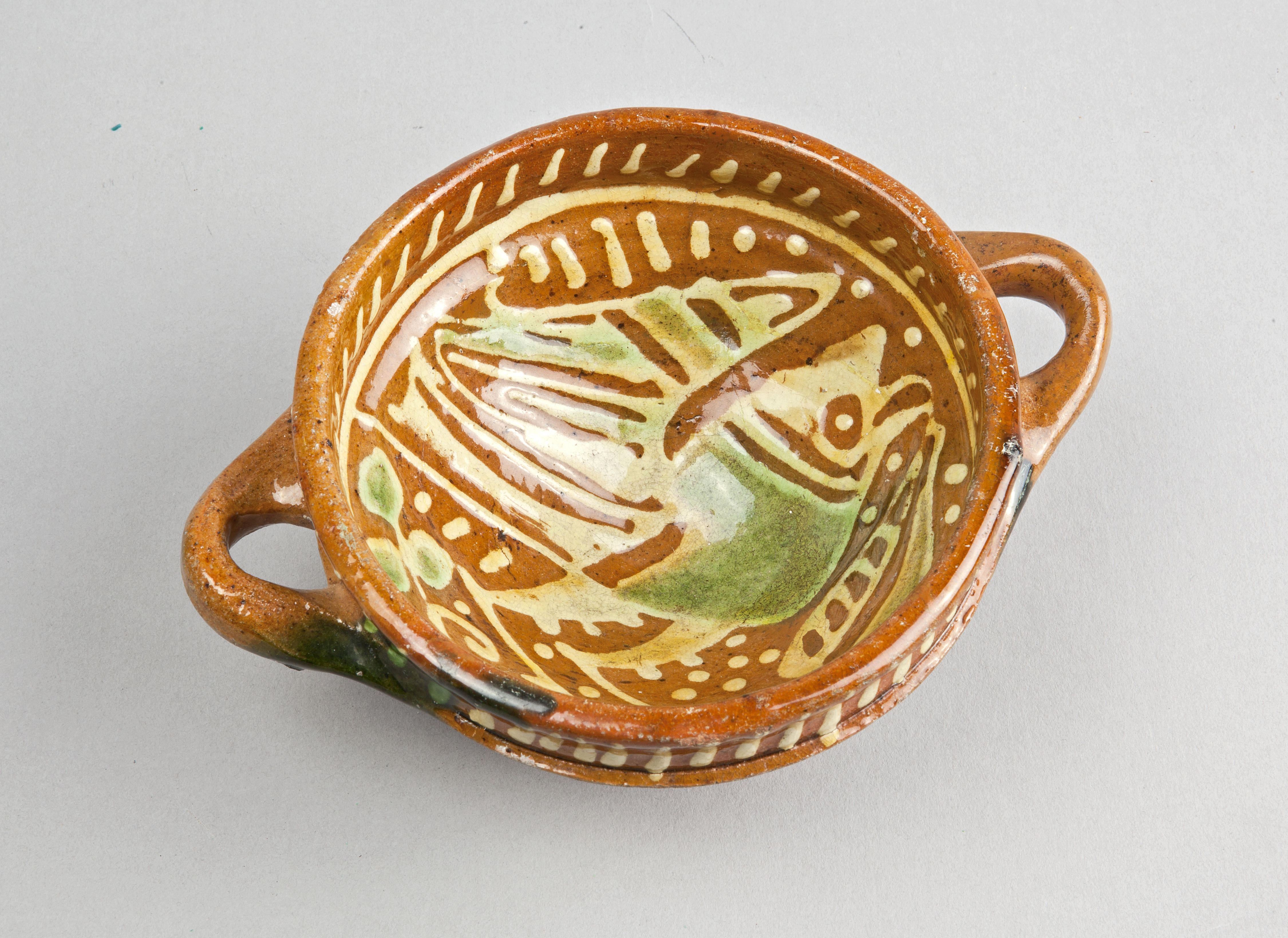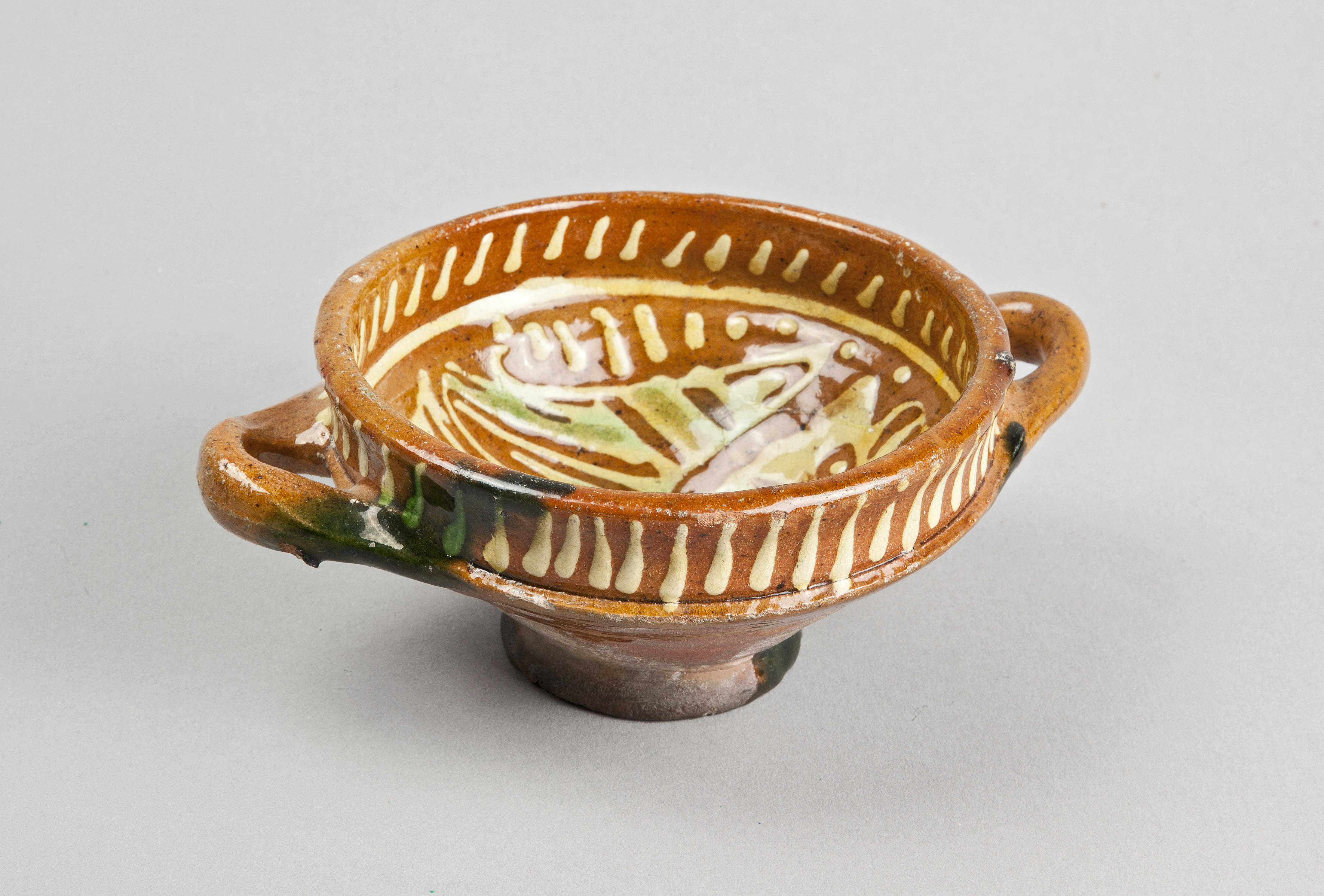 Papkom, bodemvondst in Middelburg. De kom heeft een voorstelling van een vogel, een klaverblad en een bloemknop of peul.