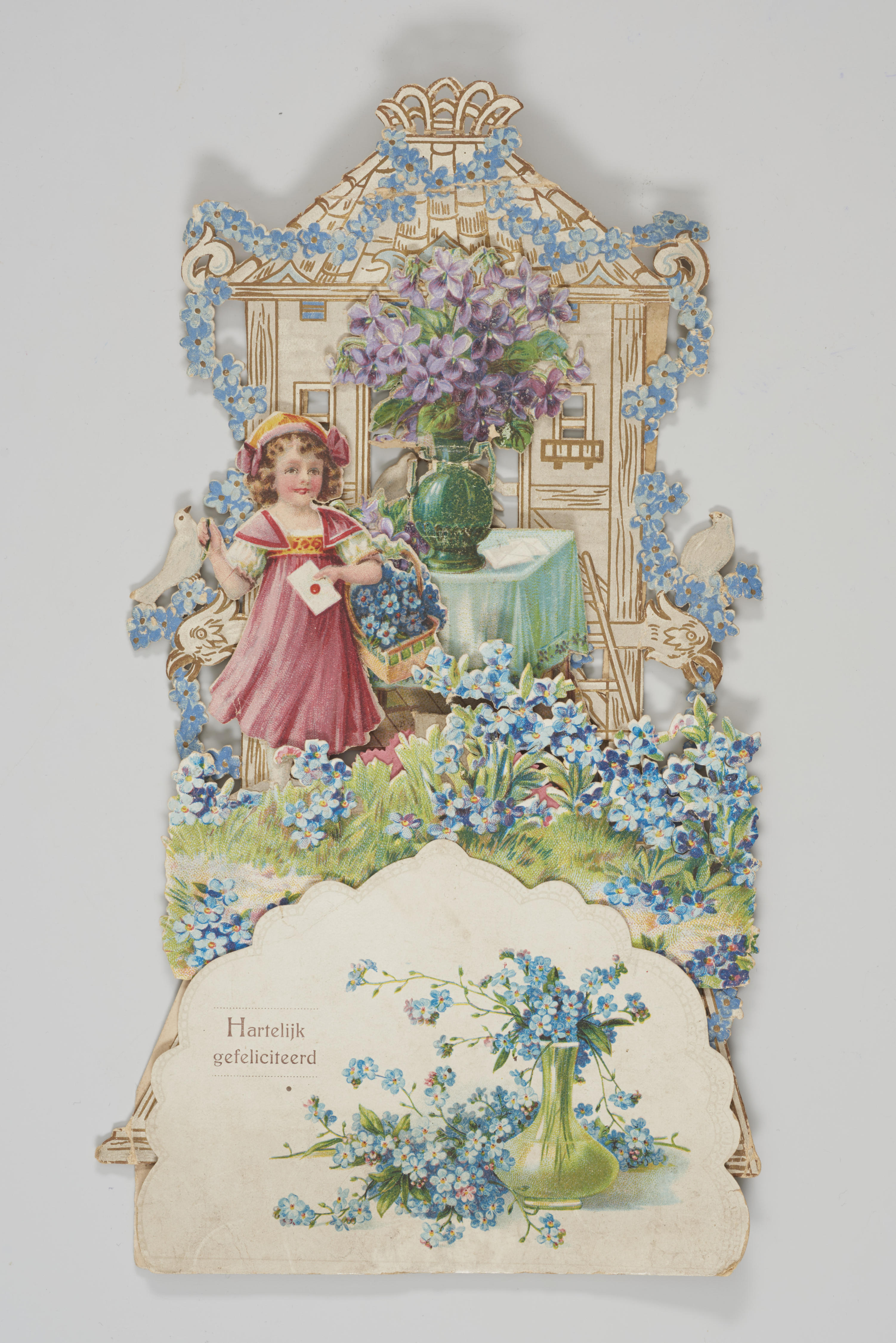 Wenskaart, geschonken aan Marinus Paardekooper en Suzanna Bos ter gelegenheid van hun bruiloft op 12 juni 1935. Marinus en Suzanna trouwden in Nisse, Zeeland. Het opschrift op de kaart luidt: 'Hartelijk gefeliciteerd'.