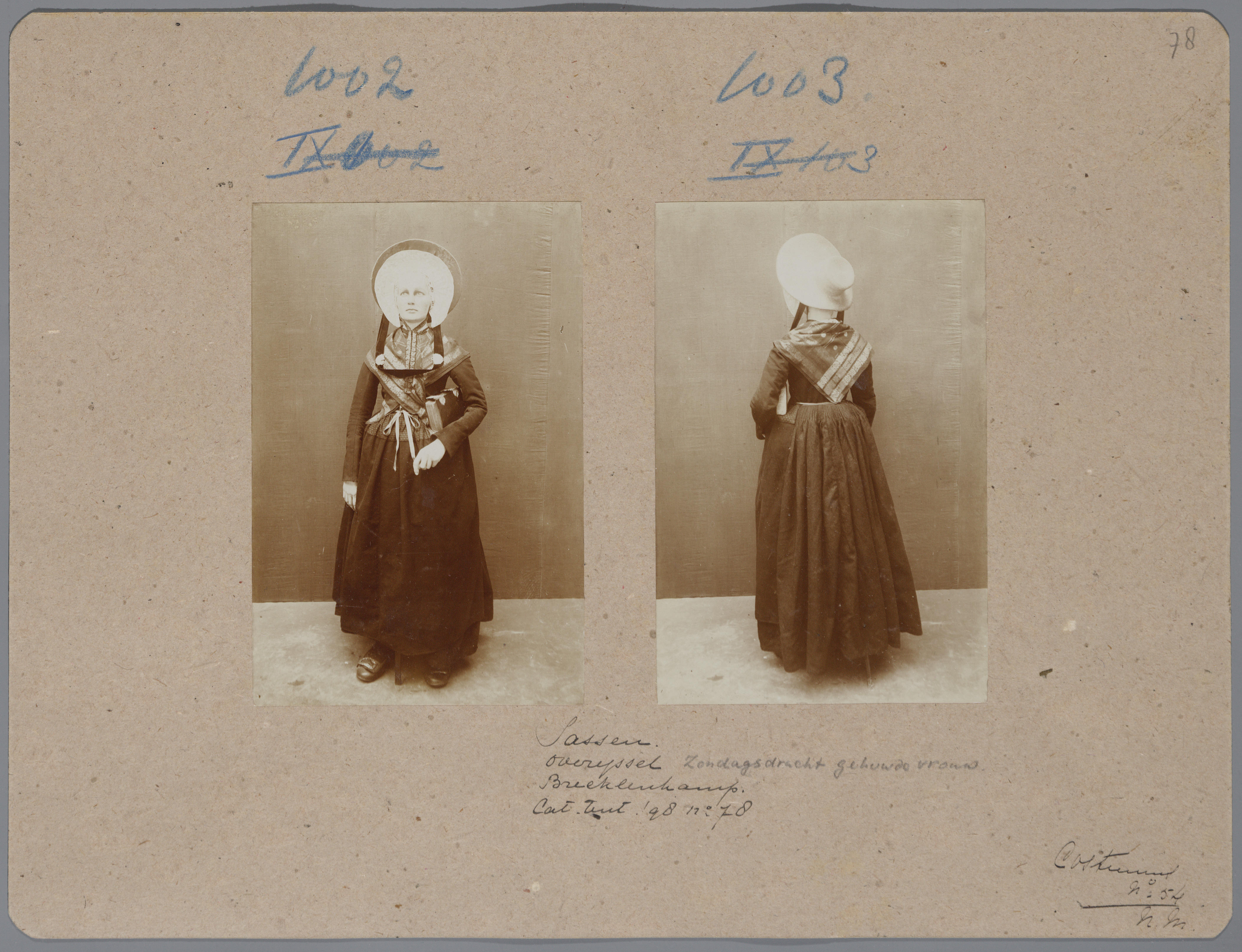 Karton met daarop twee foto's van een pop in het kostuum van een gehuwde vrouw uit Breklenkamp, die op de tentoonstelling Nationale Kleederdrachten van Harer Majesteits onderdanen in 1898 in Amsterdam werd getoond en aantekeningen die verwijzen naar de catalogus. De bijbehorende catalogustekst luidt: ‘De witte doek wordt uitsluitend door gehuwden gedragen.’