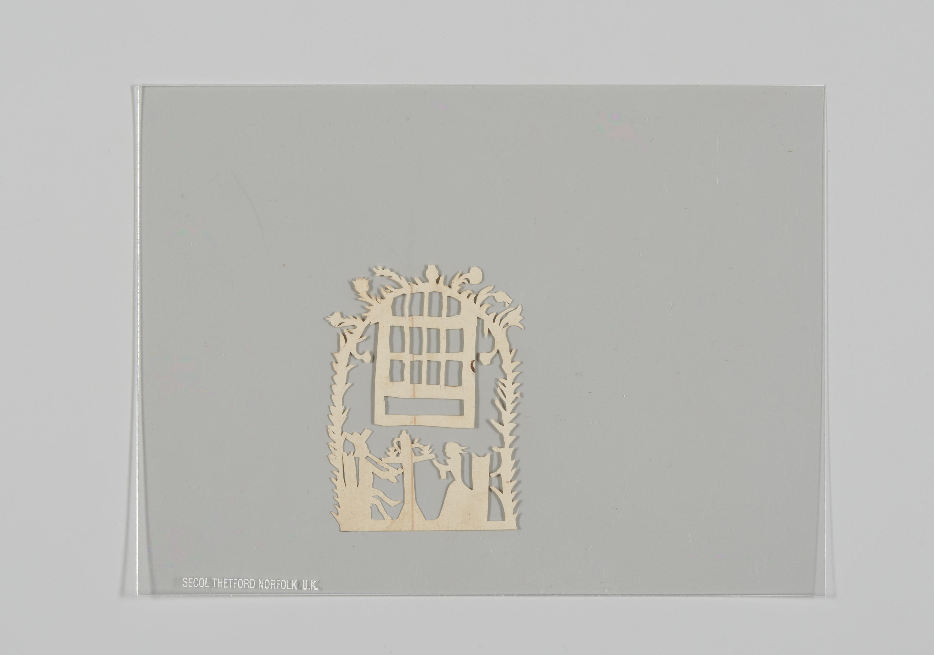 Knipsel van een theedrinkend paar in een versierde koepel. De man rookt een pijp en de vrouw leest een boek.