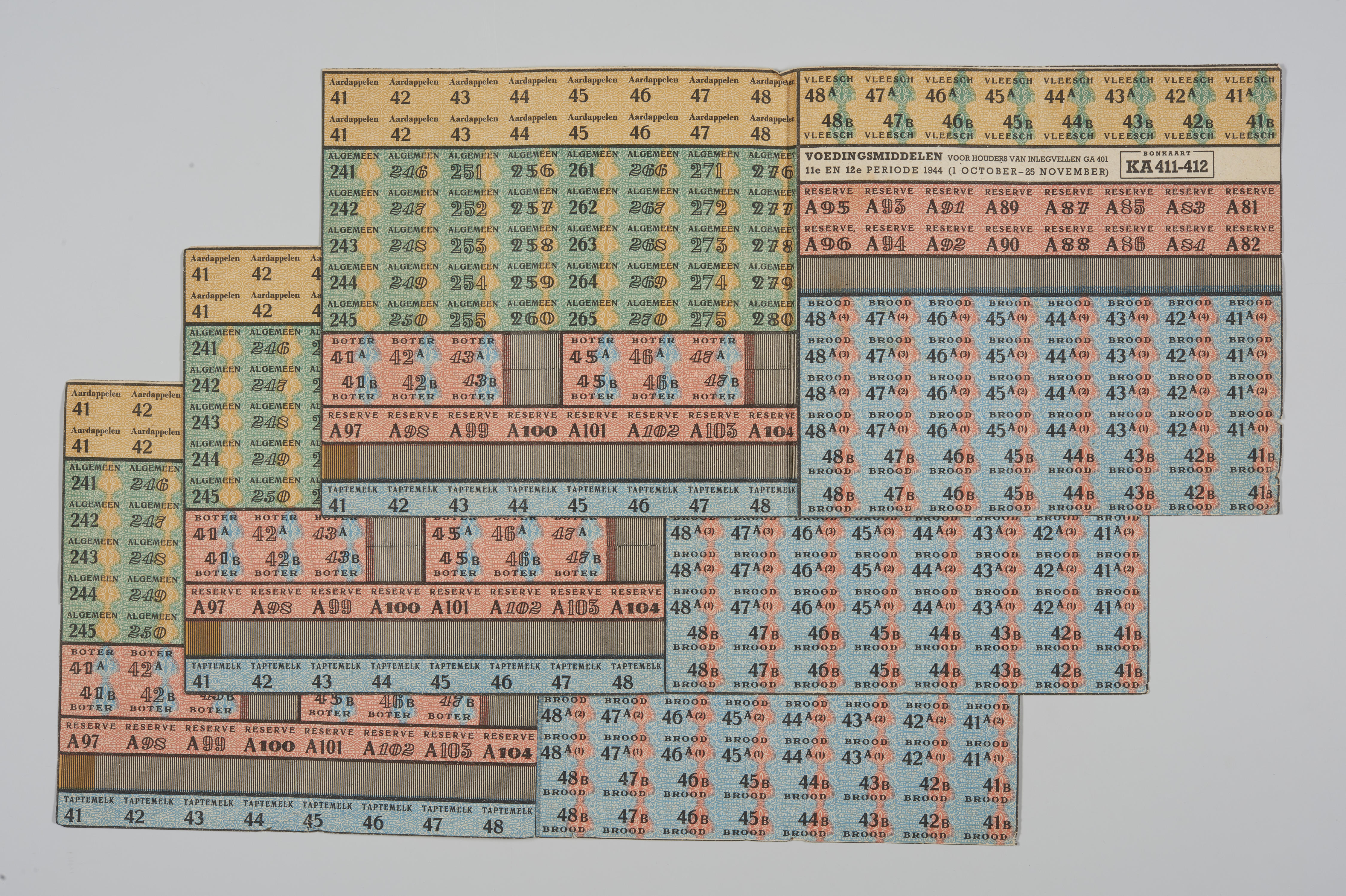 Drie bonnenkaarten voor voedingsmiddelen, waaronder brood, vlees en aardappelen. De bonnen waren te gebruiken tussen 1 oktober en 25 november 1944.