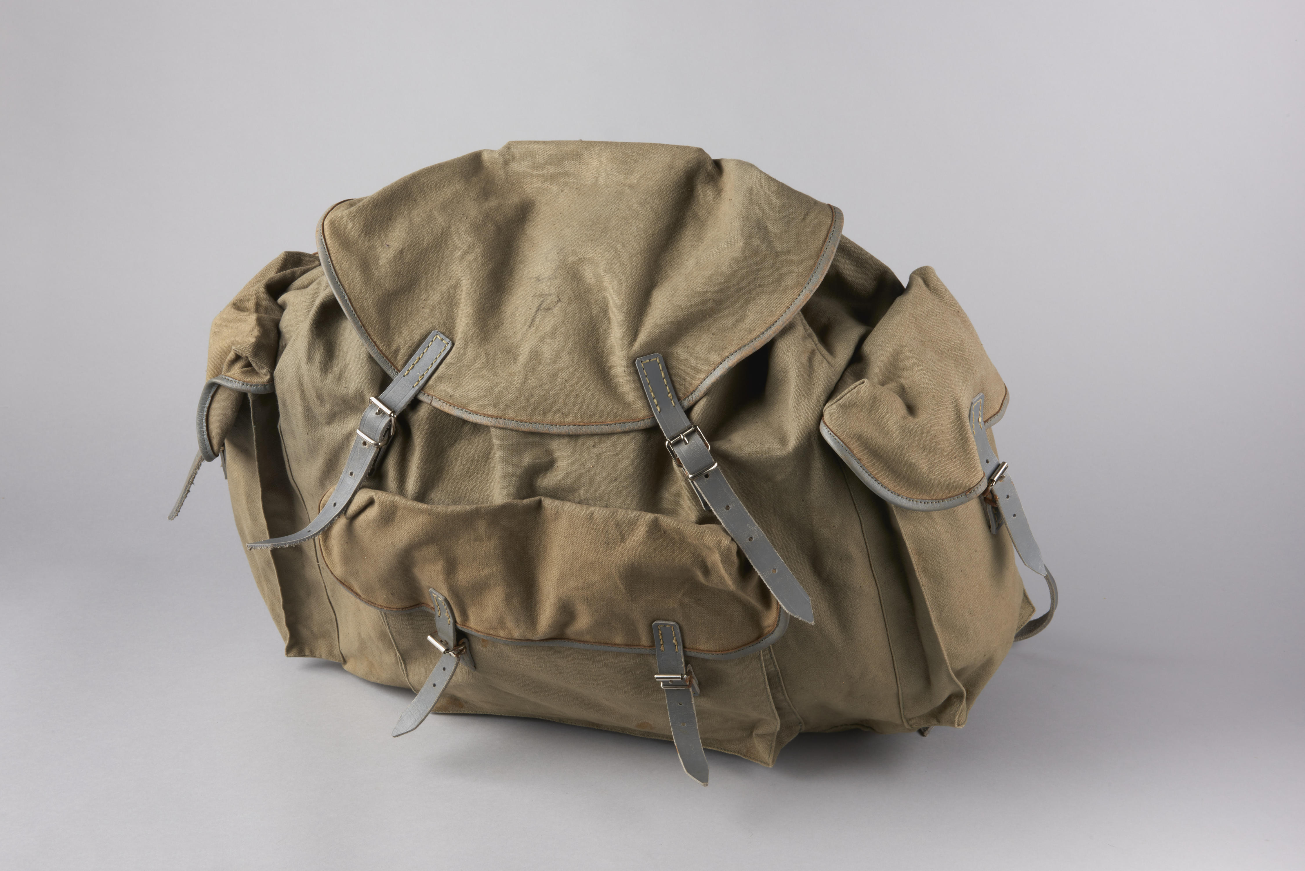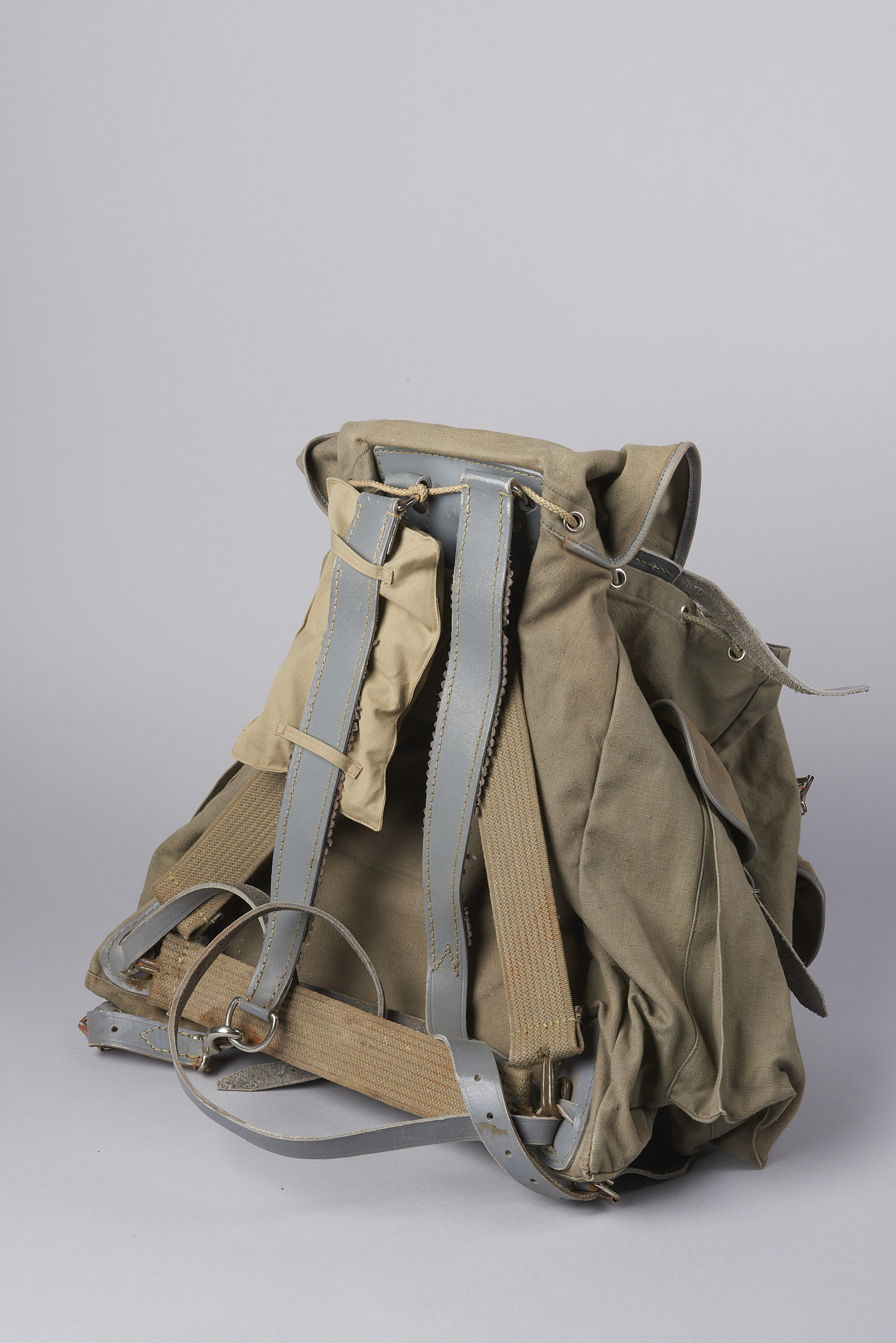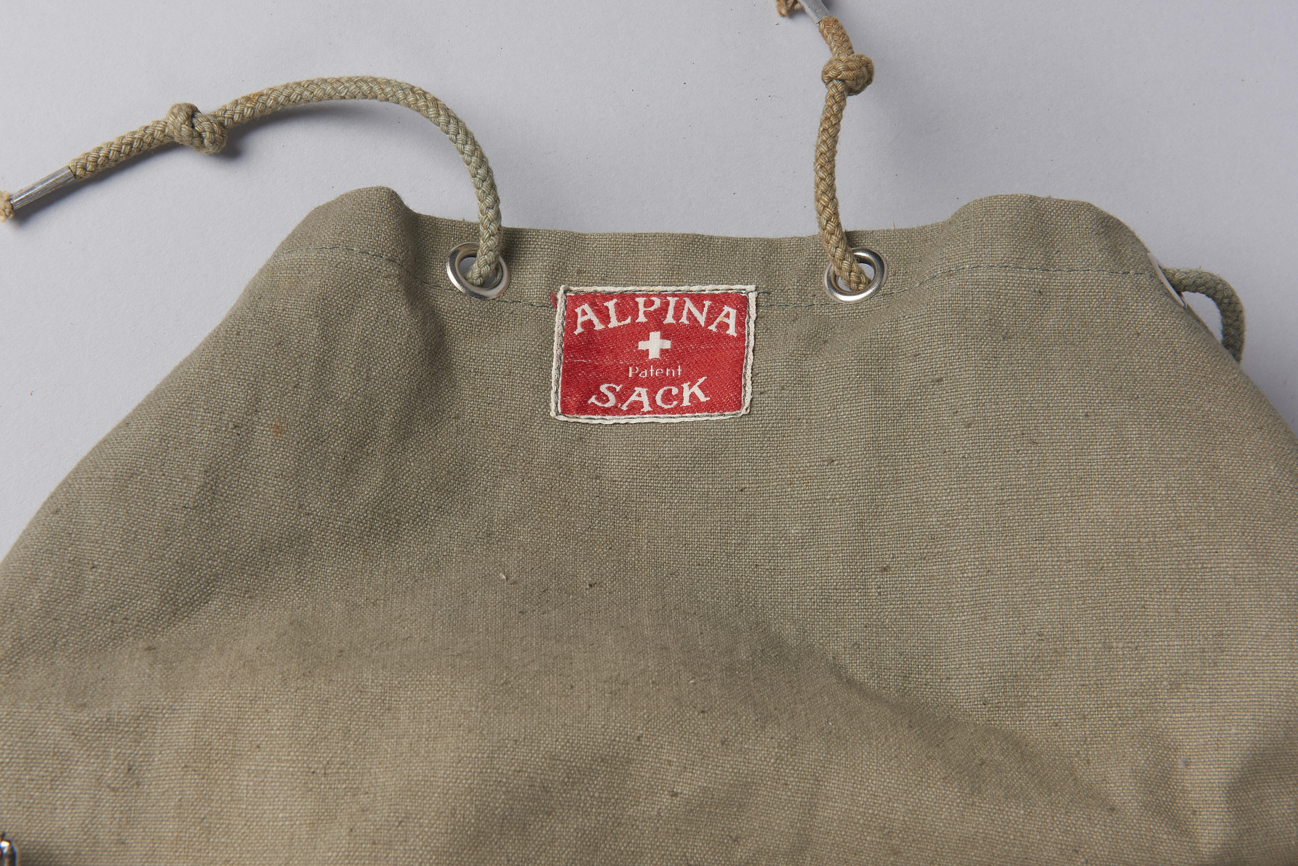 Bruine rugzak met leren riemen en een grijsblauw ijzeren draagstel. Op de klep is met pen de letter 'P' geschreven. Deze letter staat voor de naam 'Paul'. De schoudersteun wordt om de leren riemen geschoven. Middenvoor op de tas zelf, onder de koordsluiting, is een rood etiket te zien met de tekst ‘Alpina, patent Sack’.