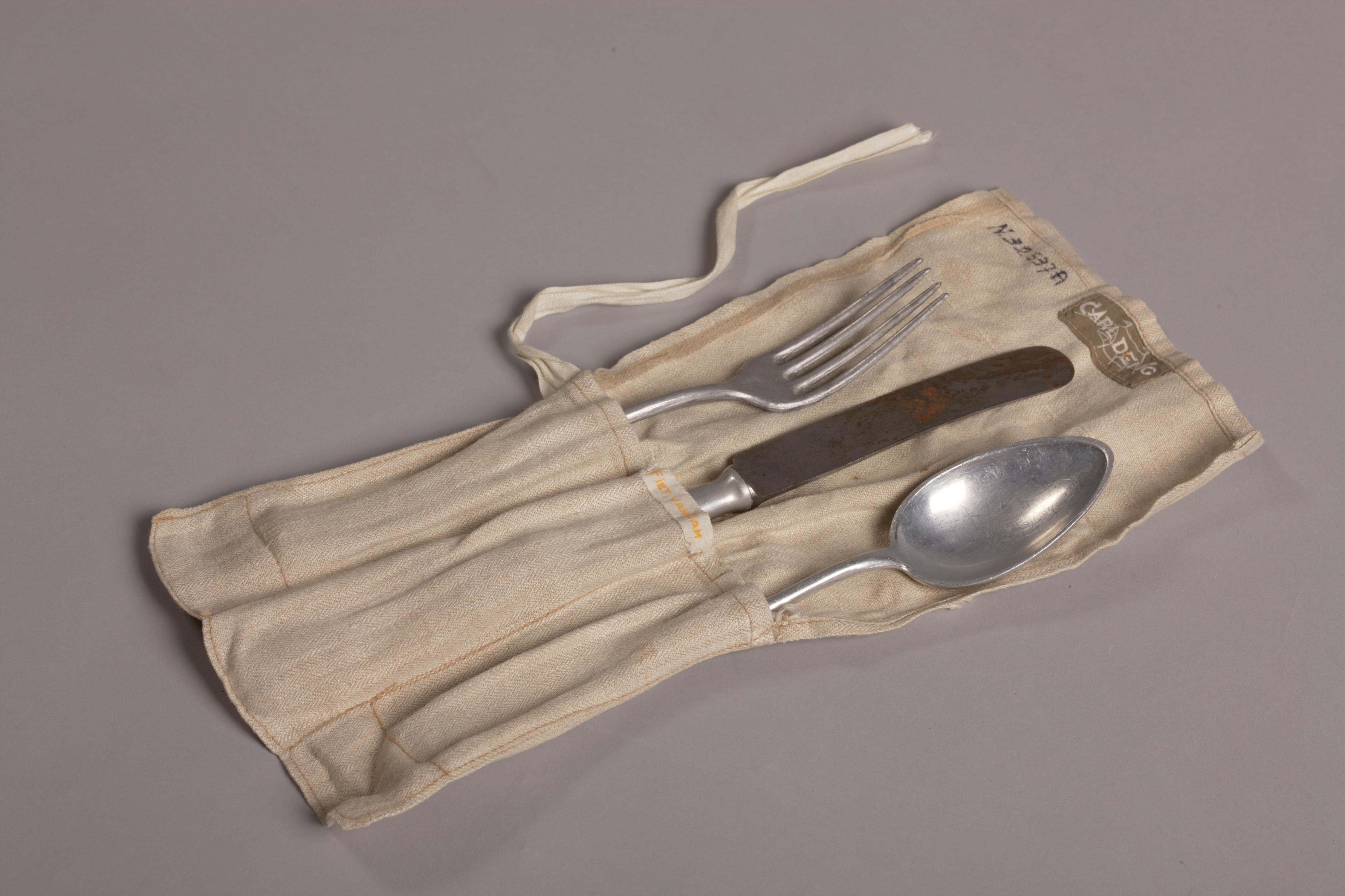 Het beige foedraaltje van het merk 'Carl Denig' is gemaakt van katoen in keperbinding met een linnen sluitbandje. Aan de binnenzijde bevindt zich een wasmerkje met de naam 'Hans van Dam'. Dit is de bijnaam van Johanna van Dam. Het foedraal is van 1936, maar de vork, lepel en het mes die erin zitten zijn ...