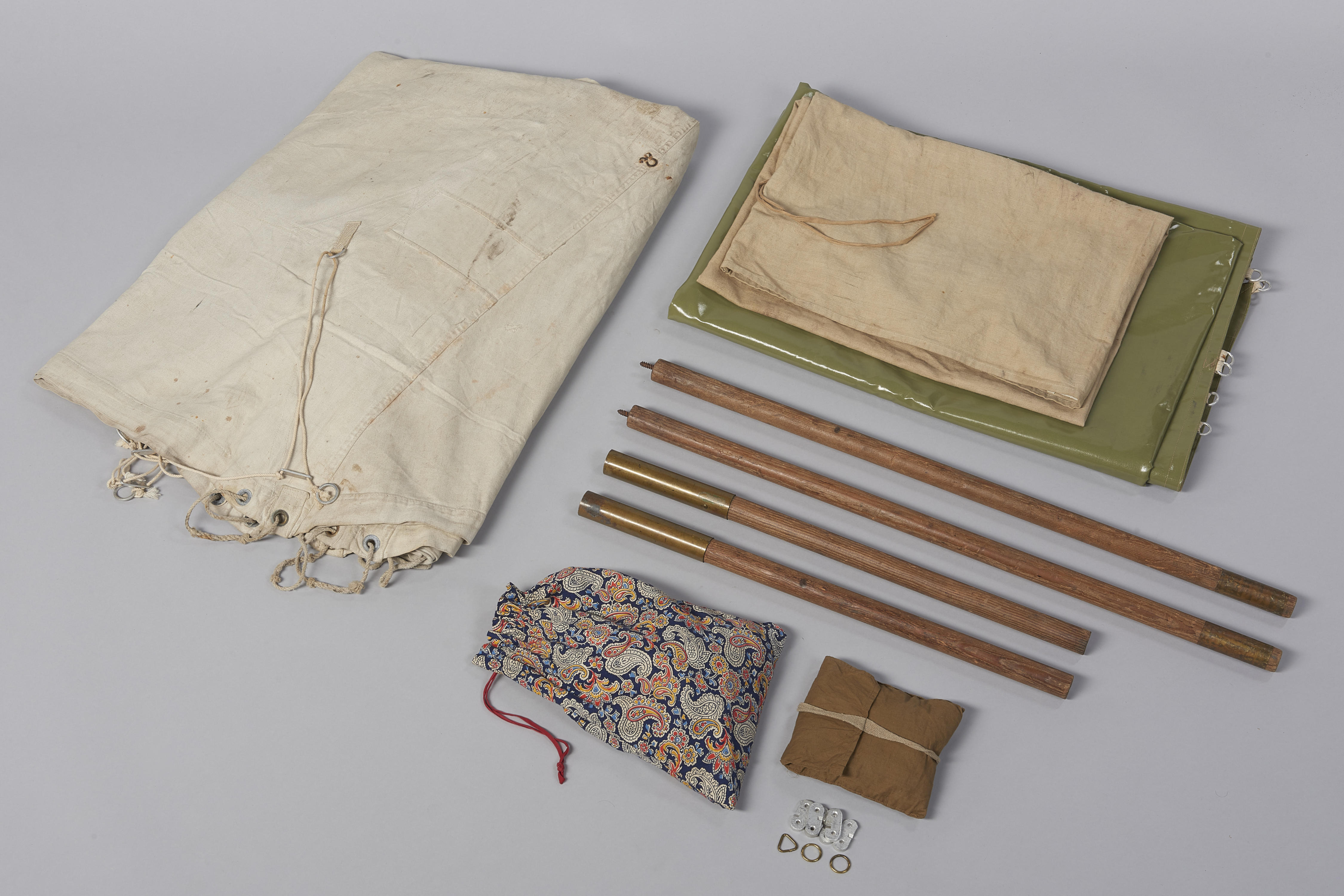 De witgrijze katoenen tent heeft een groen, los onderzeil en twee tweedelige houten stokken. Deze worden in elkaar geschoven door middel van koperen hulzen. Er zit een katoenen zakje bij met daarin haringen en scheerlijnen.